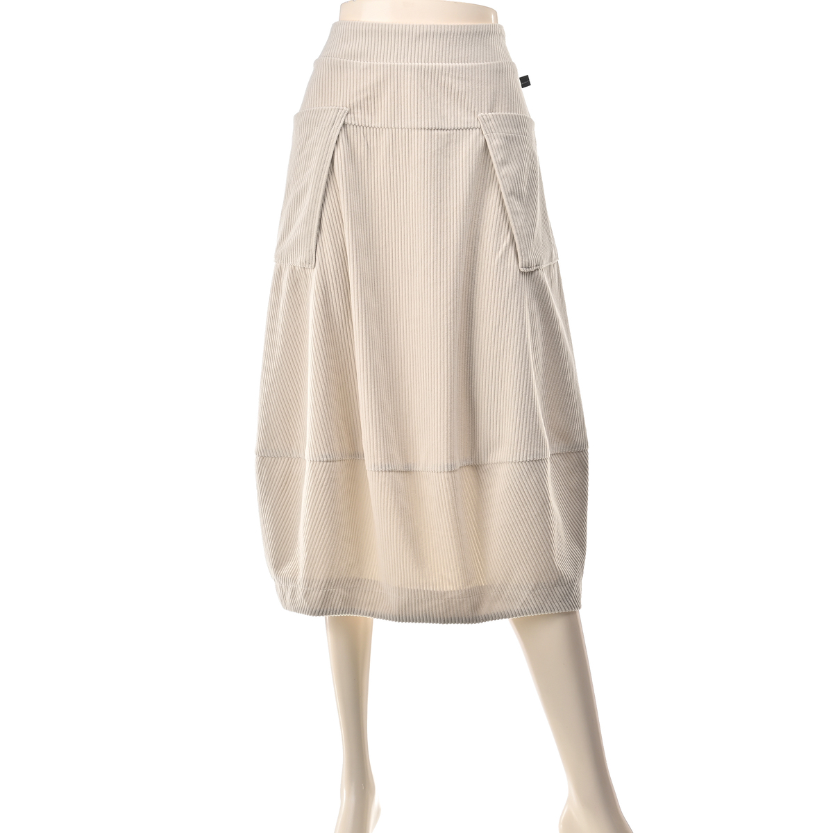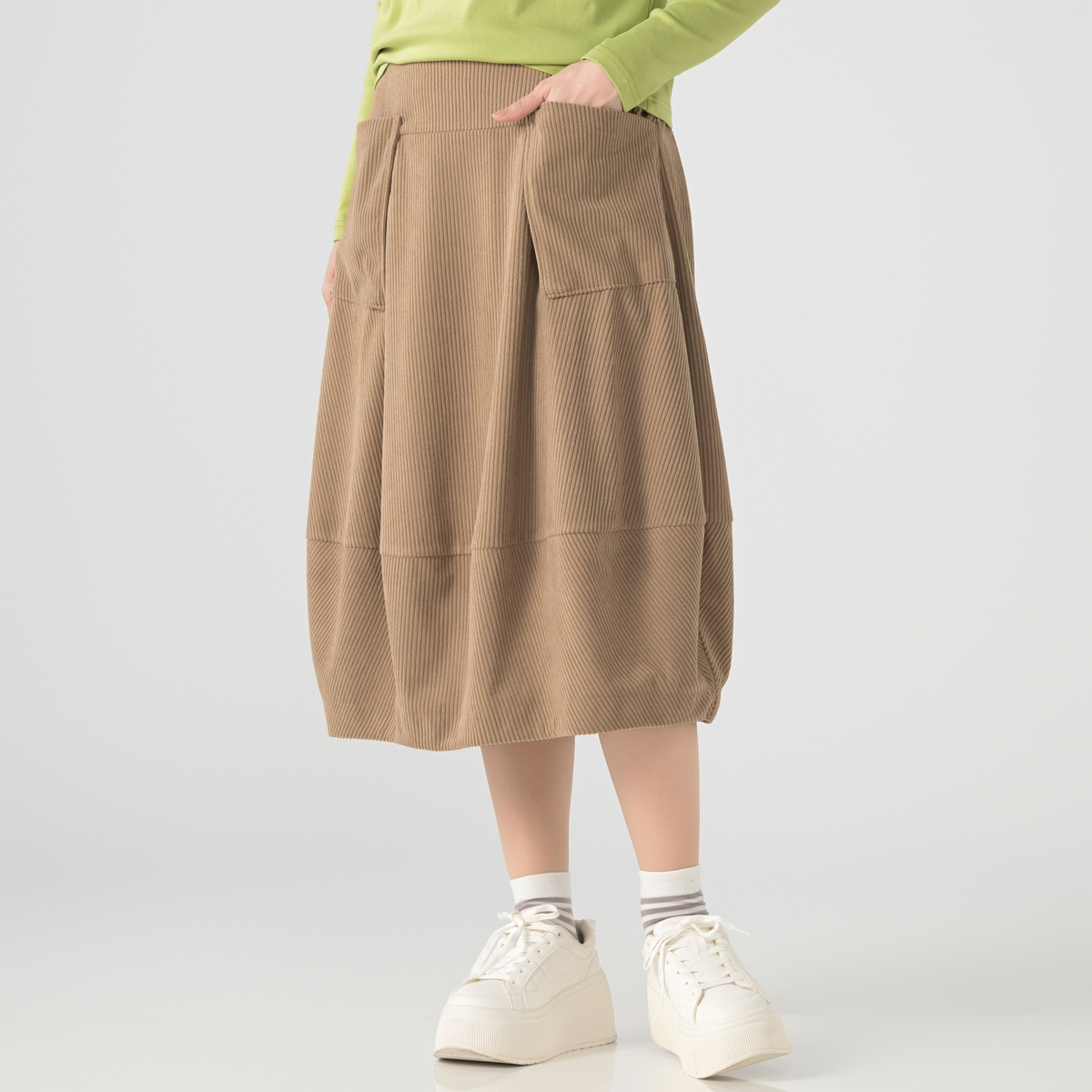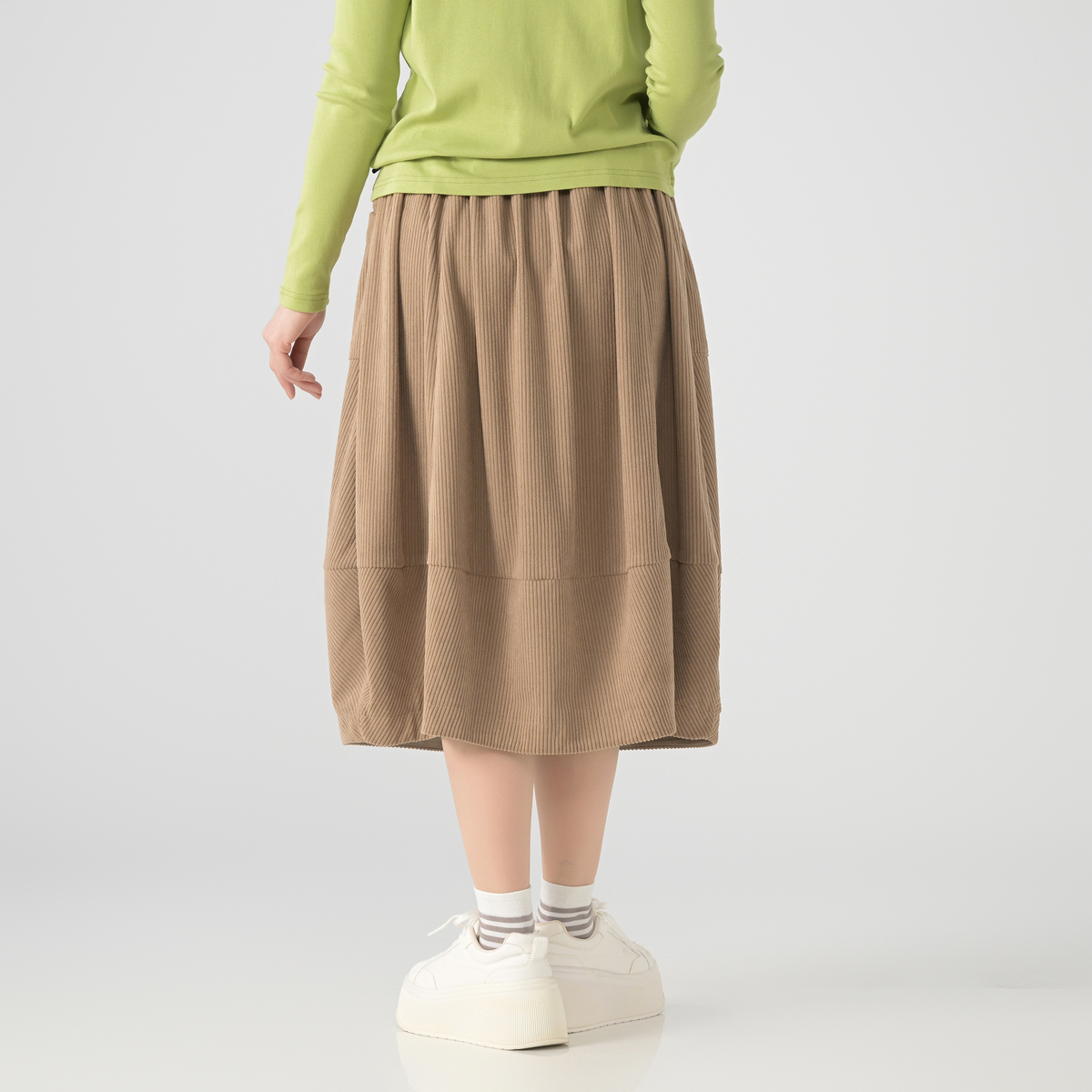 立体的なフォルムのスカート。程よい肉感のコーデュロイ素材で、体が入ることでコクーンシルエットの丸みがきれいに際立ちます。前はすっきりとした仕立てでトップスを合わせやすく、後ろは全体ゴム仕様で穿き心地も快適。左右前にはポケットも備えています