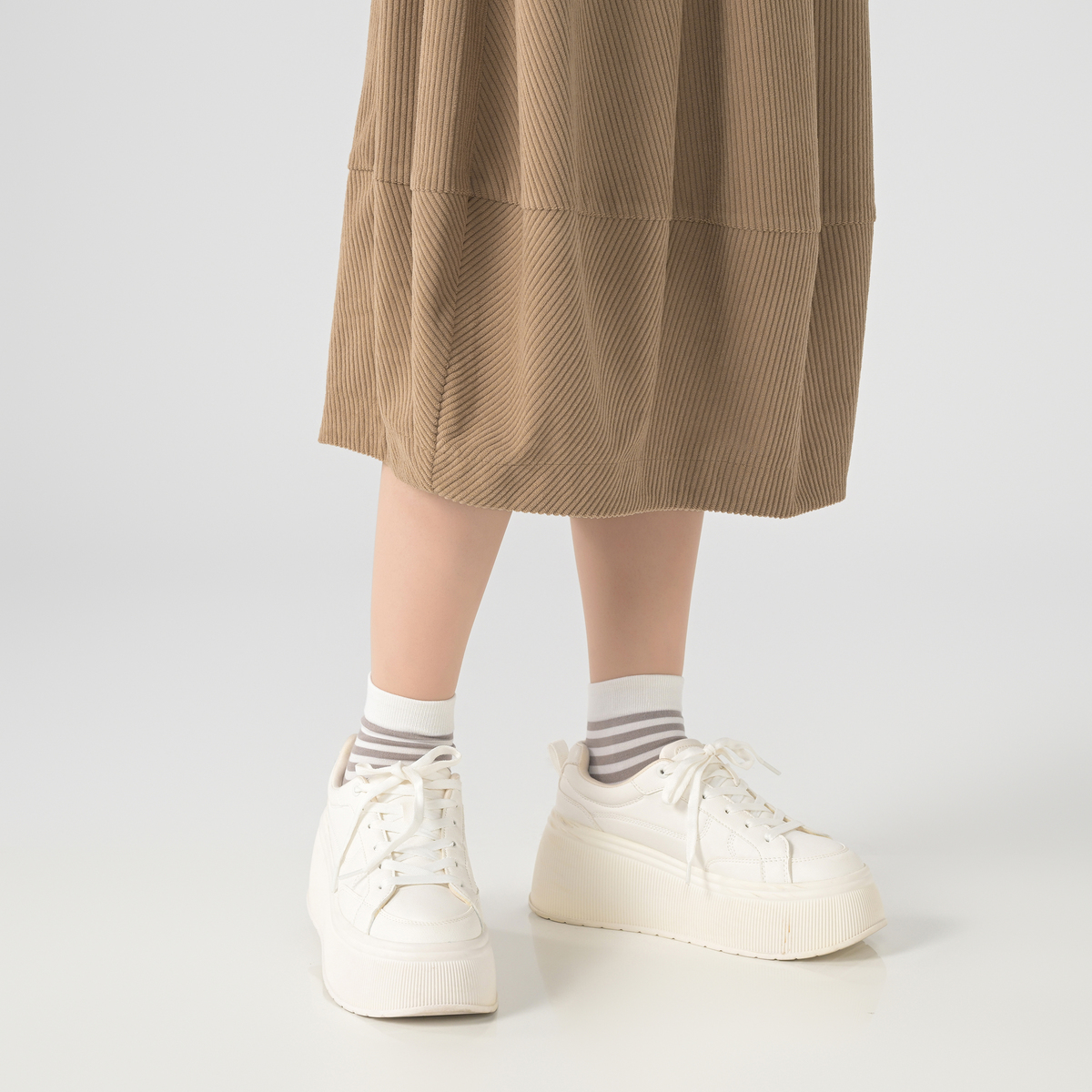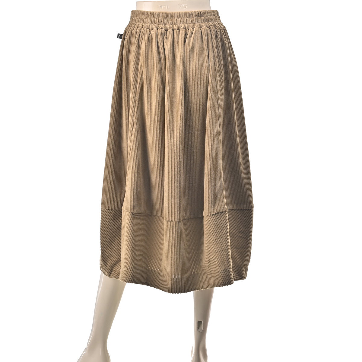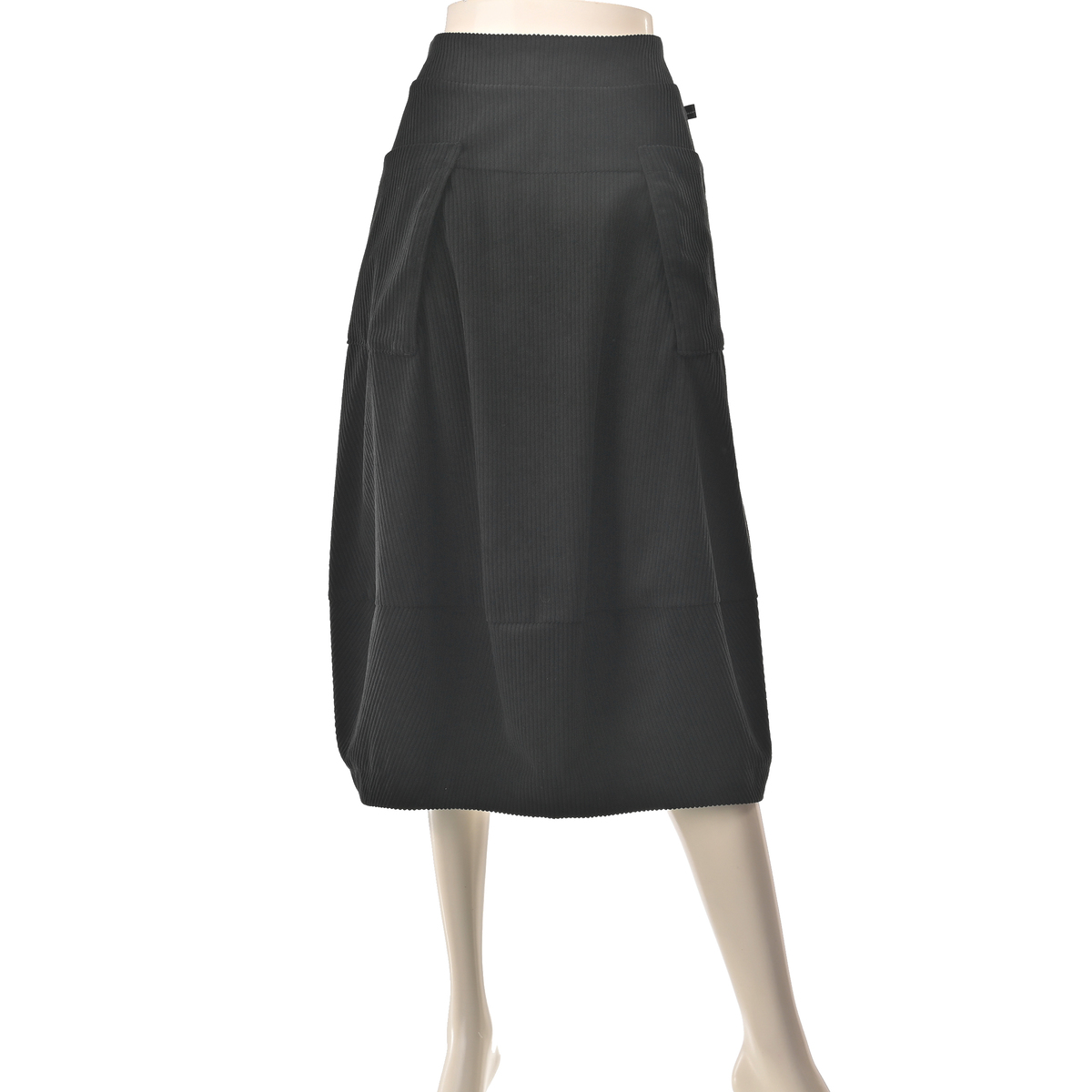 立体的なフォルムのスカート。程よい肉感のコーデュロイ素材で、体が入ることでコクーンシルエットの丸みがきれいに際立ちます。前はすっきりとした仕立てでトップスを合わせやすく、後ろは全体ゴム仕様で穿き心地も快適。左右前にはポケットも備えています