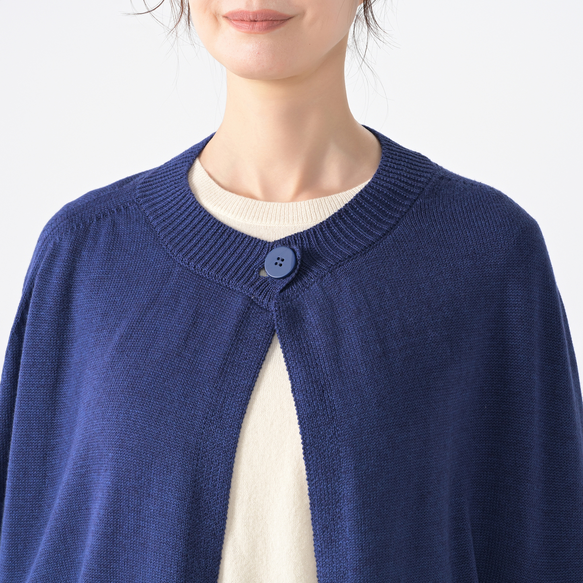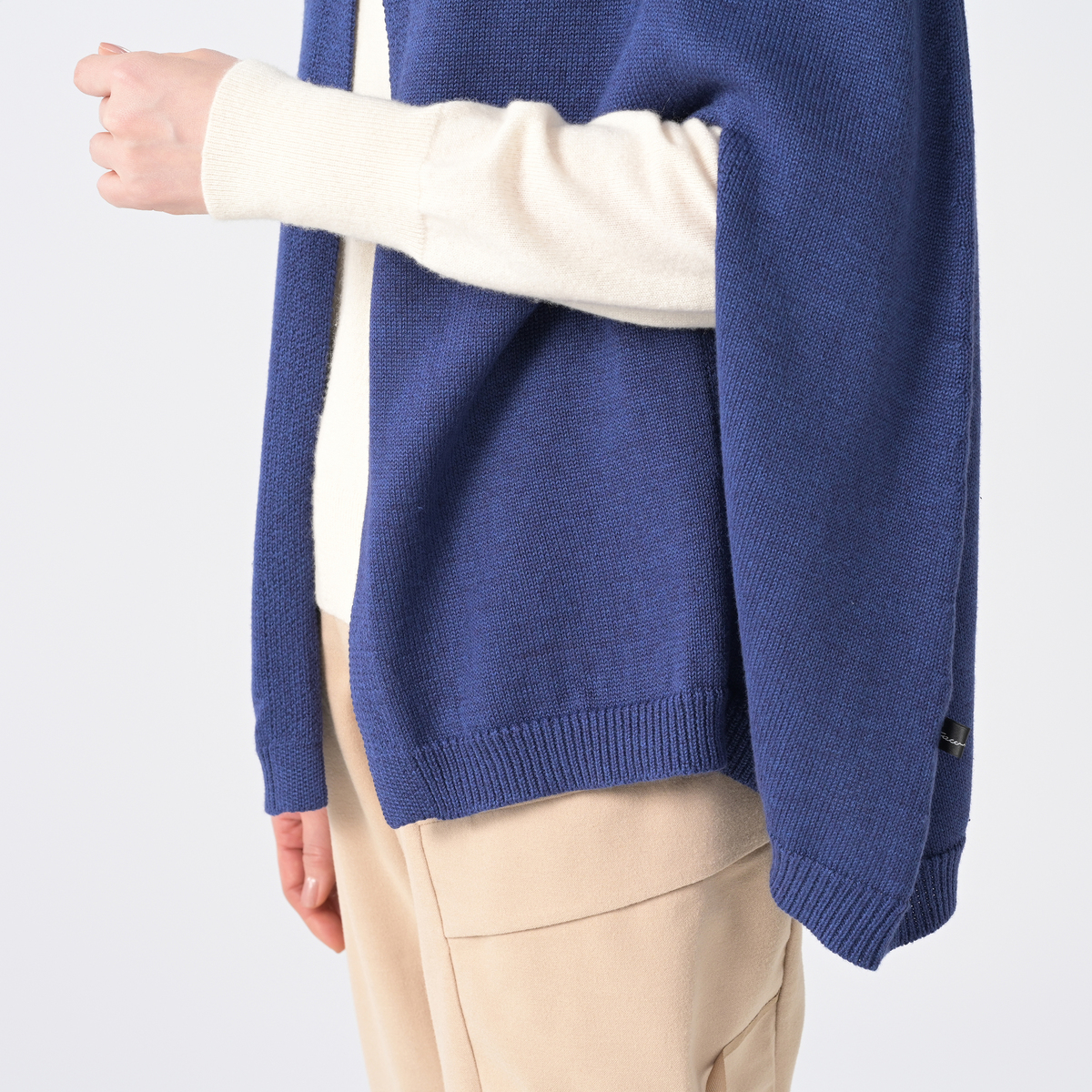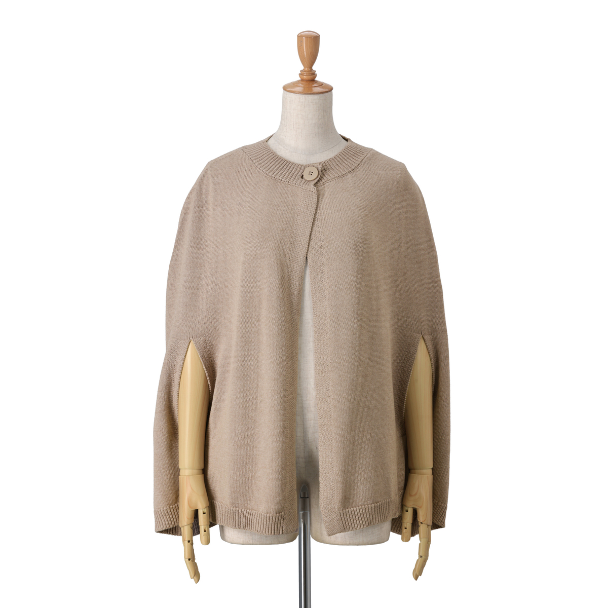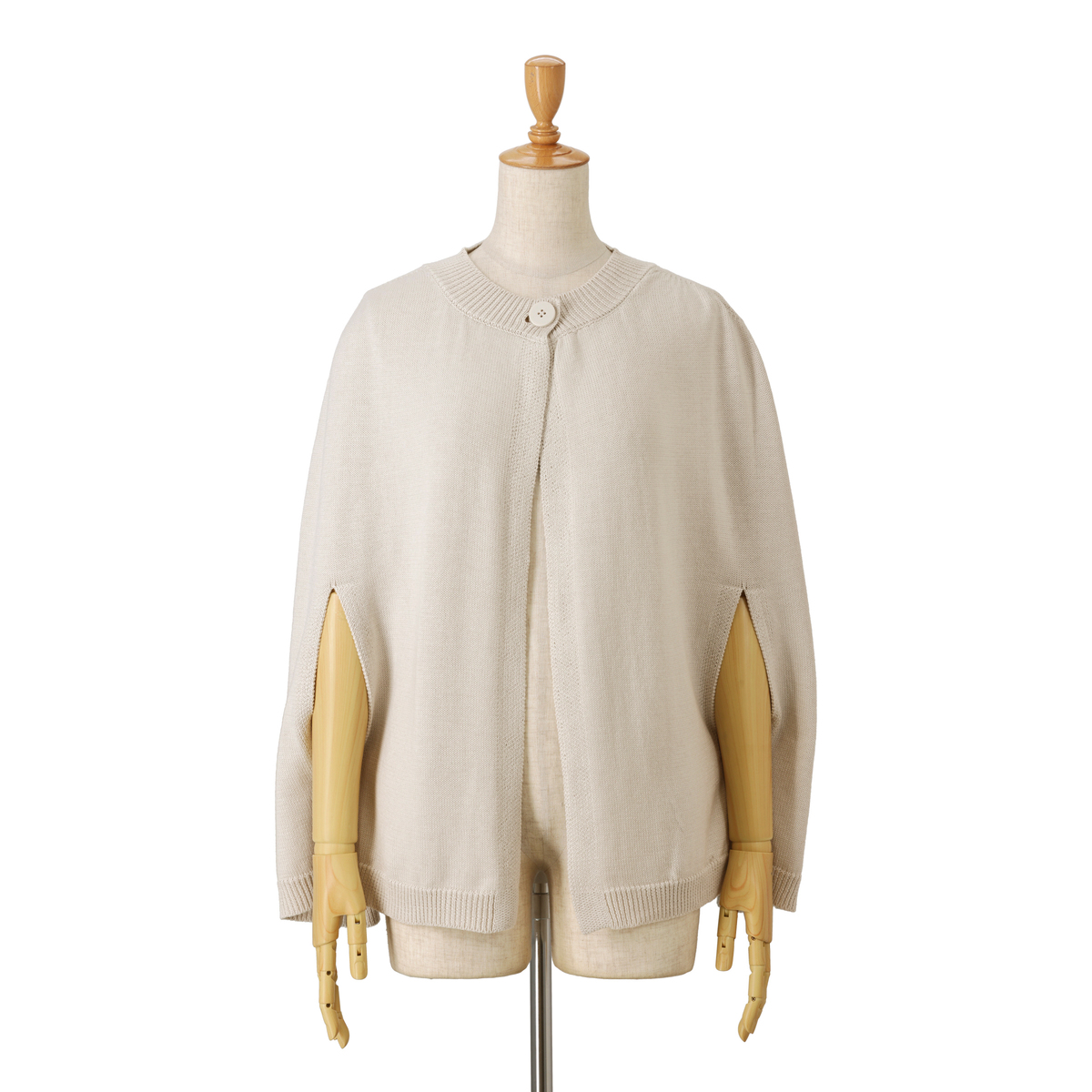 ミドルゲージのニットケープカーディガン。7ゲージの程よい厚みで、羽織るだけで暖かさとこなれ感をプラスできます。体形を自然にカバーしつつ、軽さのあるシルエットが魅力で、シンプルな仕立ての中に上品な雰囲気が宿る一枚です