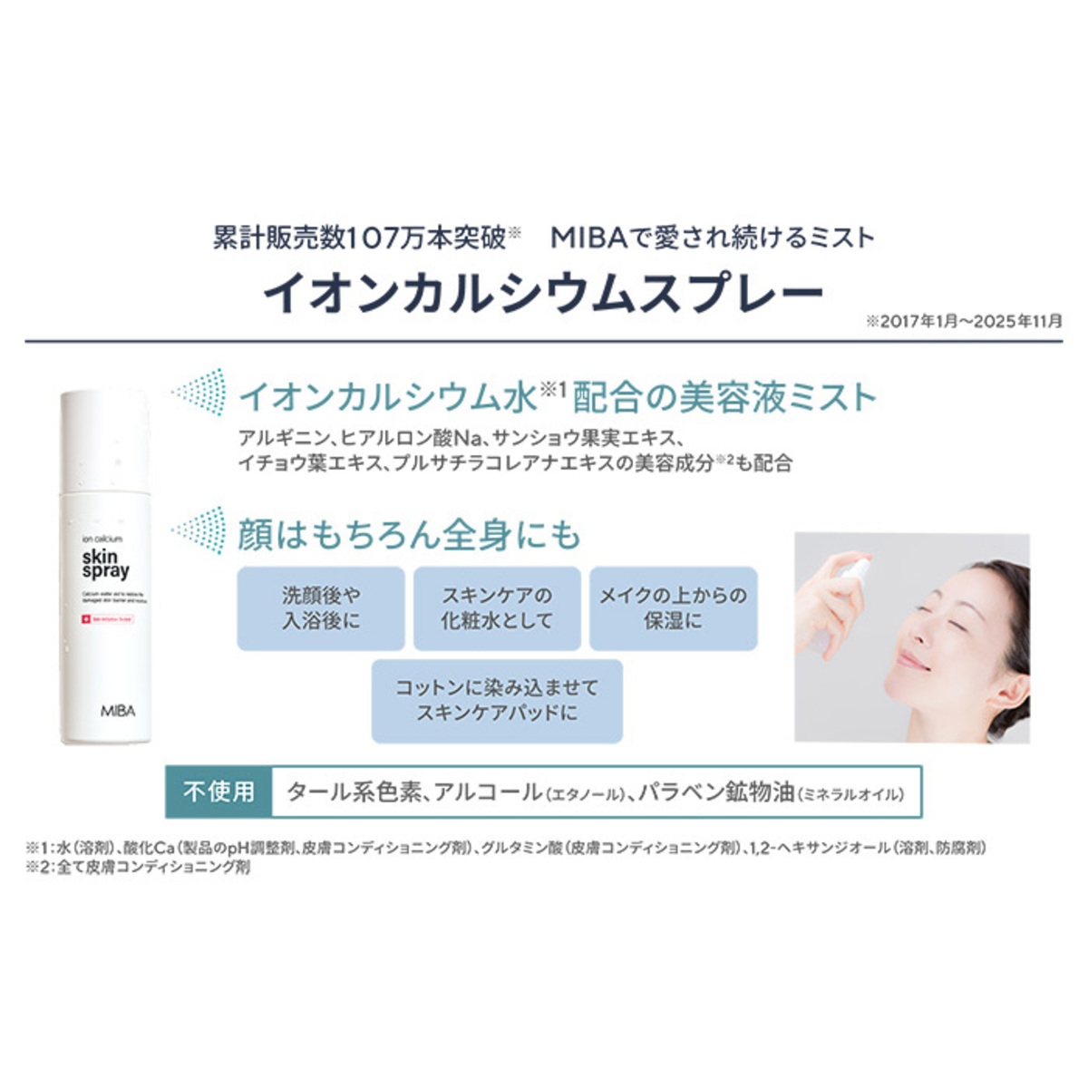 酸化Ca配合の化粧水ミスト。保湿し、肌荒れを防止し、ハリ・ツヤを与え、キメを整え、うるおいによる透明感のある肌に導きます。お顔はもちろん全身にいつでも使え、入浴後や洗顔後のミストとして、スキンケアの化粧水として、またメイクの上からもお使いいただけます