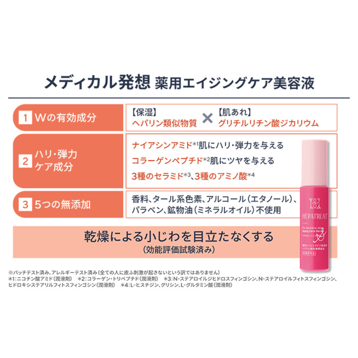 有効成分「ヘパリン類似物質」配合のエイジングケア*美容液。乾燥や肌あれ等の様々な肌悩みの解決や、肌を潤し整えることで見違えるような肌印象を目指します。さらに有効成分「グリチルリチン酸ジカリウム」を配合。ダブルの有効成分で肌悩みに広くアプローチ。乾燥による小じわを目立たなくする効能評価試験済みです