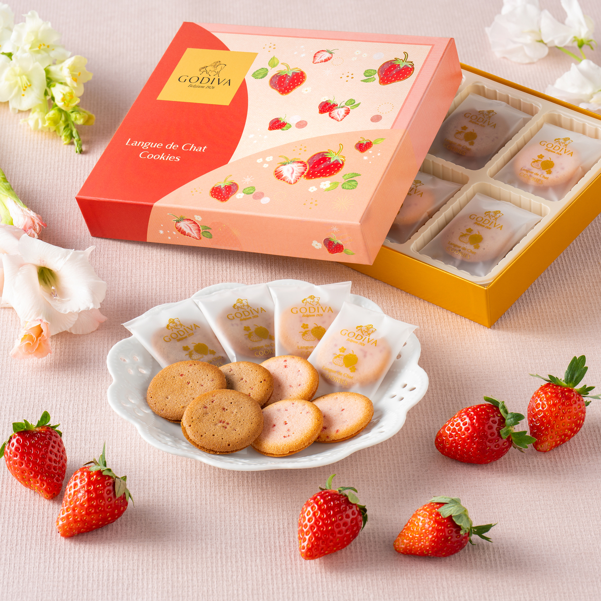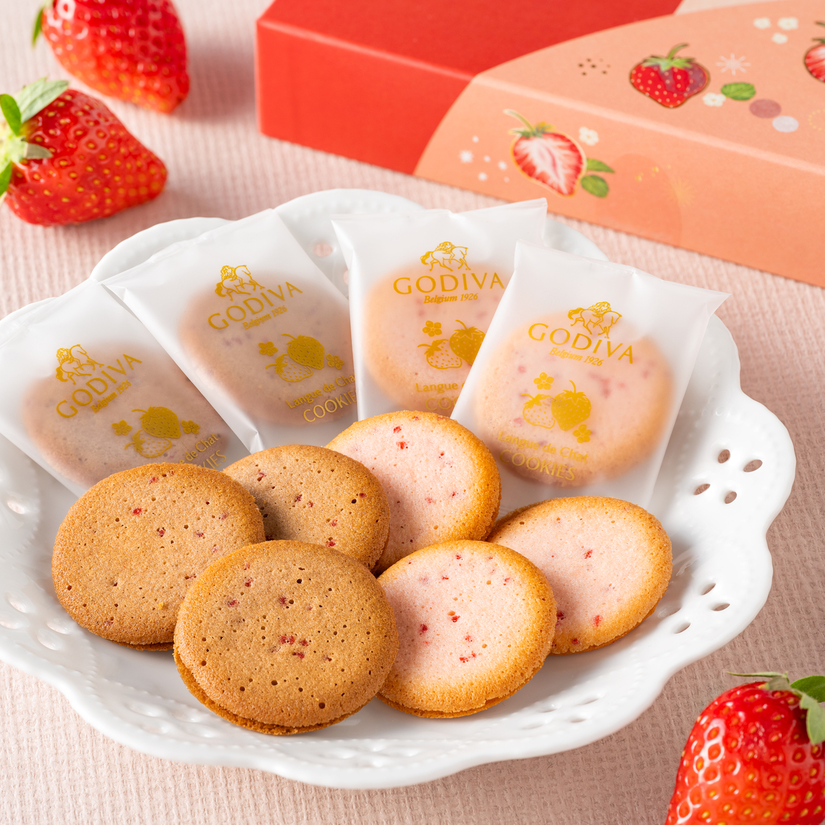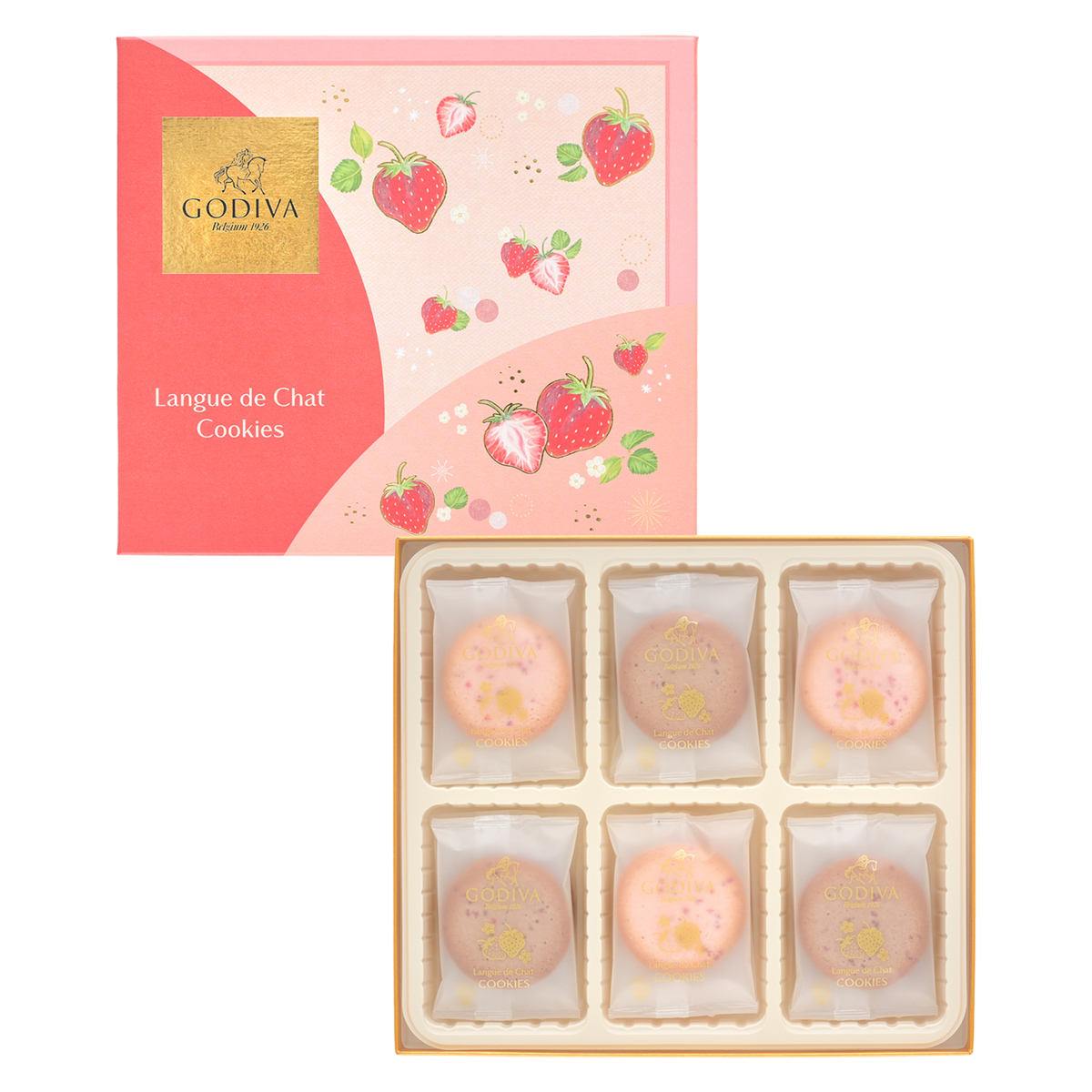 世界中で愛されるプレミアムチョコレートブランド「ゴディバ」の苺ラングドシャクッキー。苺のイラストを全体にあしらった華やかなパッケージでギフトとしてもおすすめです