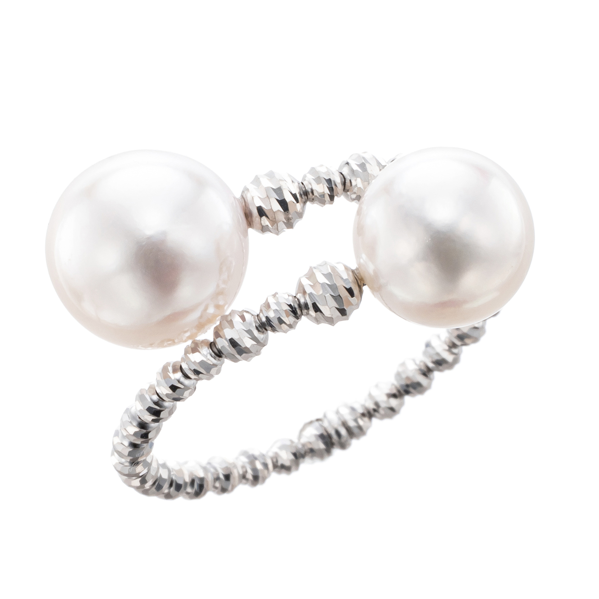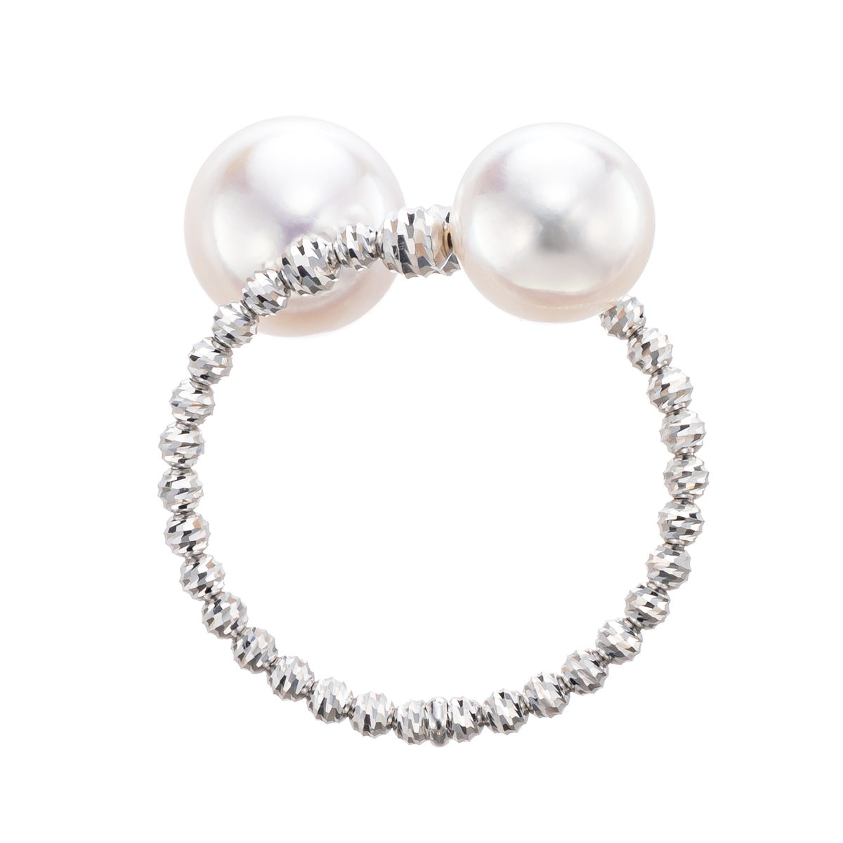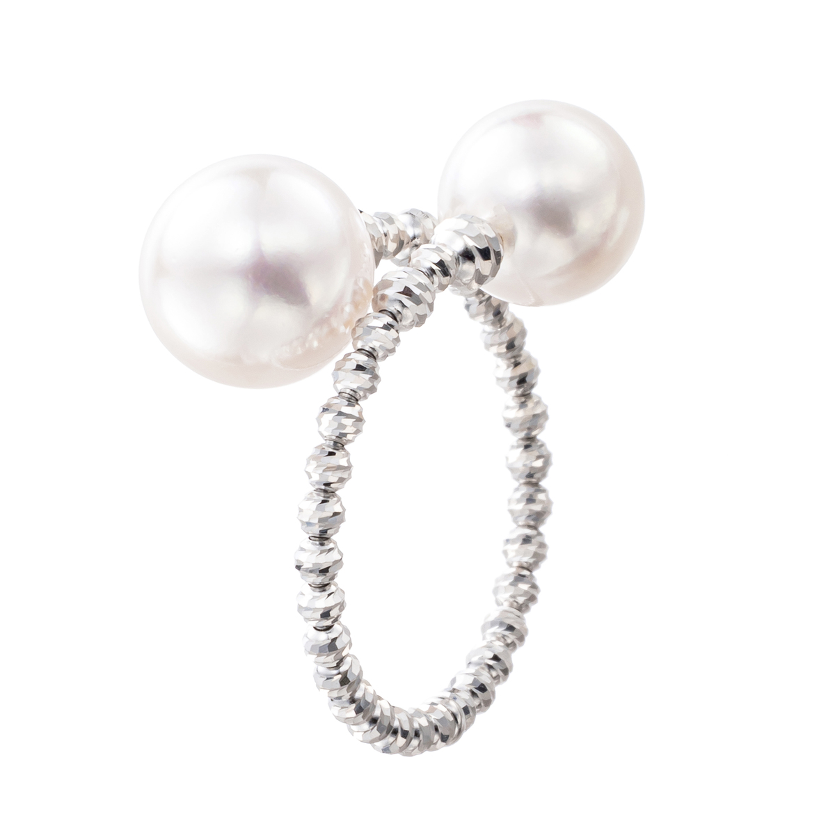 アコヤ真珠の大珠を使ったリング。2つの真珠を抱きかかえるようにセットし、存在感のあるデザインに。テリと巻きにおいてグレード1と認められたこだわりの真珠とカットボールが、指元をエレガントに演出します