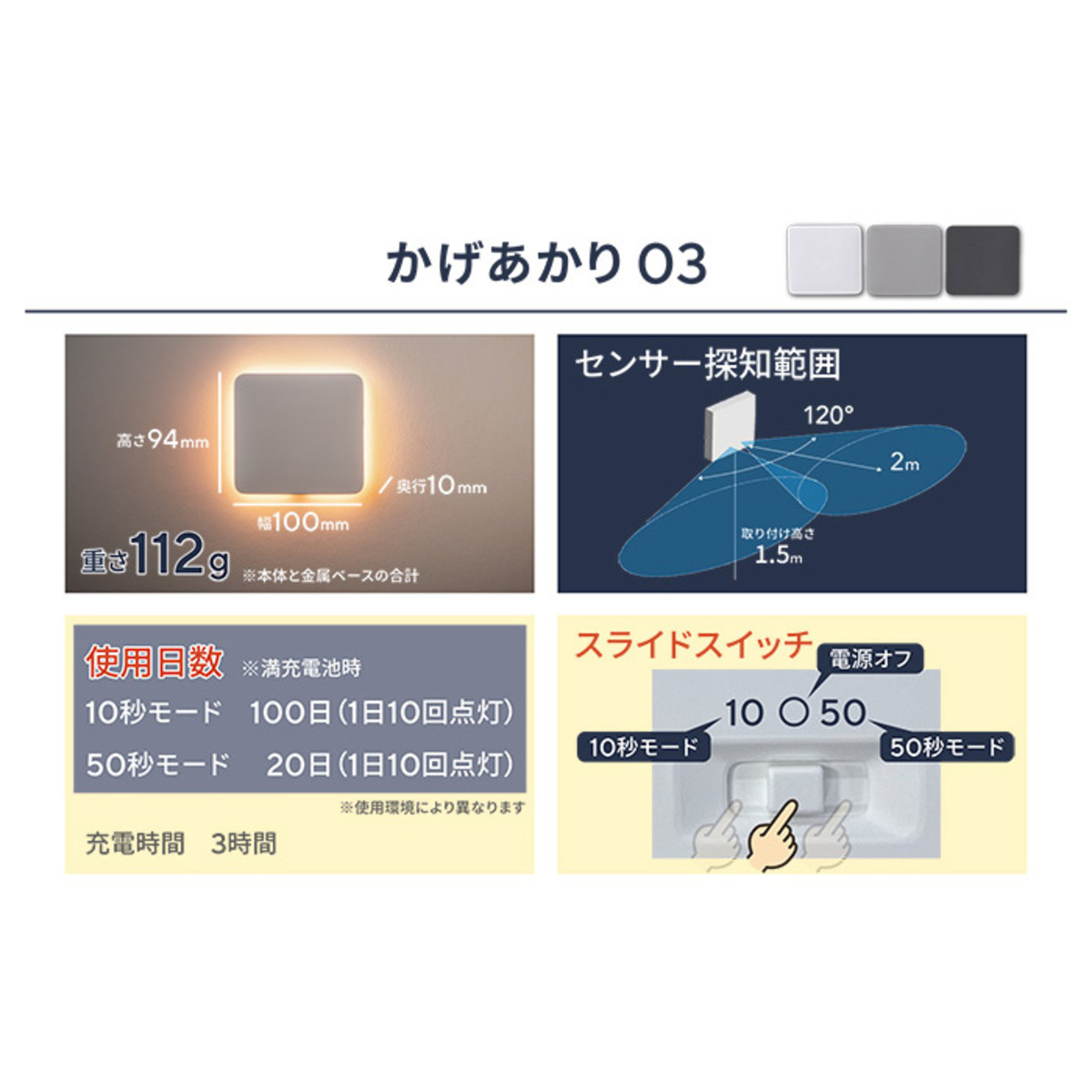 [商品内容] ・本体 ・金属ベース ・固定ピン×5本(石膏ボード専用) ・両面テープ×2枚 ・脱着工具 ・USBケーブル(TypeーC 充電用 長さ約20cm) ※ACアダプターは付属しておりません [サイズ] 高さ9.4×幅10.0×奥行1.0cm [重量] 本体72g 金属ベース40g 合計112g [充電時間] 3時間 [使用可能時間] 10秒モード100日 50秒モード20日 [全光束] 20lm [使用方法] 充電中:赤LED点灯 充電完了:緑LED点灯 10(秒)熱センサー:周囲が暗い時に人が来ると熱センサーが探知し、自動点灯する。人がいなくなると10秒後に消灯。そのまま人がいると点灯時間は延長される OFF:電源を切る 50(秒)熱センサー:周囲が暗い時に人が来ると熱センサーが探知し、自動点灯する。人がいなくなると50秒後に消灯。そのまま人がいると点灯時間は延長される ■取り扱い説明を充分にご確認の上、ご使用下さい 【中国製】 [注意事項] ※両面テープは壁紙には使用しない。破けたり、糊が壁に残ってしまったりする場合がある ※固定ピンの刺す角度に注意し、穴に少し刺して角度を確認してから差込む。無理に刺すと曲がる恐れがある ※固定ピンは根元までしっかり刺し込み、金属ベースと壁との間に隙間がない事を確認する。刺し込みが不十分だと強度が定価する恐れがある ※取付場所はもし落下しても安全な場所に取付ける ※落下して事故や損傷の恐れがあるまた落下による機器の破損やトラブルなどの一切の責任を負わない ※屋内用なので屋外の雨のかかる所湿気の多い浴室等で使用しない ※本機に強い衝撃を与えたり分解・改造しない。故障や破損の原因になる ※使用後はスイッチを切り消灯を確認してから保管する ※熱器具の近くで使用しない。故障や破損の原因になる ※センサーは周囲の明るさと温度変化を感知探知するので、以下の場所で使用すると誤作動や動作しないときがある ・風などでゆれる植物やカーテン ・犬猫などの小動物の近く ・エアコン等の送風を受ける場所 ・大理石の床など光の反射を強く受ける所 ・強い振動を受ける所 ・ガラスや壁越しの所電波器具の近く ※本機の下に貴重品等を置かない ※周囲温度が10℃〜40℃の範囲で充電する ※直射日光の当たる場所や炎天下の車内などで保管充電しない ※3か月以上バッテリー残量が少ない状態で保管すると充電できないおそれがある。3か月に一度は充電する ※急速充電対応のUSB充電器では充電できないおそれがある(USB PDなど) ※本機には充電器が内蔵されている各自治体により処理が異なる。指示に従い廃棄する特に指示がない場合は電池の回収日に出す