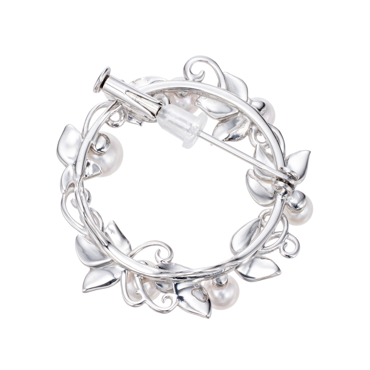真珠総合研究所でテリがトップグレードと認められたアコヤベビーパールをあしらったブローチです。リースモチーフで、上品さとラグジュアリー感を兼ね備え、これひとつで装いを格上げします