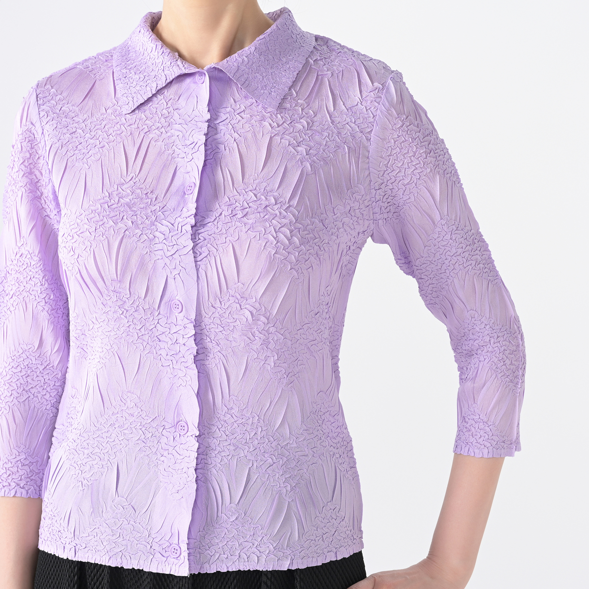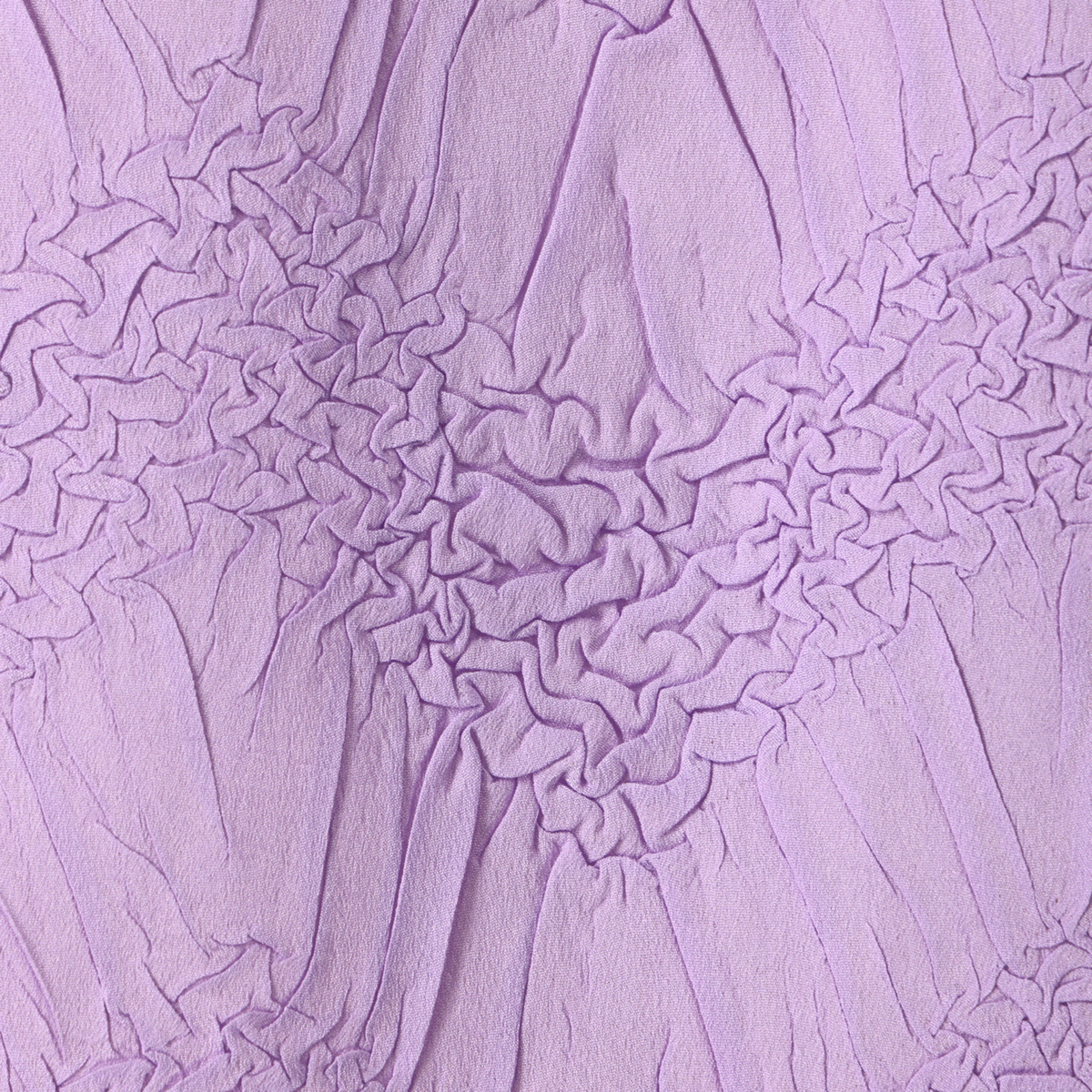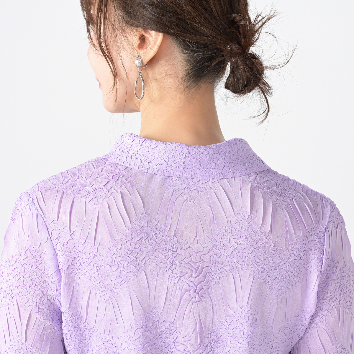 布帛生地にワッシャー加工を施し、ストレッチ性のある生地に仕上げた後、エンボス加工を施し、上品さが際立つ立体的で浮き出るような地柄を表現しました。さらにはプリーツでヒダを付けています