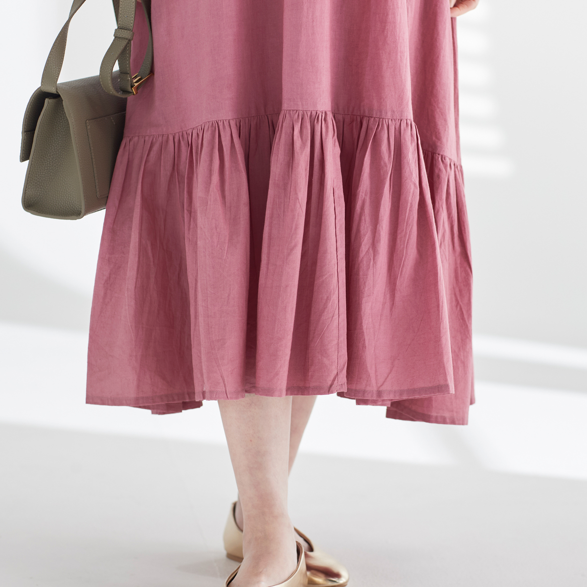 裾のフレアが広がり、エレガントなシルエットを演出。たっぷりとした長さで、上品な印象を与えます。生地を贅沢に使用しているので、ゆったりとした着用感です