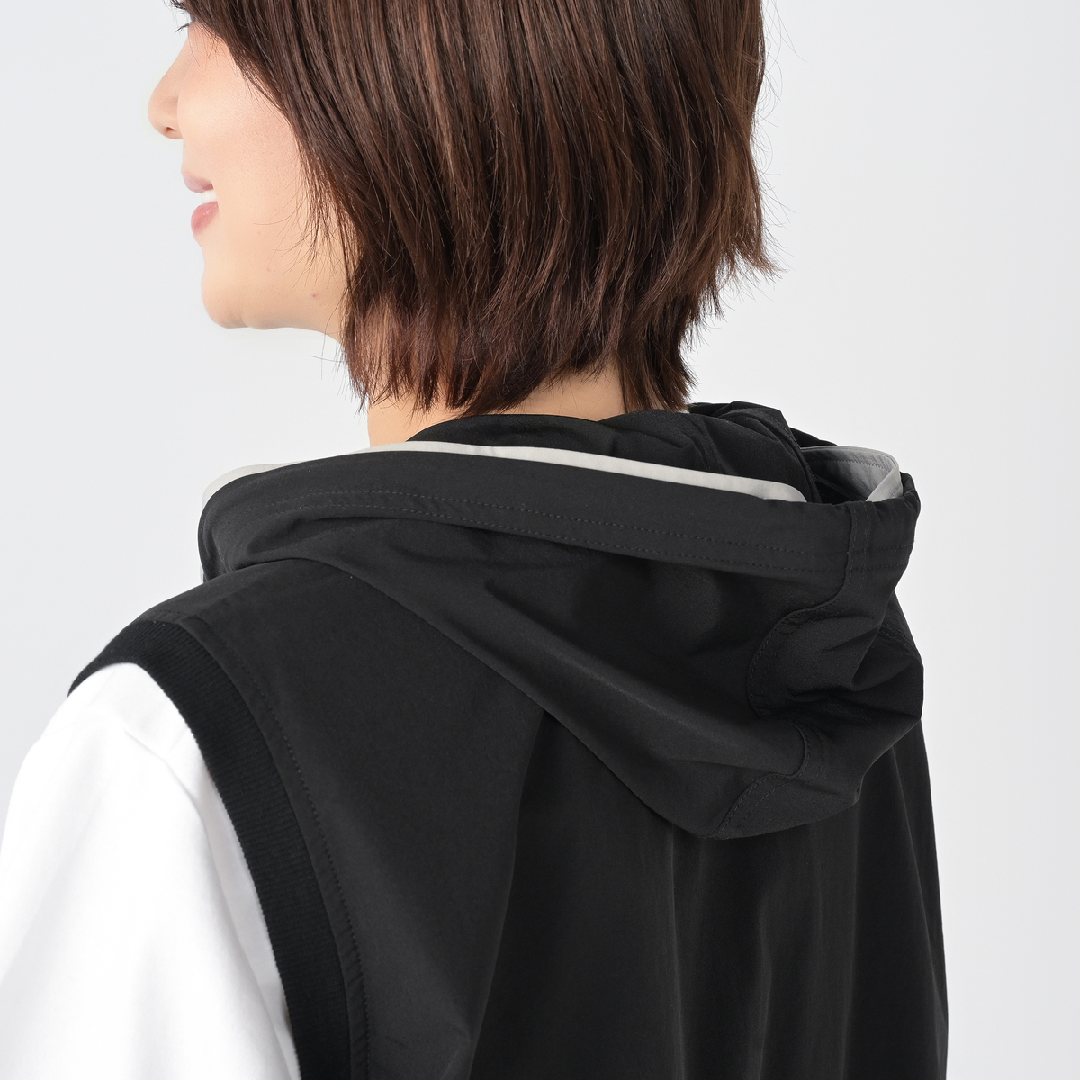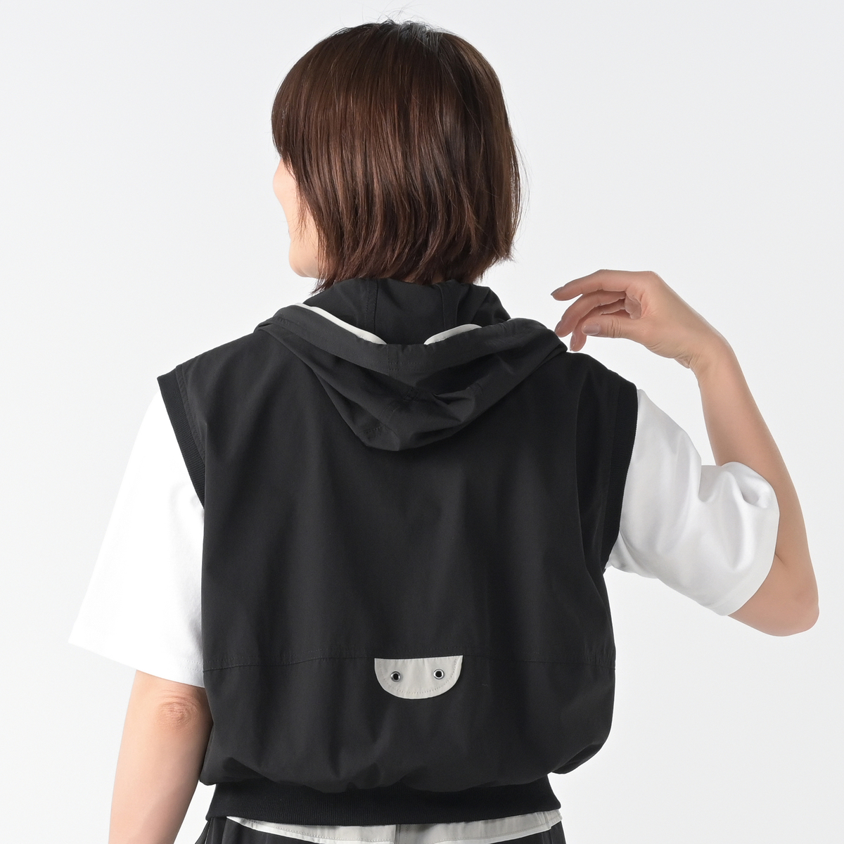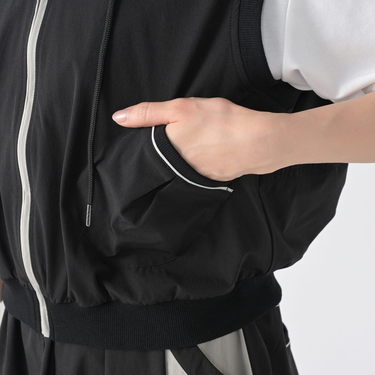 様々なコーデに活躍してくれるフーデッドショートベスト。斜めに配したポケットや後身頃の配色ディテールがポイントです