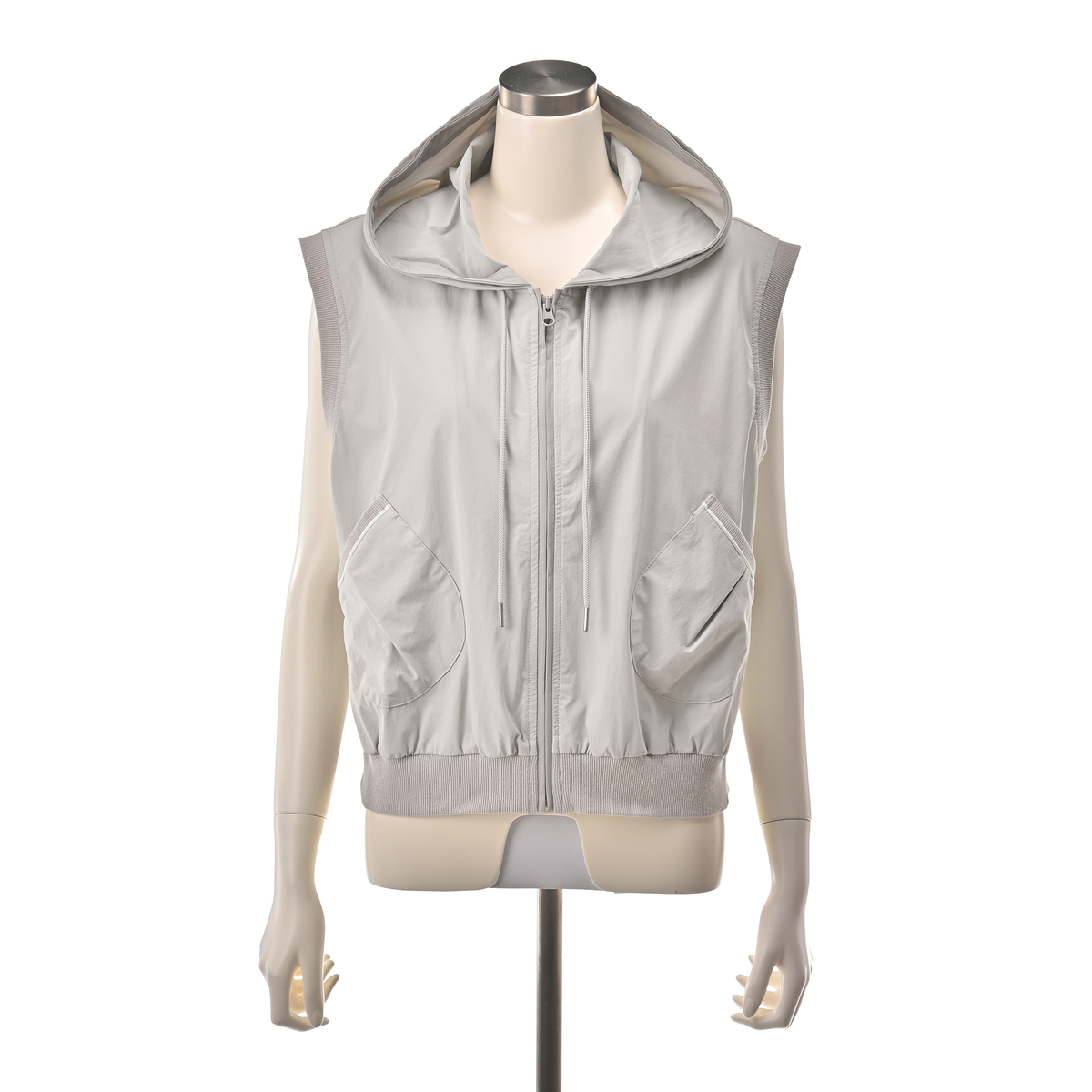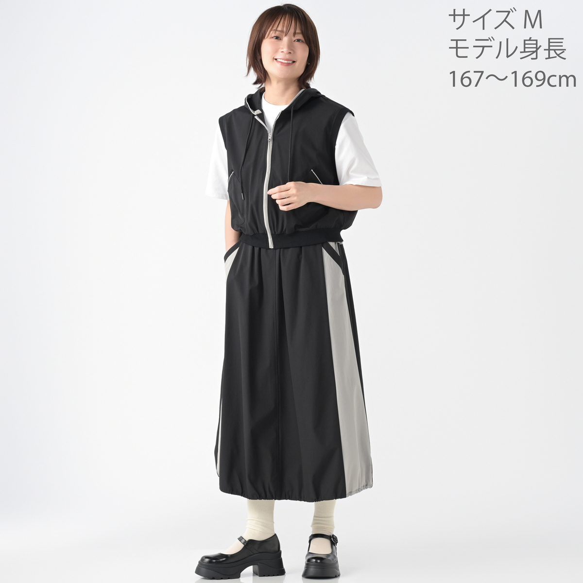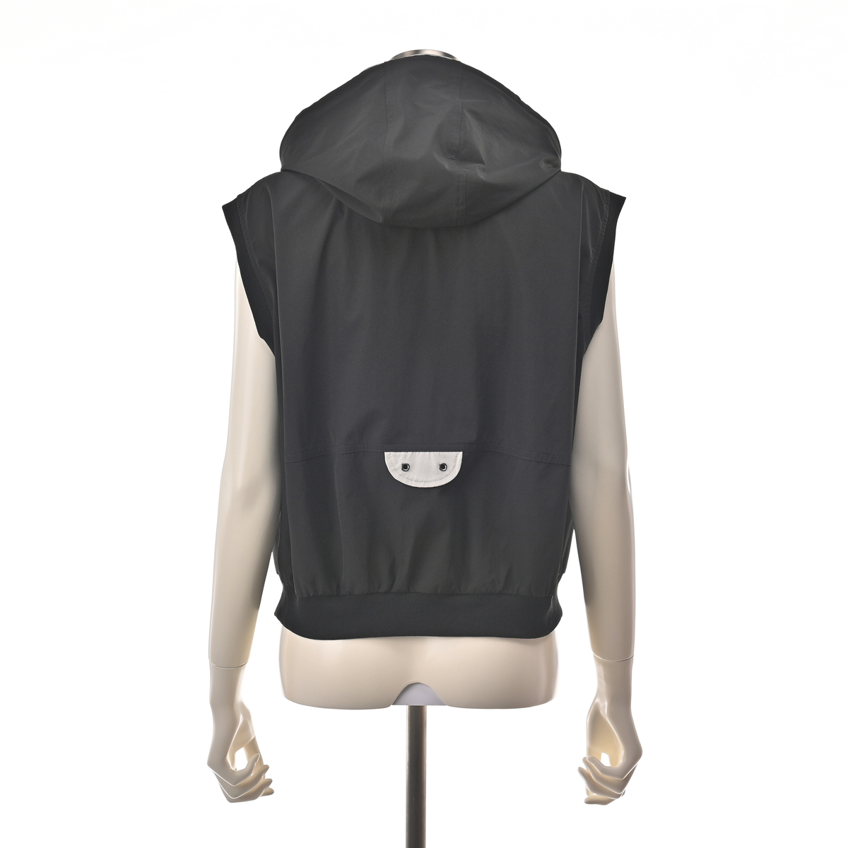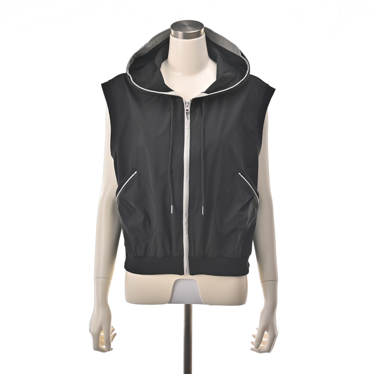 様々なコーデに活躍してくれるフーデッドショートベスト。斜めに配したポケットや後身頃の配色ディテールがポイントです