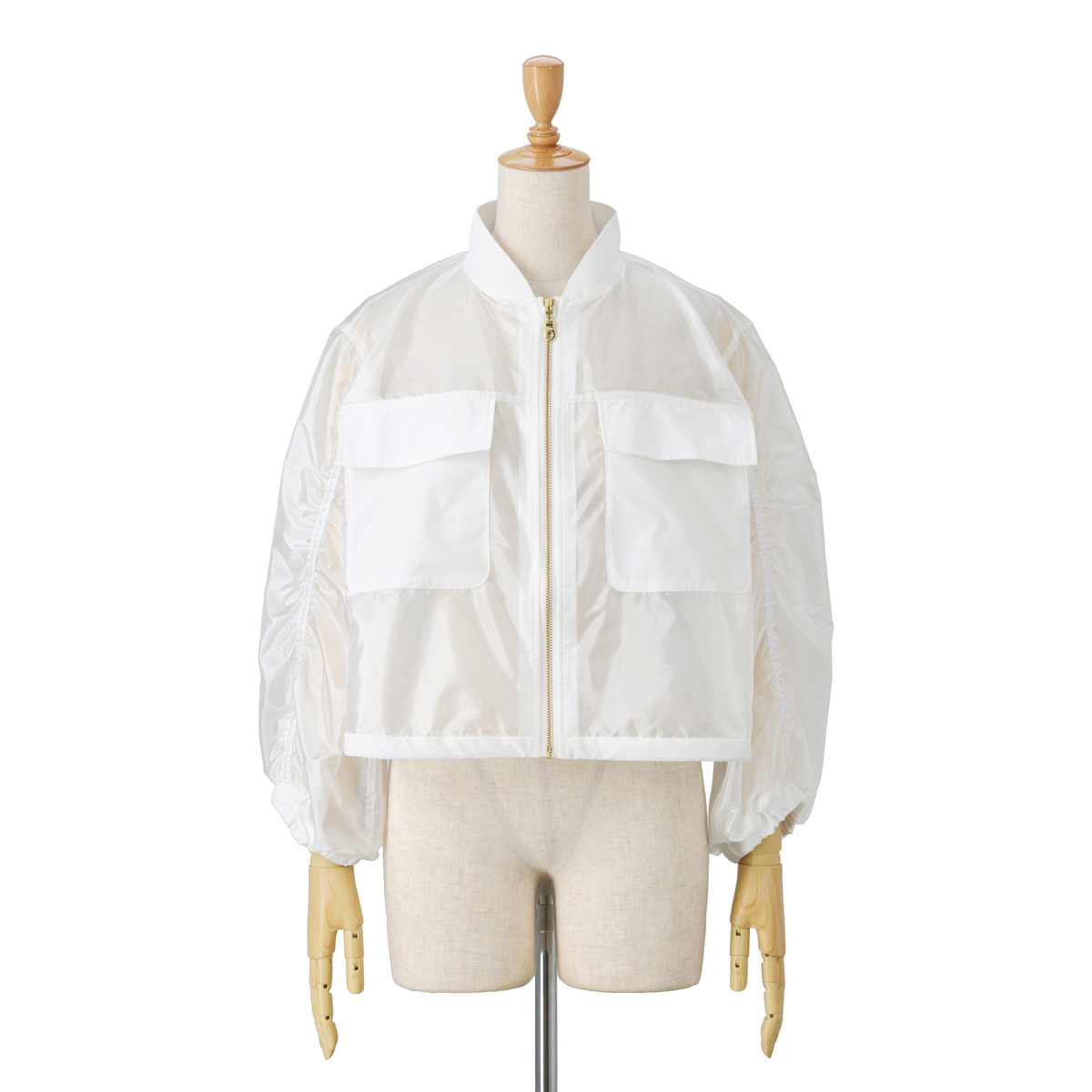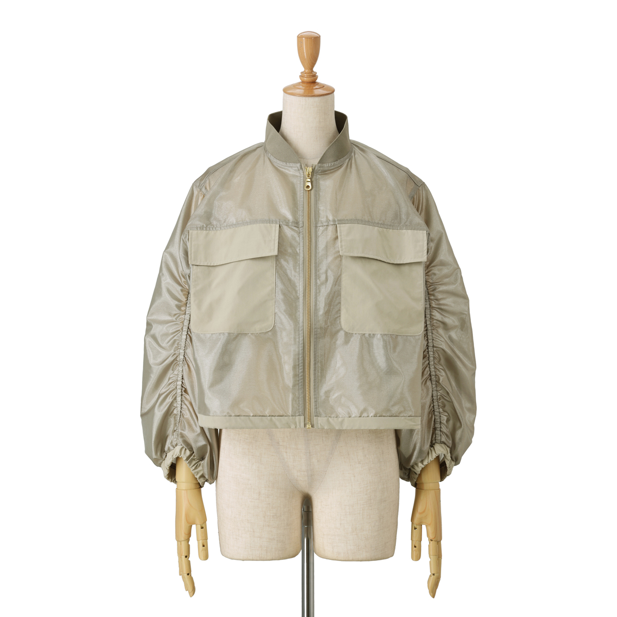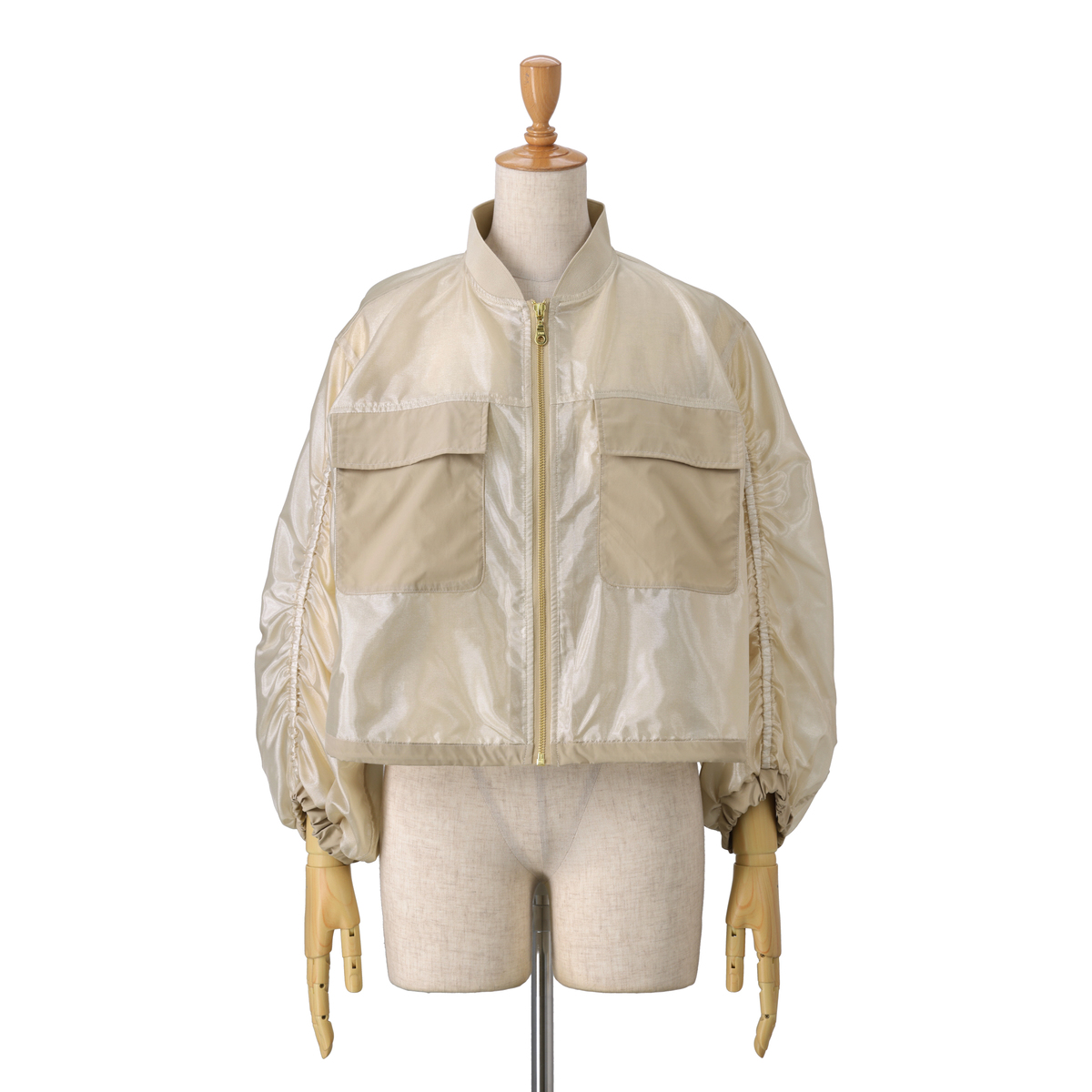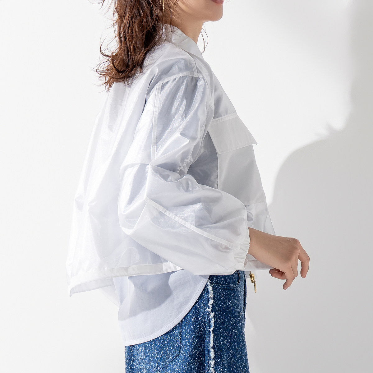透け感のある素材を使い、胸ポケットと裾に異素材を組合せた軽やかなジャケット。後ろ中心にタックを入れることでほどよいボリュームを出し、袖は前切り替えにゴムを入れて動きやすさとデザイン性を備えています。春らしい雰囲気のブルゾンで、前身頃には便利なポケット付き。コーディネートにさらりと軽さを添えてくれます