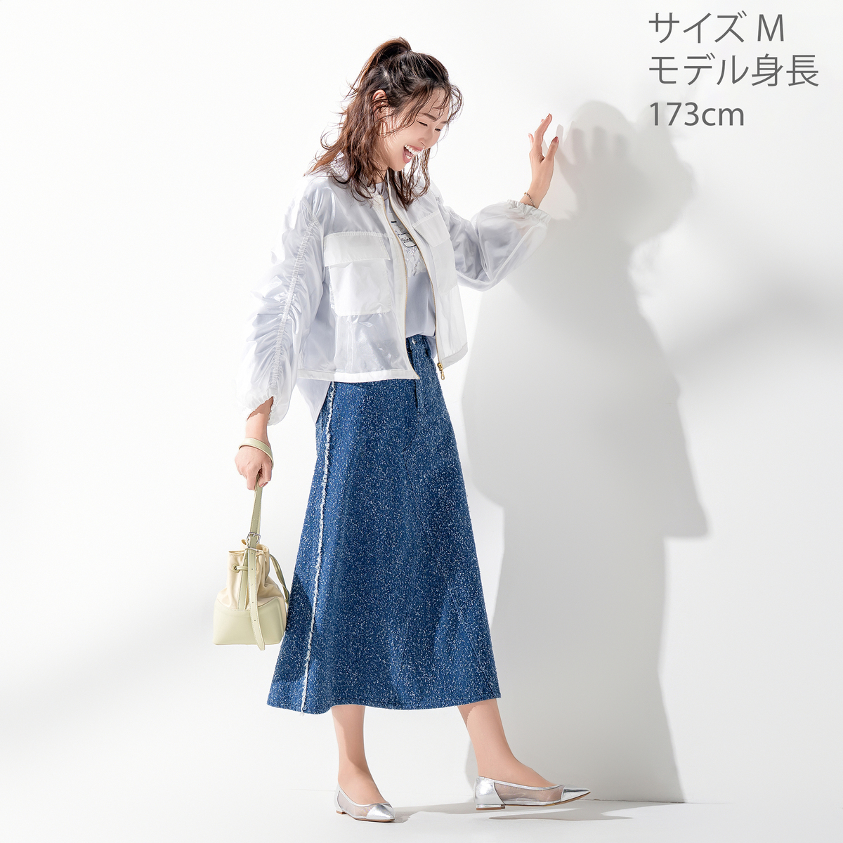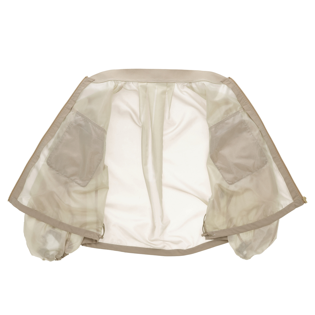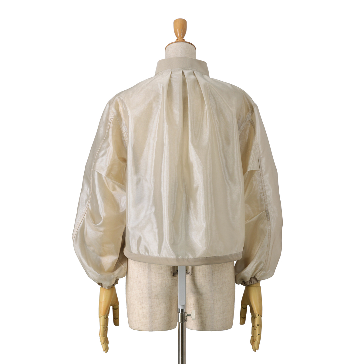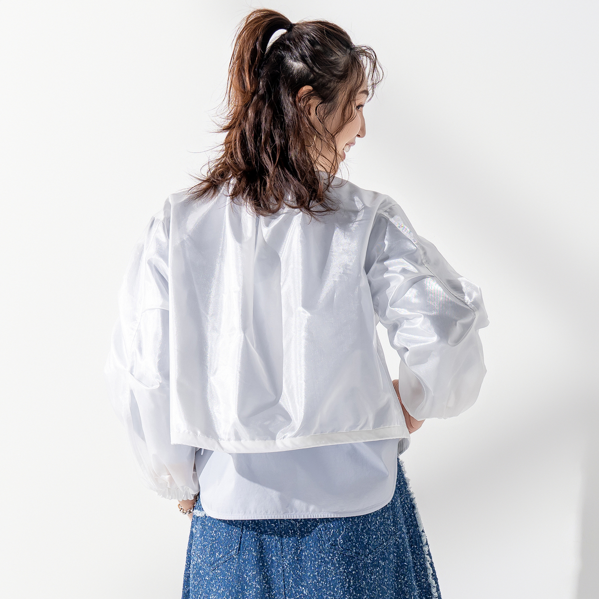 透け感のある素材を使い、胸ポケットと裾に異素材を組合せた軽やかなジャケット。後ろ中心にタックを入れることでほどよいボリュームを出し、袖は前切り替えにゴムを入れて動きやすさとデザイン性を備えています。春らしい雰囲気のブルゾンで、前身頃には便利なポケット付き。コーディネートにさらりと軽さを添えてくれます