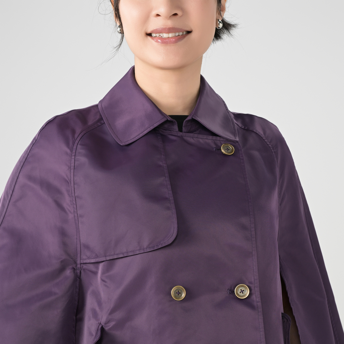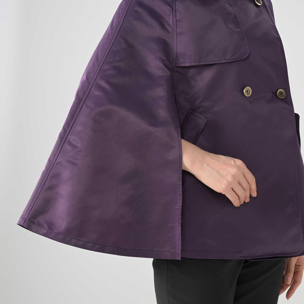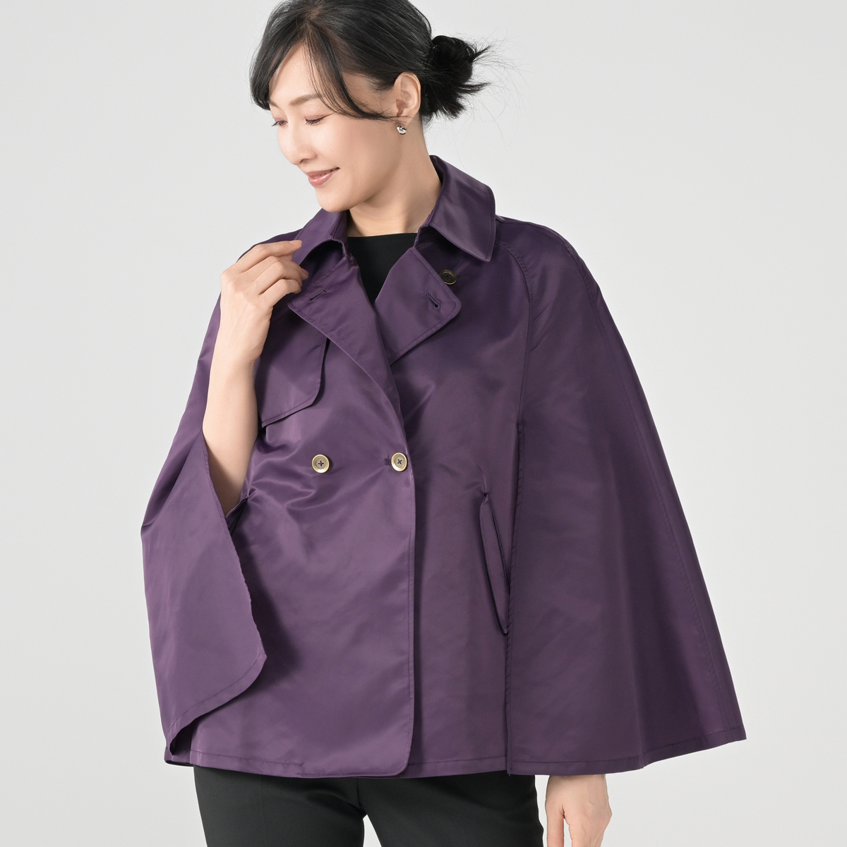 クラシックなトレンチカラーをあしらったケープコート。季節の変わり目に使いやすい軽さで、肩を包むシルエットが上品さを添えます。羽織るだけで印象が整い、パンツにもスカートにも合わせやすいモダンな仕上がりです