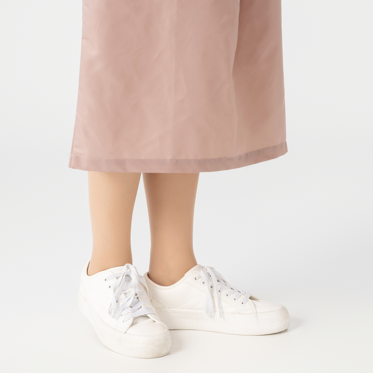 ウエストサイドにはファスナー付き。さらに後ろゴム仕様で着脱もラクに。素材の光沢感が上品さを醸し出し、コーディネートの主役になります