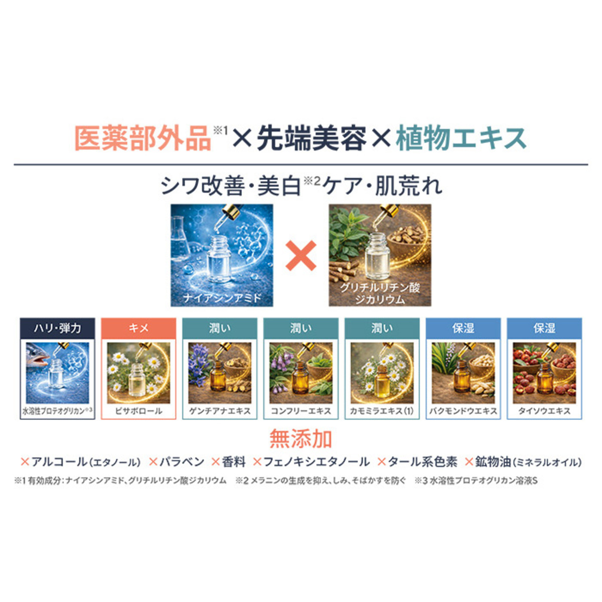 ナイアシンアミドを配合した多機能オールインワンゲルクリーム。化粧水、乳液、美容液、クリーム、アイクリームの機能をひとつにまとめています。美白(*1)有効成分、シワ改善(*2)有効成分であるナイアシンアミドを配合し、メラニンの生成を抑えてしみ・そばかすを防ぎ、シワを改善します。また、肌荒れ(*3)有効成分のグリチルリチン酸ジカリウムも配合しています