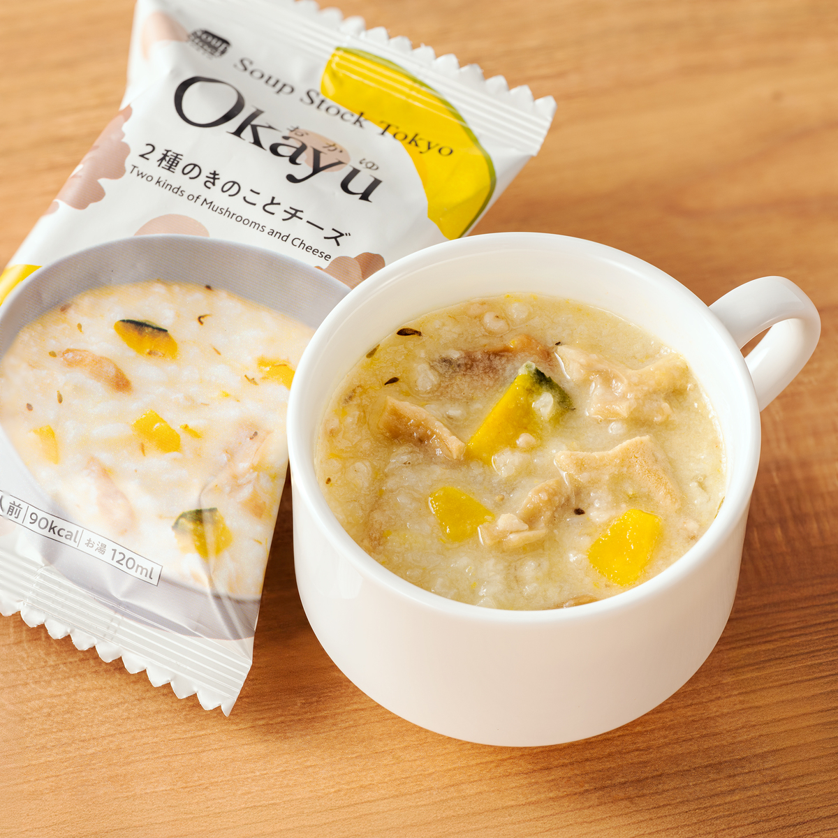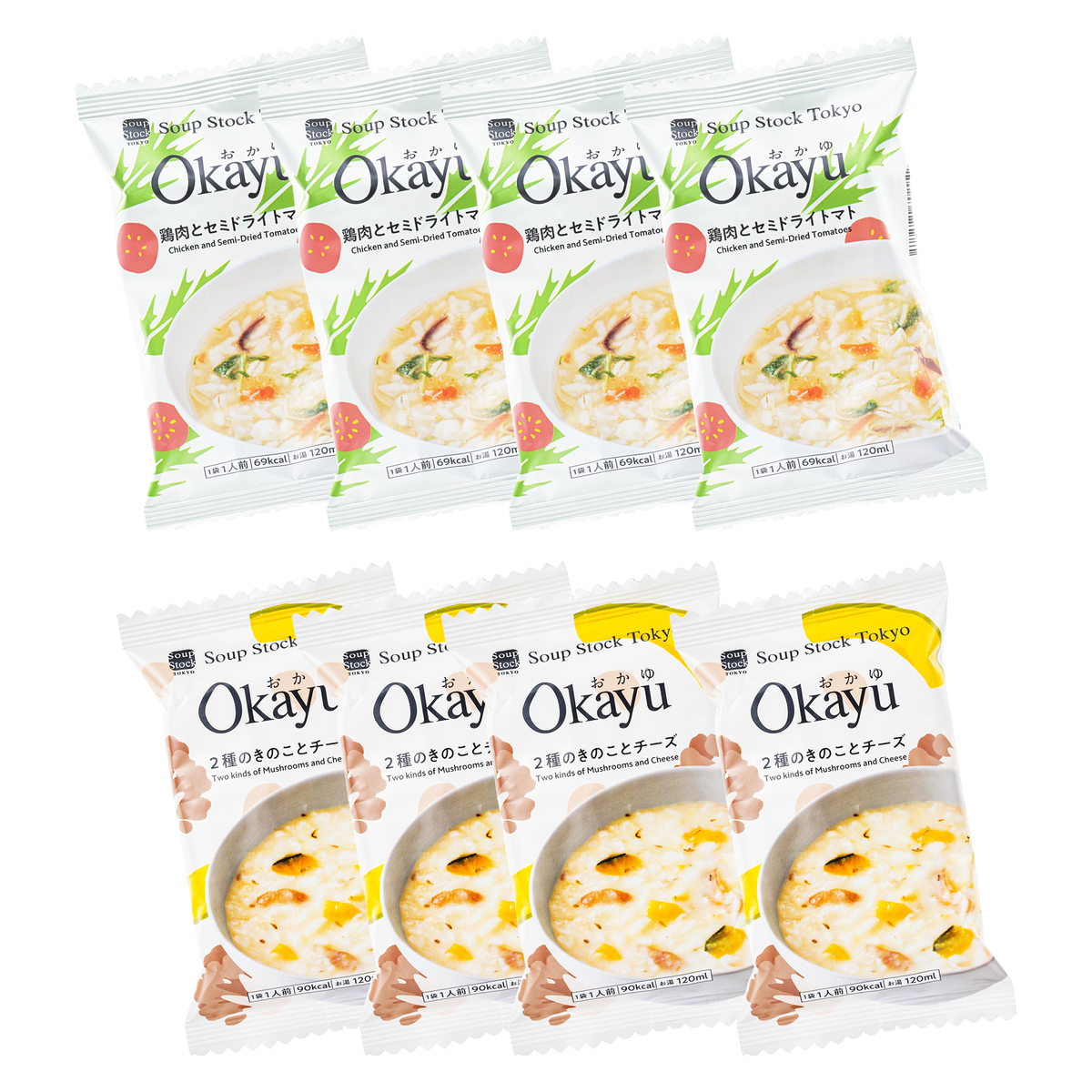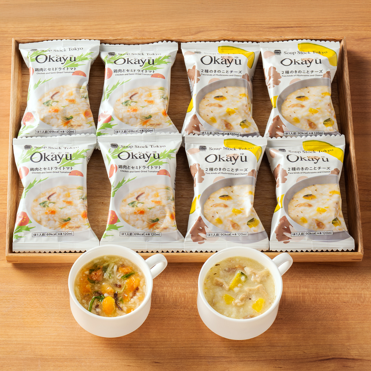 [アレルギー物質特定原材料8品目] 小麦、乳 [商品内容] ・2種のきのことチーズ21.4g ・鶏肉とセミドライトマト17.4g 各4個/計8個 [賞味期限] 出荷時点で賞味期限まで120日以上ある商品をお届けします [保存方法] 開封前:直射日光および高温多湿の場所を避けて保存してください 開封後:開封後は直ちにお召し上がりください [お召し上がり方] ・器に中身を1ヶ入れます ・熱湯120mlを注ぎ、よくかき混ぜ、約2分で出来上がります [注意事項] ※調理時及びお召し上がりの際は、熱湯でのやけどに十分ご注意ください ※溶けにくい場合は、ブロックをほぐすようにかき混ぜてください ※パッケージの写真は盛り付け例とイメージです [原料原産地] 白飯(米(国産)) [原産国] 日本 [原材料] 2種のきのことチーズ:白飯(米(国産))、マッシュルーム、水煮まいたけ、濃縮乳、オートミール、チーズパウダー、デキストリン、でん粉、乾燥かぼちゃ、米みそ、野菜エキス、ポークエキス、大麦加工品、食塩、チキンエキス、チーズ、昆布エキス、バター、乾燥ゆず皮、香辛料/酸化防止剤(V.E)、(一部に小麦・乳成分・大豆・鶏肉・豚肉を含む) 鶏肉とセミドライトマト:白飯(米(国産))、蒸し鶏、ドライトマト、デキストリン、水菜、でん粉、生姜、チキンエキス、押麦、フライドオニオン、魚介エキス、生姜ペースト、ポークエキス、乾燥きくらげ、食塩、魚醤粉末、ごま油、香辛料/酸化防止剤(V.E)、(一部に小麦・ごま・鶏肉・豚肉を含む)