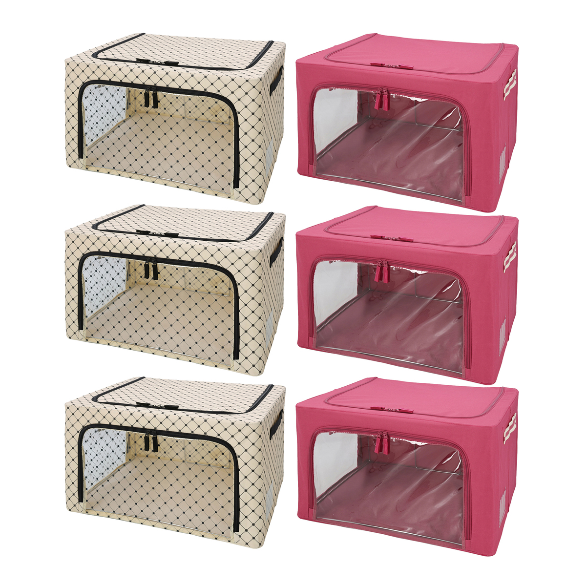 [サイズ] 約 幅50×奥行40×高さ28cm(折り畳み時高さ3cm) [重量] 約 1.35 kg(1個あたり) [材質] 生地:ポリエステル フレーム:スチール(表面加工:クロムめっき) 窓:ポリ塩化ビニル 取っ手:ポリエステル 底面板:MDF(中密度繊維板) [フレーム耐荷重] 約 63 kg ※本製品をスタッキングする場合は角を合わせ、ズレないようにして下さい ※耐荷重量表記は、フレームに対して真下に荷重がかかる条件下によるものです。本製品をスタッキングする場合はご注意下さい ※最下部のボックスにかかる荷重は、フレーム耐荷重量を超えないようにして下さい [使用方法] 1.天面のファスナーを開きます 2.天面を引き上げ、内部が見える状態にします 3.ケースを引き上げます 4.前面と側面を開きます ※ハーフサイズは前面、側面の開閉はできません 5.フレームを開いて固定します 6.前面と側面、天面のファスナーを閉じて完成です [お手入れ] ・水洗いしないで下さい ・汚れた場合は、水で固く絞った布でふき取って下さい。汚れがひどい場合は、中性洗剤を含ませた布でふき取り、水で固く絞った布でふき取り、陰干しして下さい ・漂白剤、ナトリウム、ベンジンおよび他の化学薬品は使用しないで下さい [注意事項] ※破損や事故などを防ぐために、必ずお守り下さい ※本製品は、直射日光が当たる場所や高温または湿気の多い場所で使用しないで下さい ※濡れたものや、刃物類、重量物を収納したり、本製品の上に同製品以外のものを置いたりしないで下さい ※本製品に強い衝撃を与えないで下さい ※開封時は臭いがする場合があります。天気の良い日に1日程度、陰干ししていただくと臭いが和らぎます ※危険ですので、本製品を踏み台として使用しないで下さい ※お子様が本製品で遊ばないように注意して下さい。ケガや破損の恐れがあります ※収納以外の用途に本製品を使用しないで下さい ※組み立て中に指を挟まないように注意して下さい ※広く平らな場所で組み立てて下さい ※組み立て後、ゆるみ、ゆがみなどの異常がないか確認して下さい ■取り扱い説明を充分にご確認の上、ご使用下さい 【中国製】 [セット内容] スタッキングできる 窓付き収納BOX 同色3個セット×2