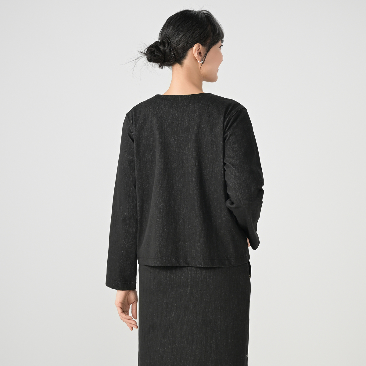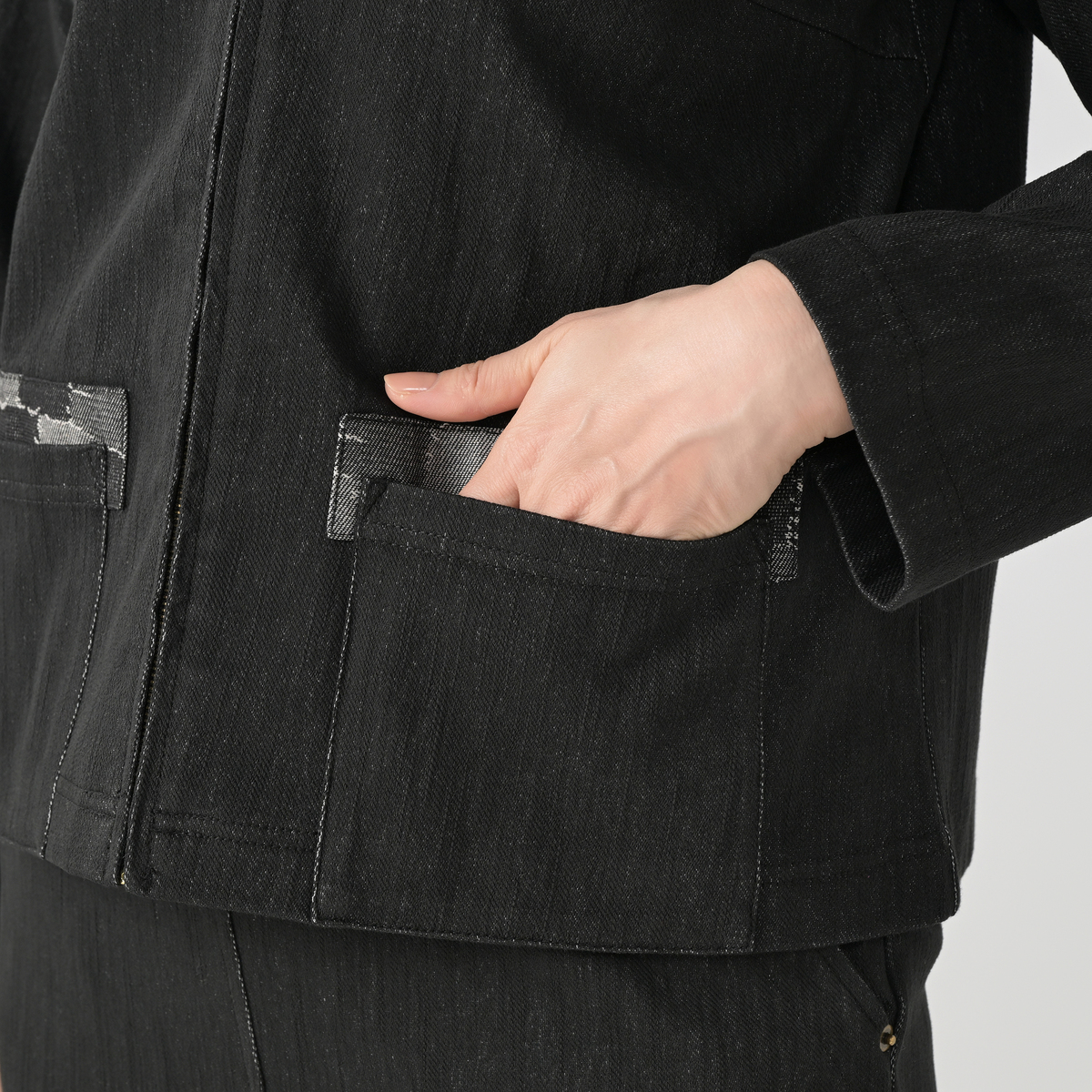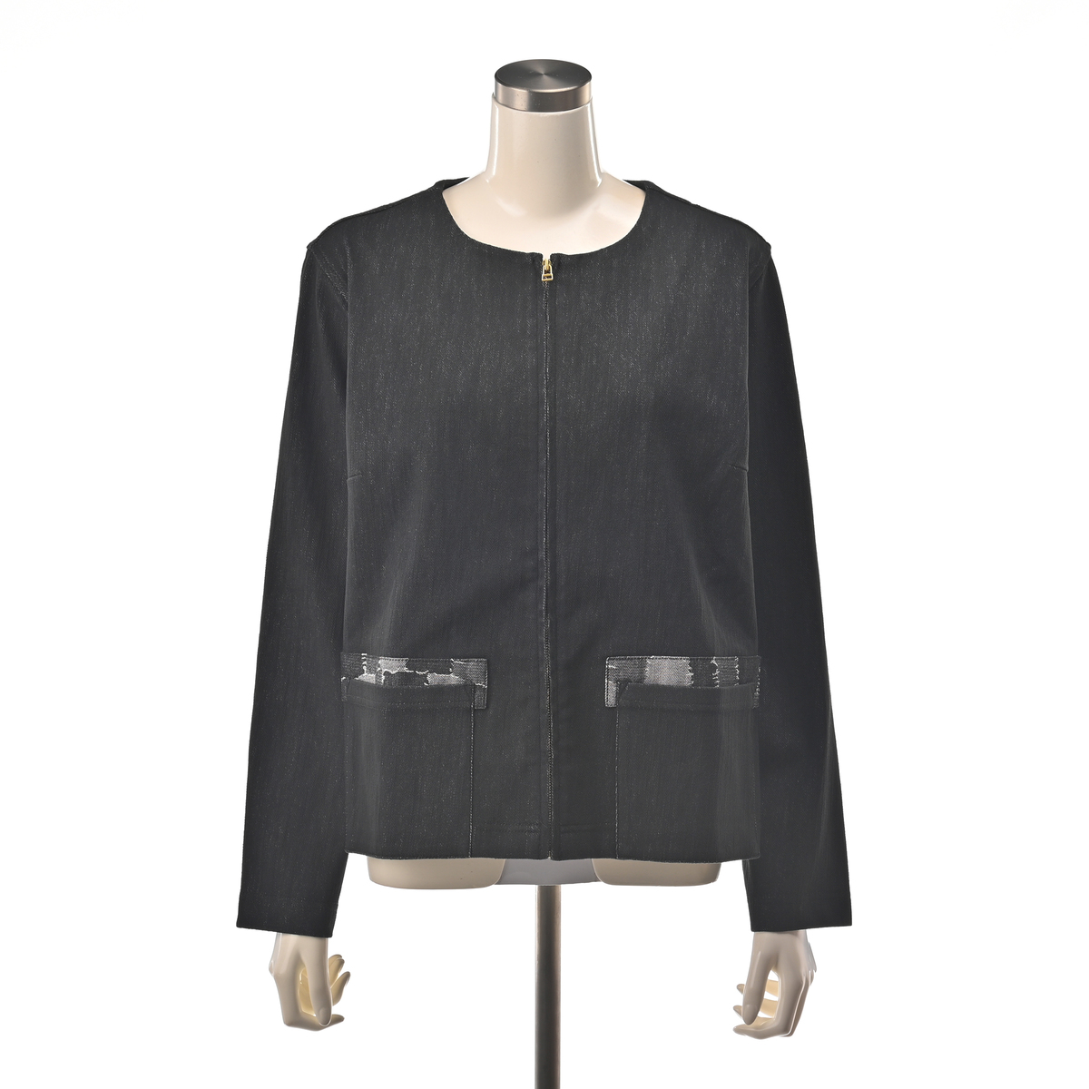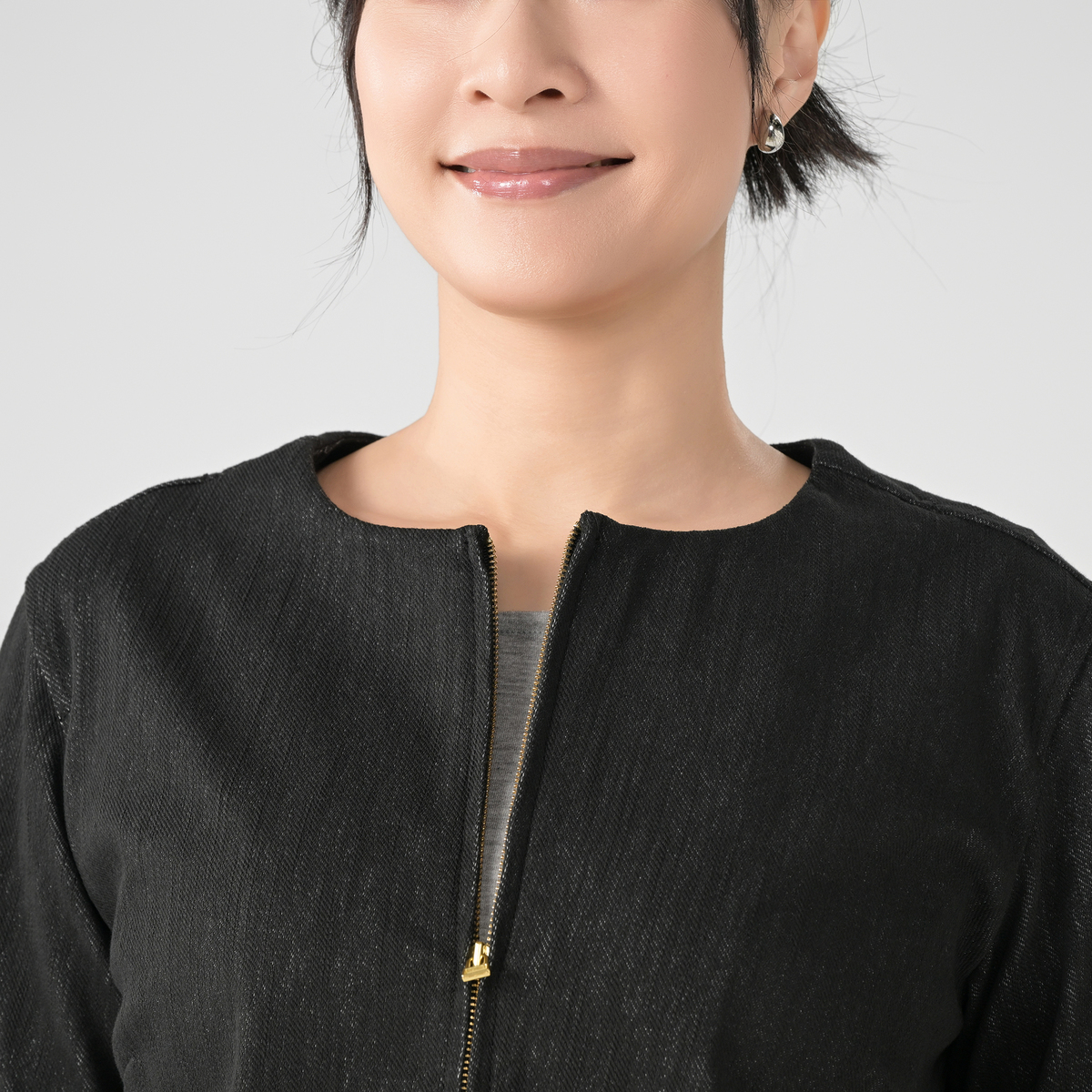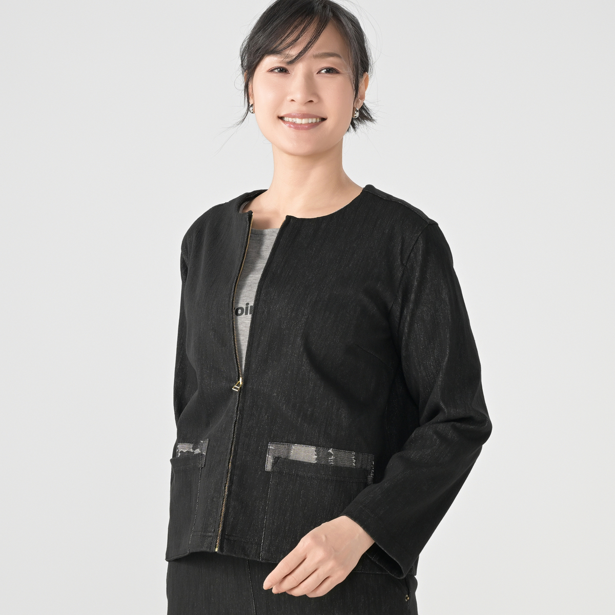 エニワイズ加工による、しっとりとなめらかな風合いのノーカラーショートジャケット。軽く羽織りやすい丈感で、前身頃にはポケット、前立てはファスナー仕様と使いやすさにも配慮しています。エレガントながら程よくカジュアルで、幅広い組合せで活躍します