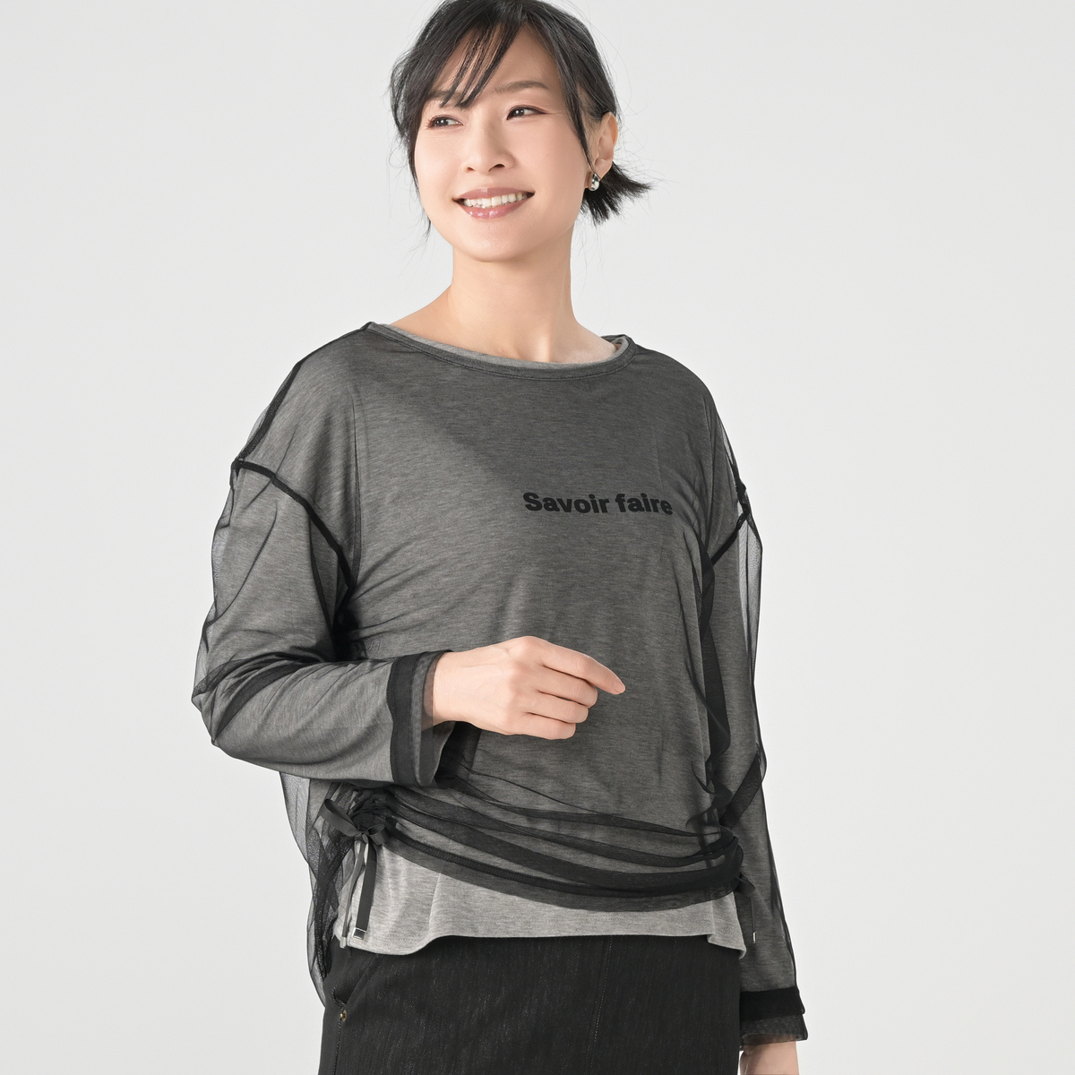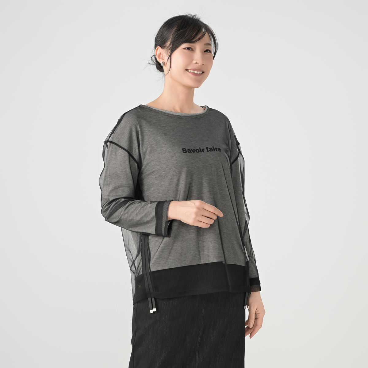 [商品内容] ・シアープルオーバー ・ロゴTシャツ <ロゴTシャツ> [商品寸法(ヌード)cm] サイズ バスト 着丈 S : 100(72〜80) 51.5 M : 104(79〜87) 51.5 L : 108(86〜94) 51.5 LL : 114(93〜101) 53.5 3L : 120(100〜108) 53.5 4L : 126(107〜115) 55.5 サイズ 裄丈 S : 71.5 M : 73 L : 74.5 LL : 76 3L : 77.5 4L : 79 [素材] グレー:ポリエステル80%、レーヨン15%、ポリウレタン5% オフホワイト、ブラック:ポリエステル65%、レーヨン30%、ポリウレタン5% <シアープルオーバー> [商品寸法(ヌード)cm] サイズ バスト 着丈 S : 104(72〜80) 61.5 M : 112(79〜87) 61.5 L : 116(86〜94) 61.5 LL : 122(93〜101) 63.5 3L : 128(100〜108) 63.5 4L : 134(107〜115) 65.5 サイズ 裄丈 S : 77.5 M : 79 L : 80.5 LL : 82 3L : 83.5 4L : 85 [素材]ポリエステル100% [お手入れ]洗濯機洗い可 [注意事項] ※商品寸法の誤差は多少発生します。ご了承下さい ※洗濯の際は裏返しにし、洗濯ネットを使用して下さい ※洗濯後はすぐに脱水し、形を整えて干して下さい。長時間水につけたままにしないで下さい ※直射日光や蛍光灯の影響で変色することがありますのでご了承下さい ※濃色製品は着用中の摩擦により色移りすることがあります。また、雨や汗等で濡れた状態で着用すると色移りすることがあります。その際はお早めに洗濯をして下さい ※素材の特性上、着用や洗濯・クリーニング時の摩擦により毛羽立ち、毛玉が発生します。その際はお早めに毛玉取り器等で手入れをして下さい ※洗濯やクリーニングにより徐々に色あせします。また、色落ちすることがありますので、他の物と分けて洗って下さい ※プリント部分を擦ったり、揉んだりしないで下さい 【中国製】