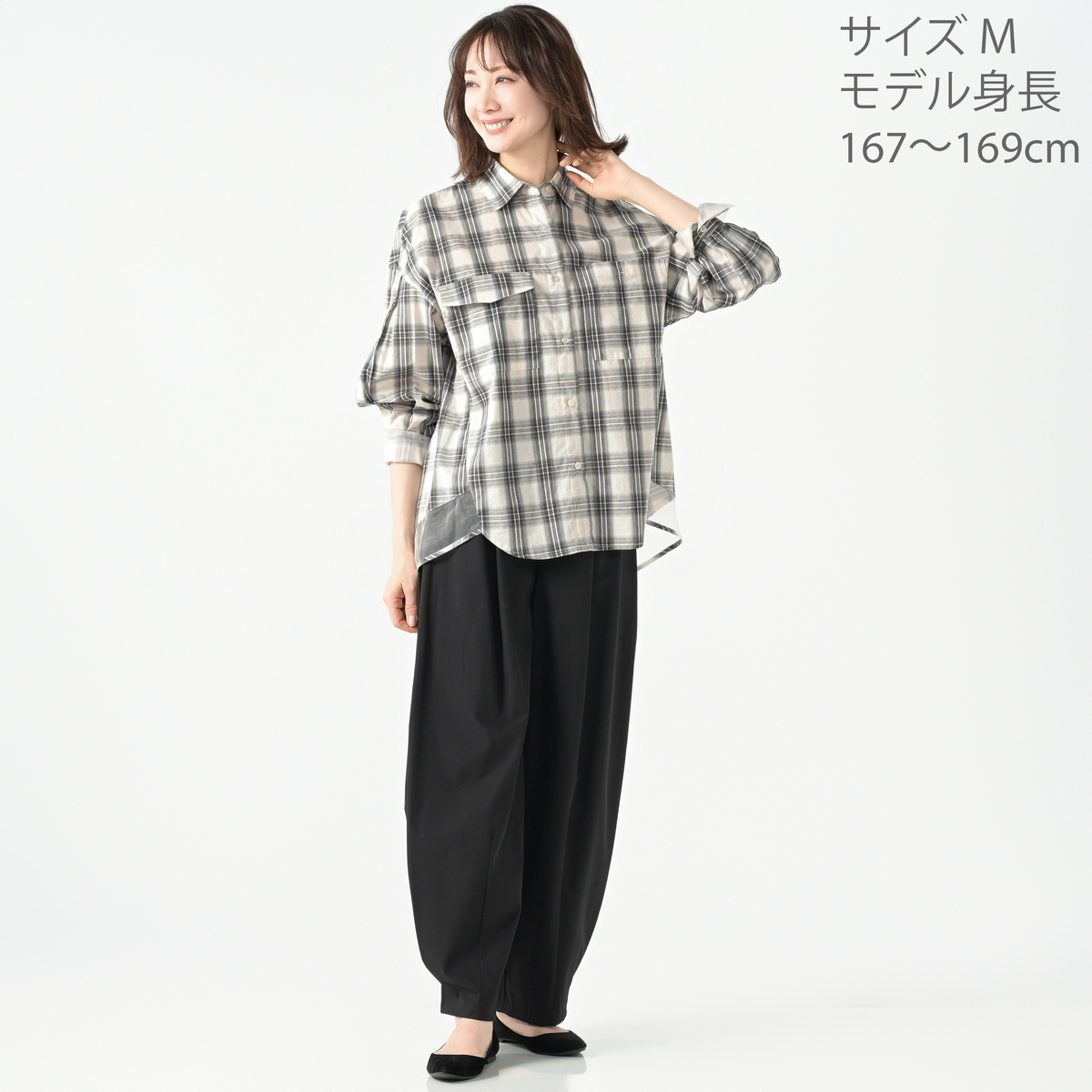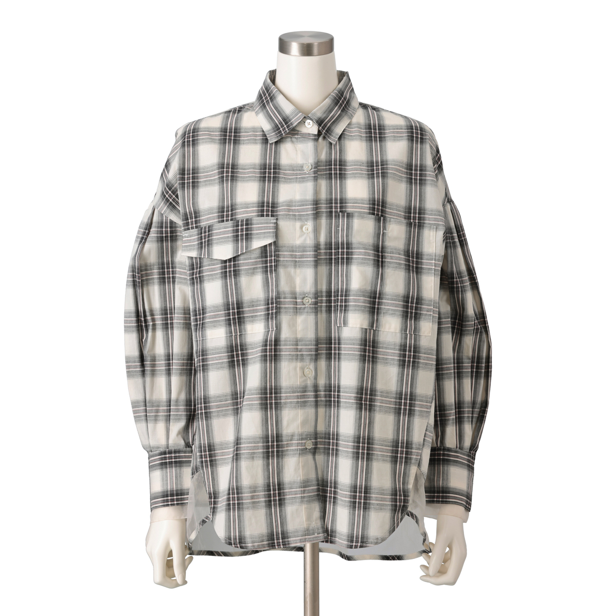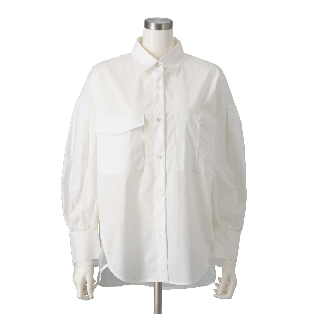 台衿付きシャツカラーや肩ヨークの切り替え、BOXタックで程よいボリューム感に。ドロップショルダーとパフ風の袖がふんわりとした印象を与え、ボタン留めのカフスがコーディネートにアクセントを添えます