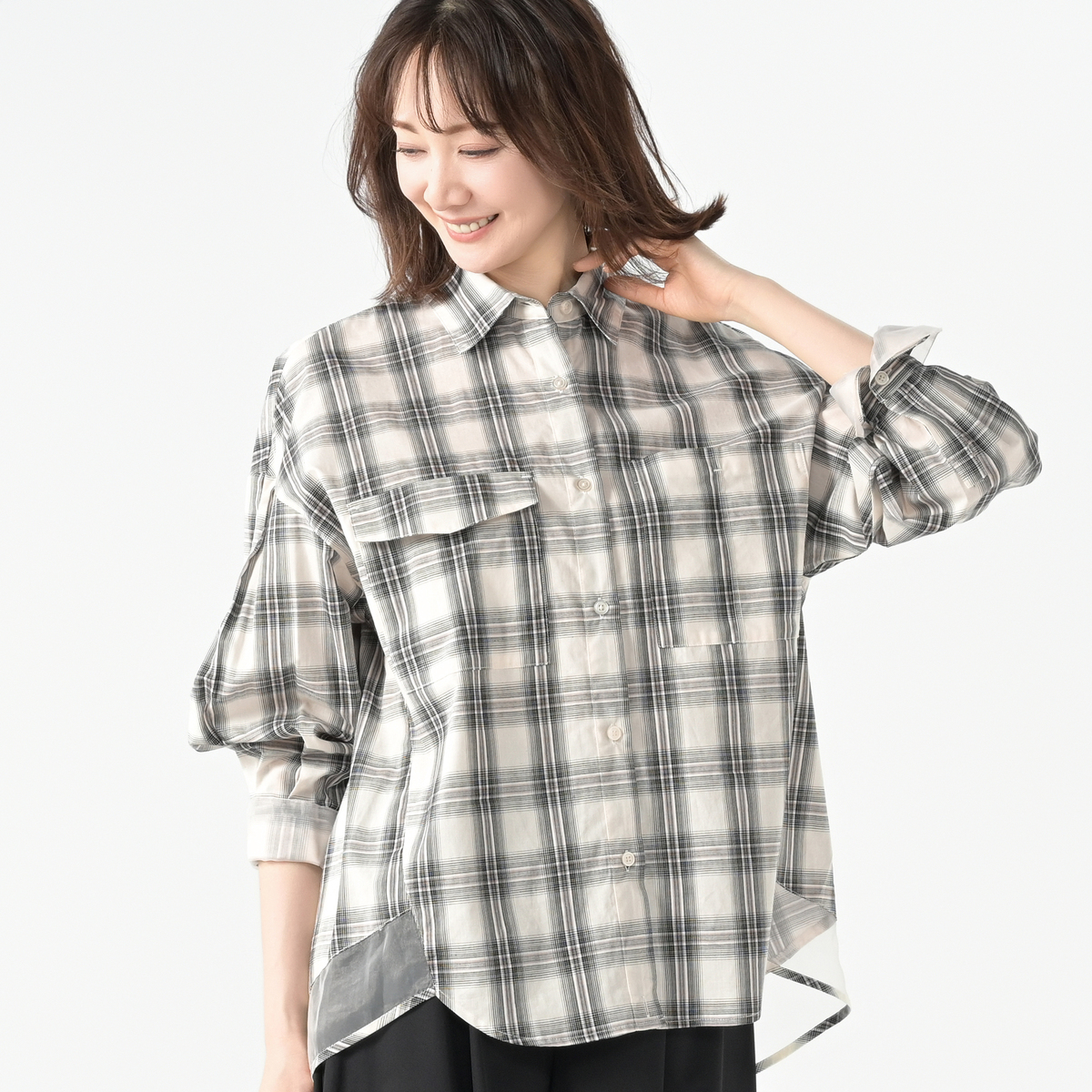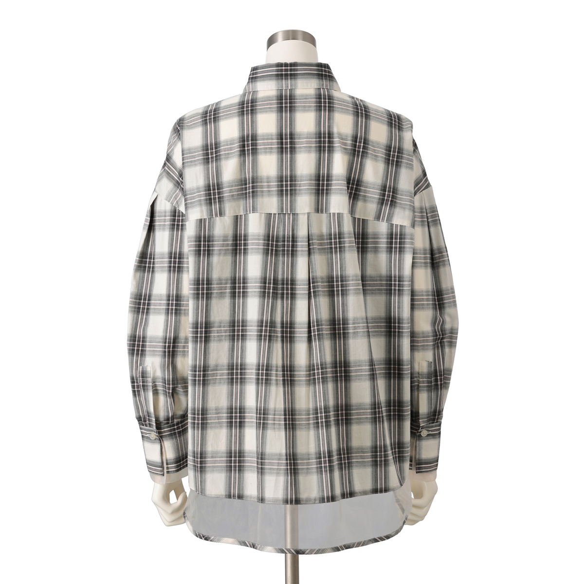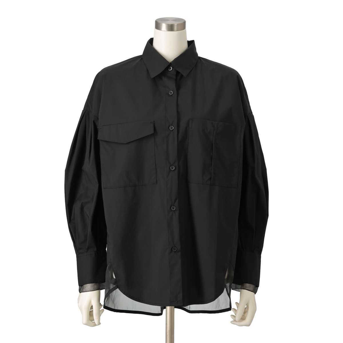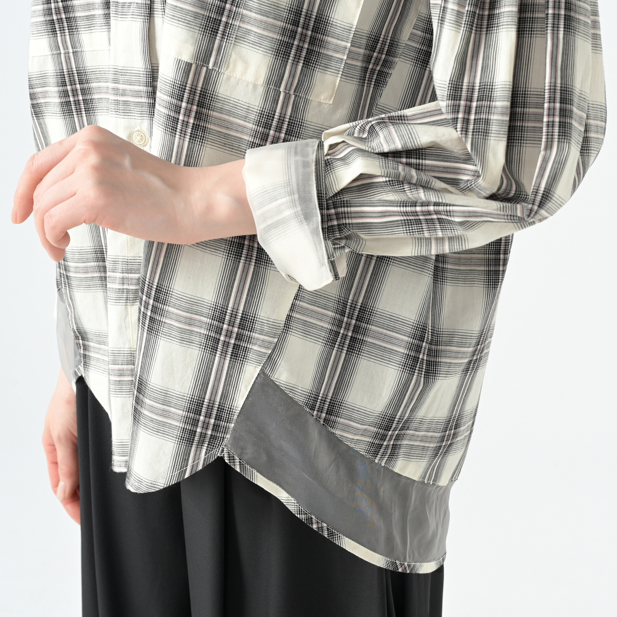 ゆったりしたシルエットのコンビネーションシャツ。身頃や衿などにはブロード系素材を、後ろ裾や、カフスは2重仕立てで内側には透ける素材を配置し、上品さと抜け感を両立します