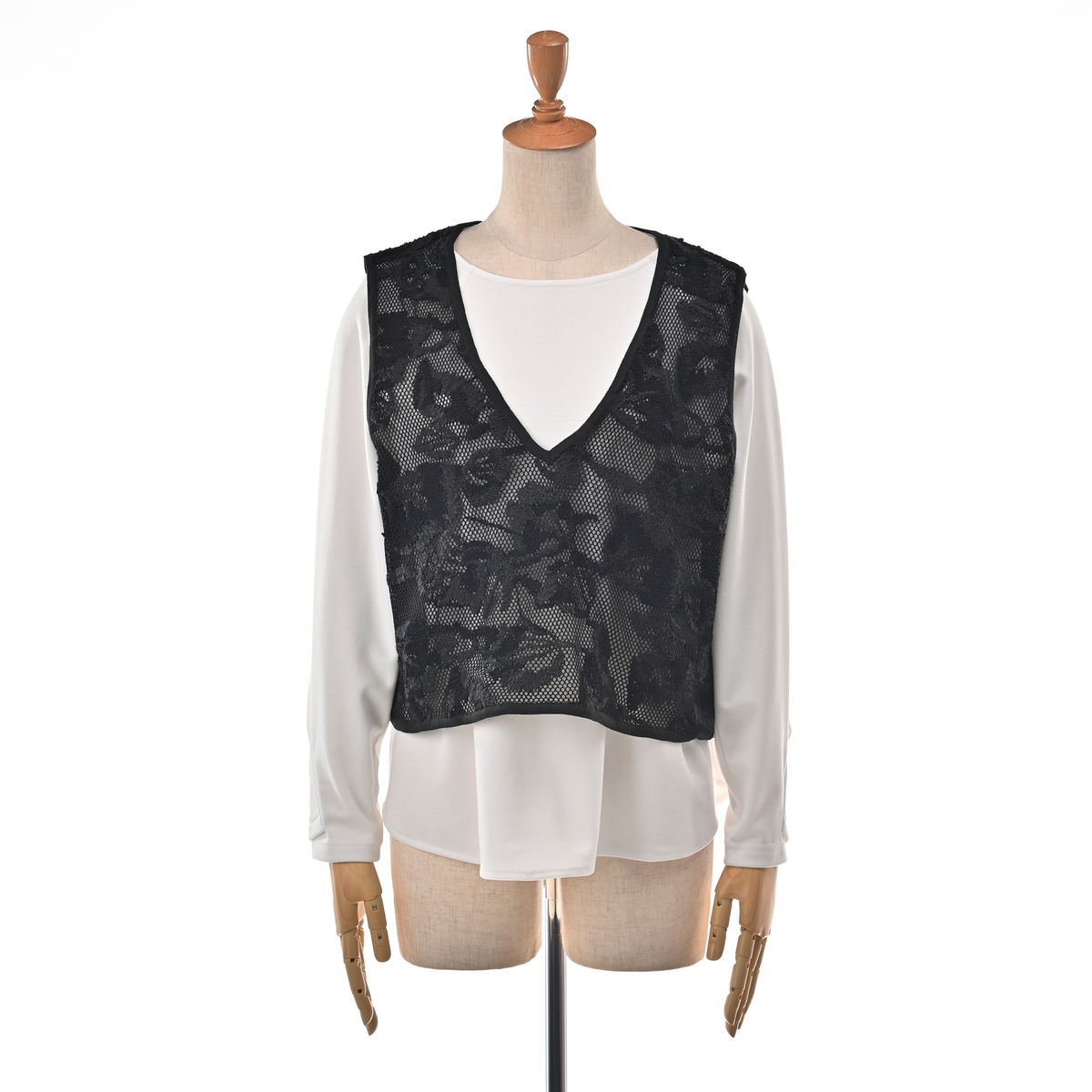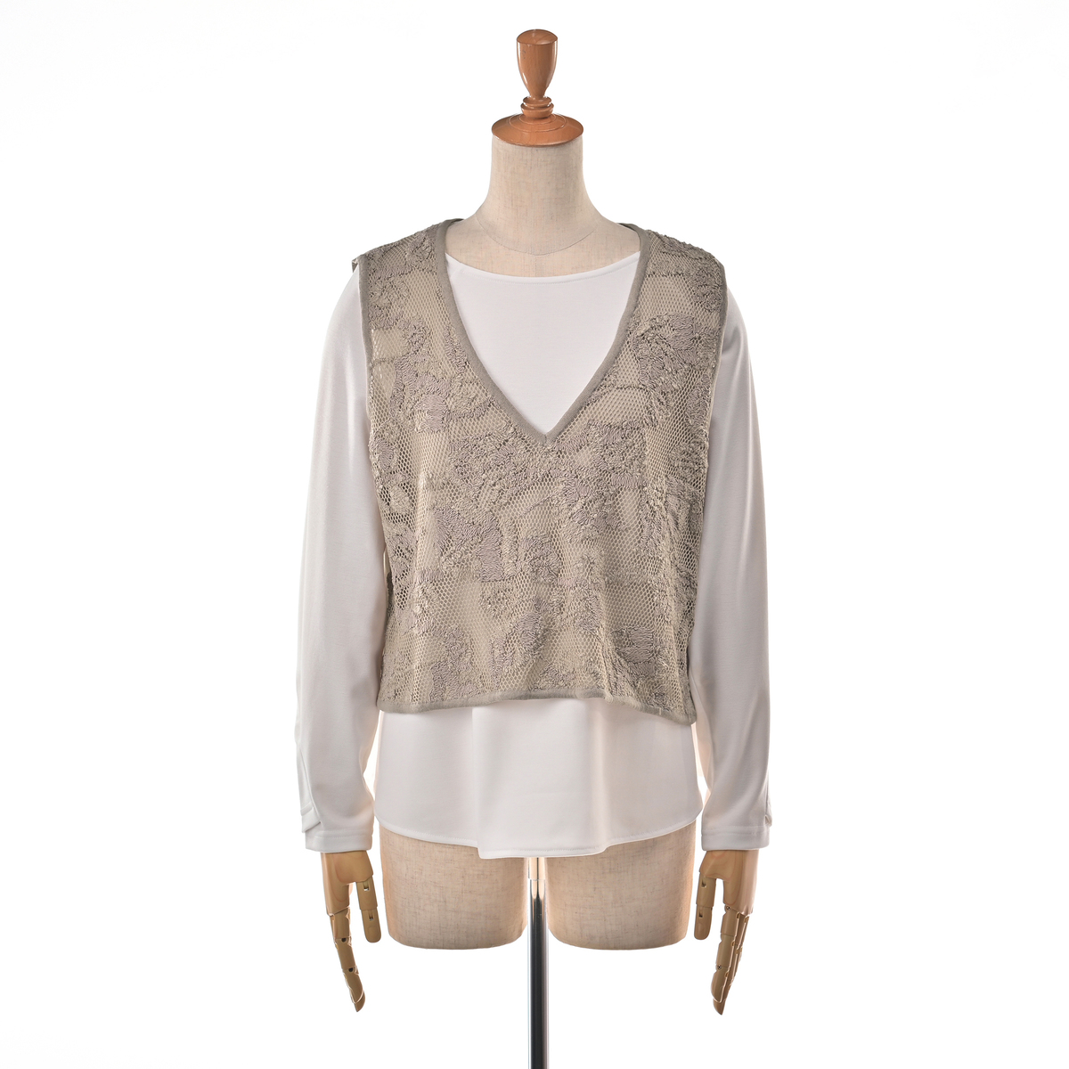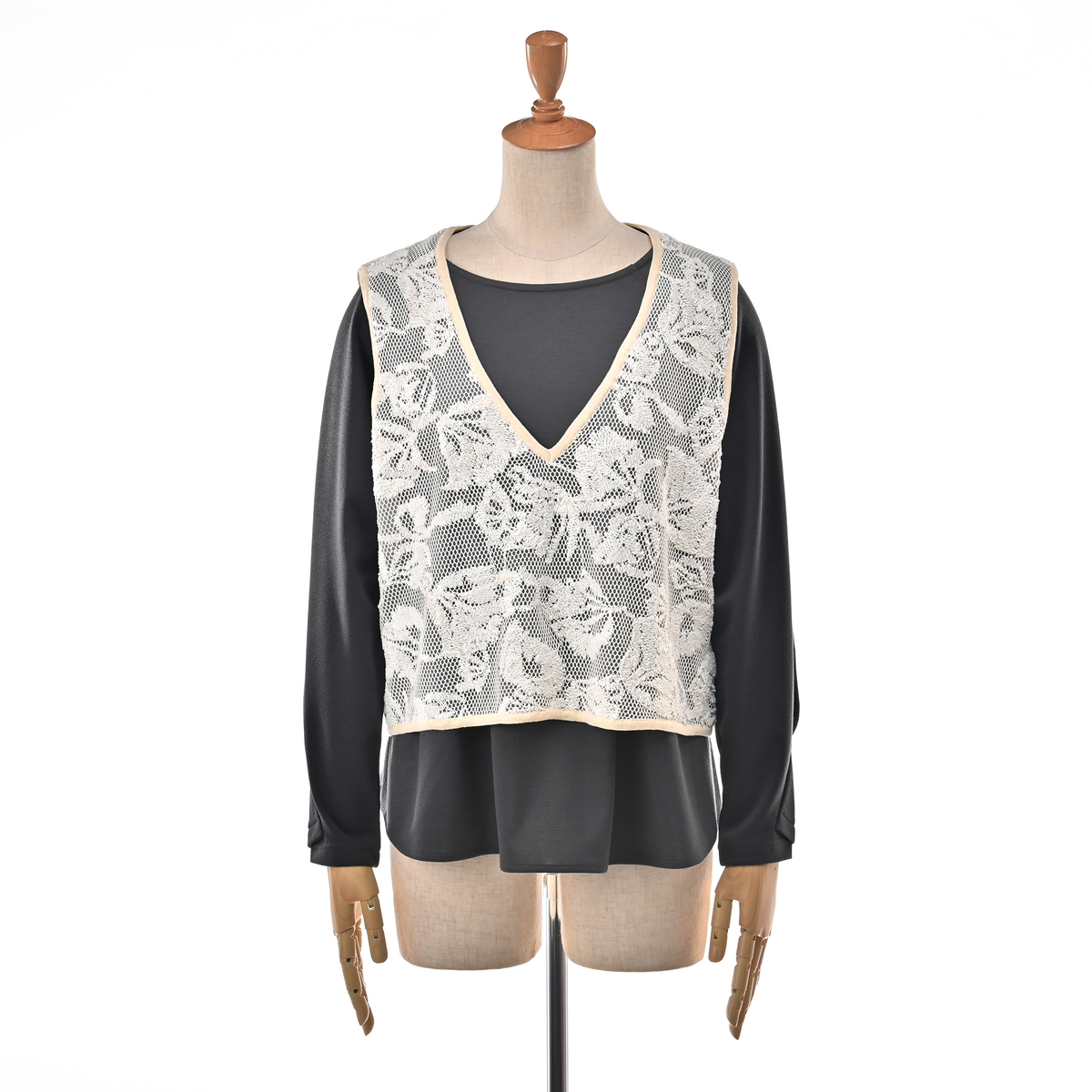 前身頃にはレース、後ろ身頃はニットのプルオーバーを使用のベストと、長袖のインナーカットソーのアンサンブル。ベストは深Vネックで、レース部分はメッシュ生地の土台に刺繍を施したレース素材です