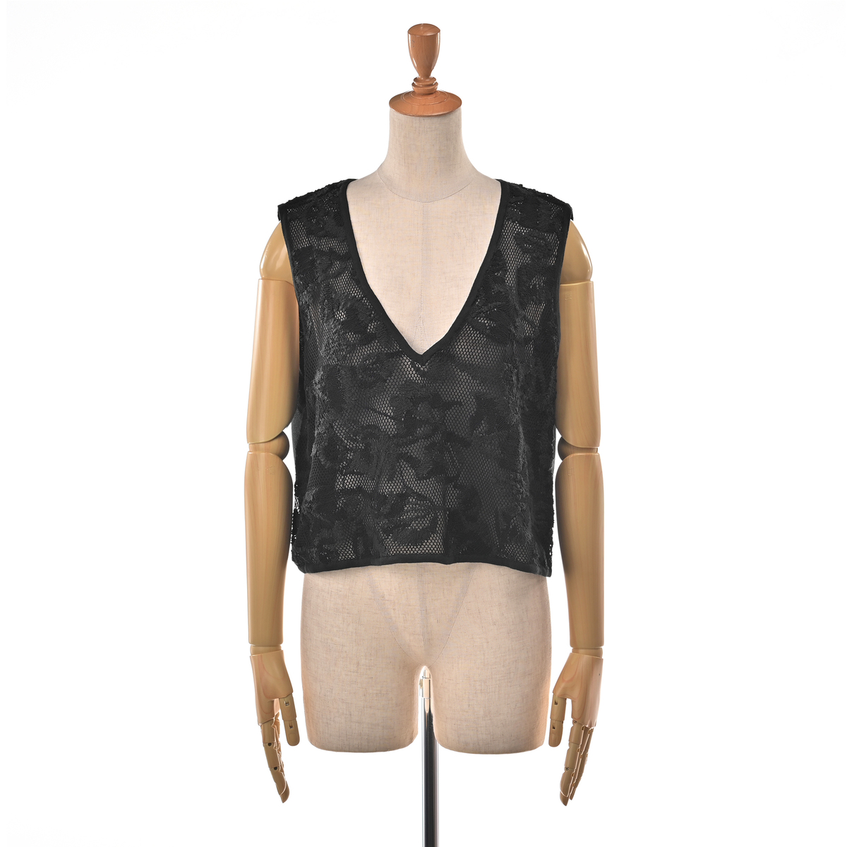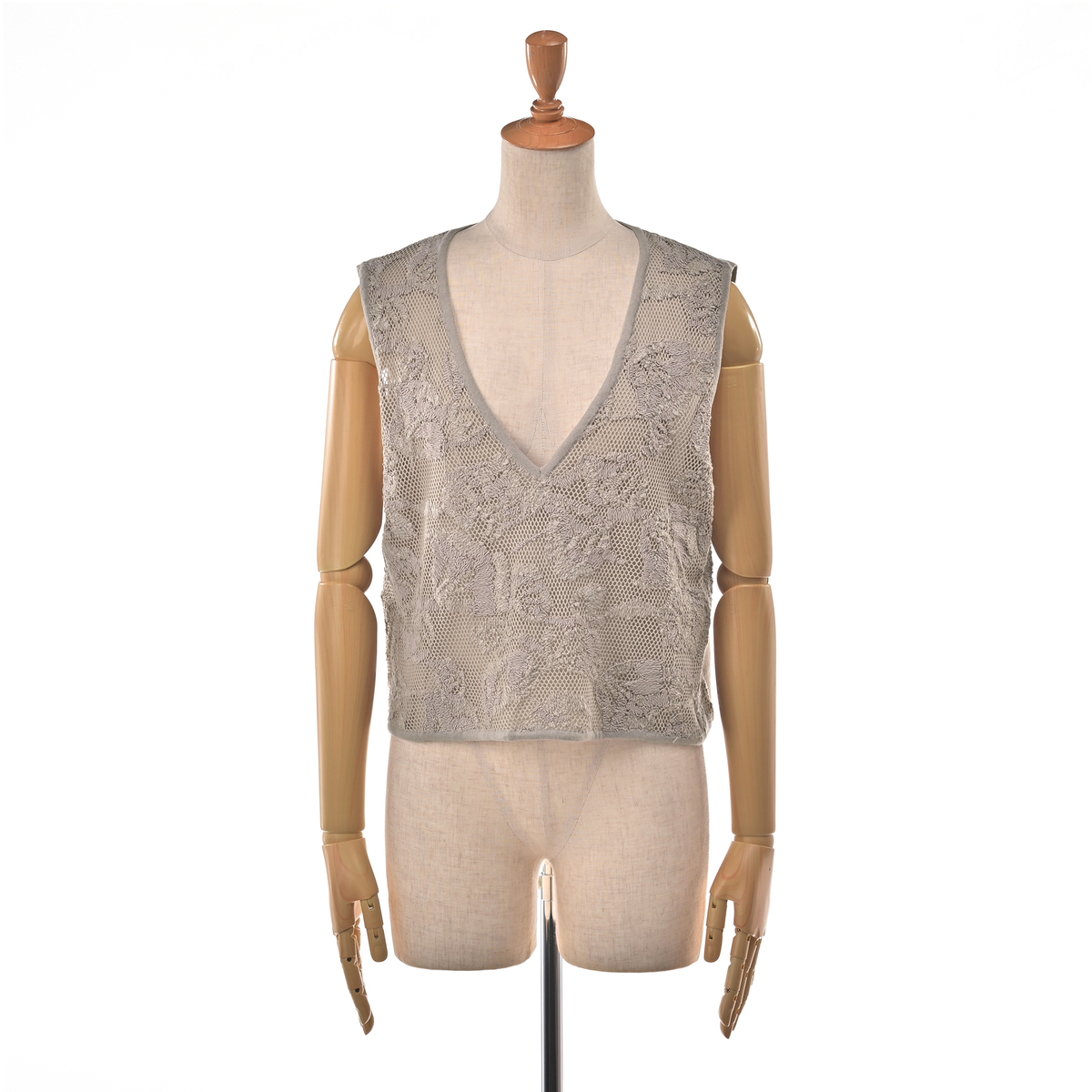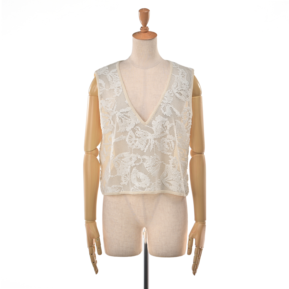 前身頃にはレース、後ろ身頃はニットのプルオーバーを使用のベストと、長袖のインナーカットソーのアンサンブル。ベストは深Vネックで、レース部分はメッシュ生地の土台に刺繍を施したレース素材です