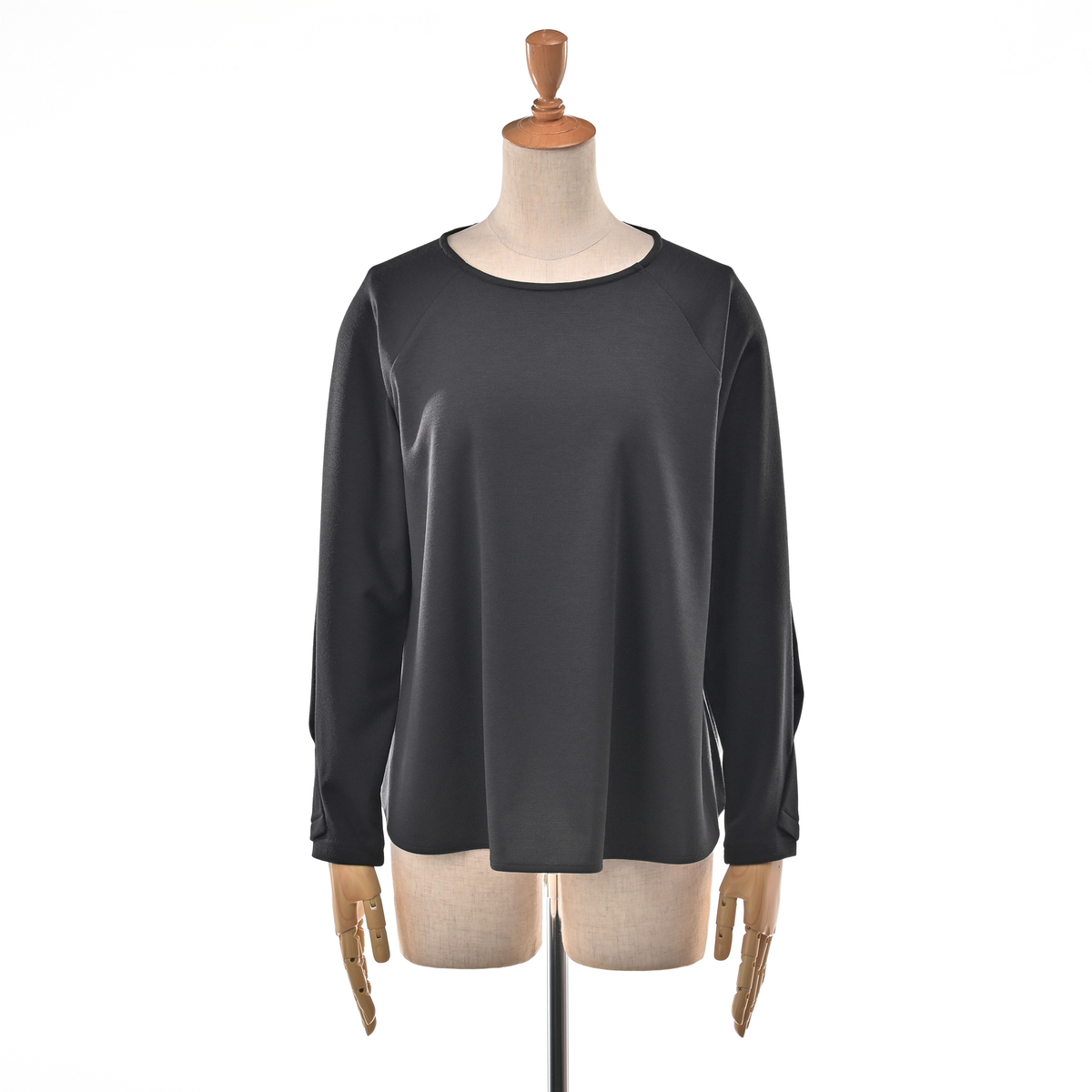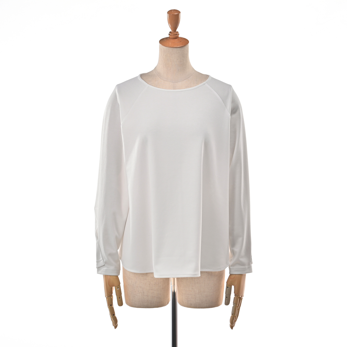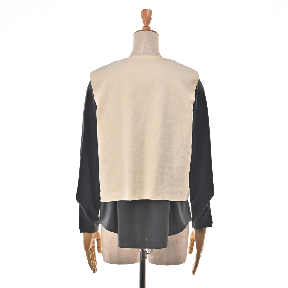 ベストの後身頃は総針ニットで、袖口、衿ぐりはリンキングのパイピング仕様に。インナーカットソーはややAラインシルエットの身頃で、ラグランスリーブの袖と袖口をタックで絞ったデザインです