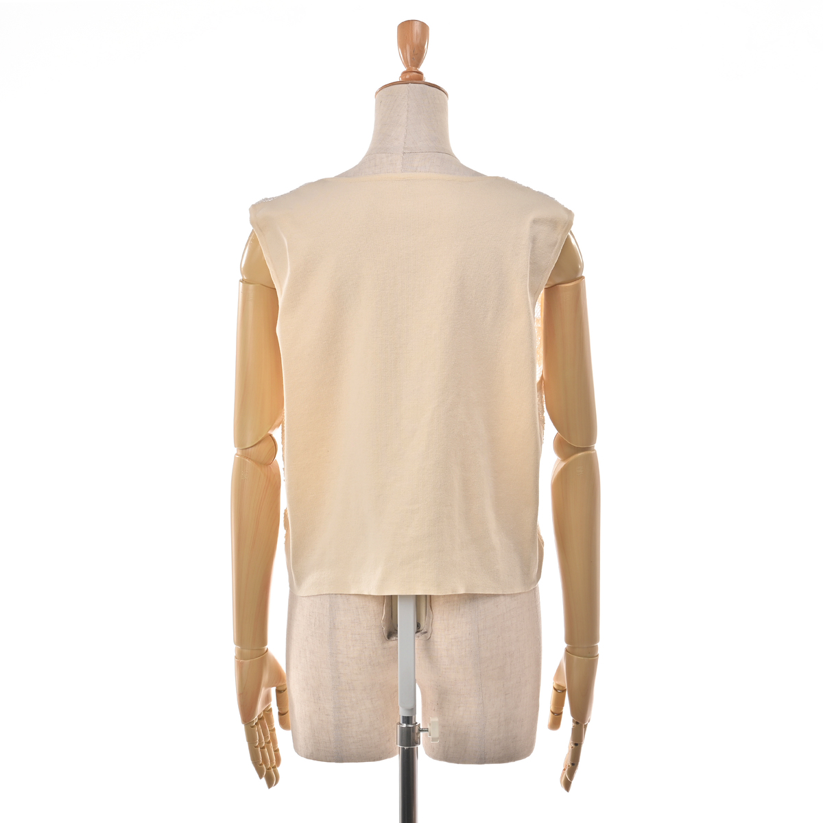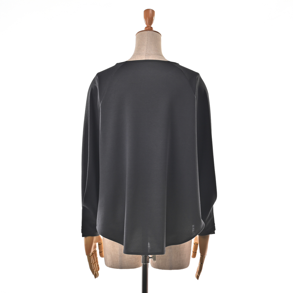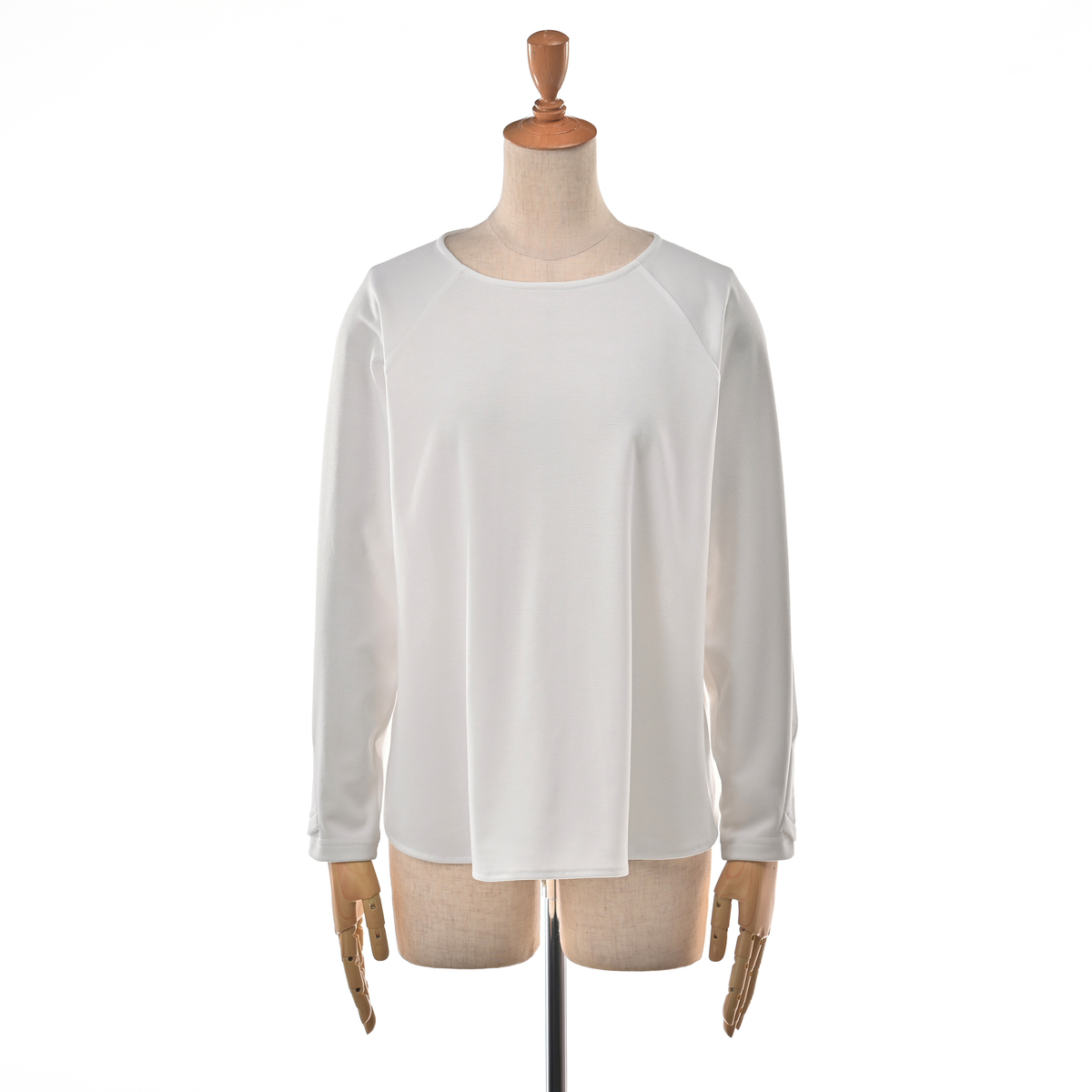 ベストの後身頃は総針ニットで、袖口、衿ぐりはリンキングのパイピング仕様に。インナーカットソーはややAラインシルエットの身頃で、ラグランスリーブの袖と袖口をタックで絞ったデザインです