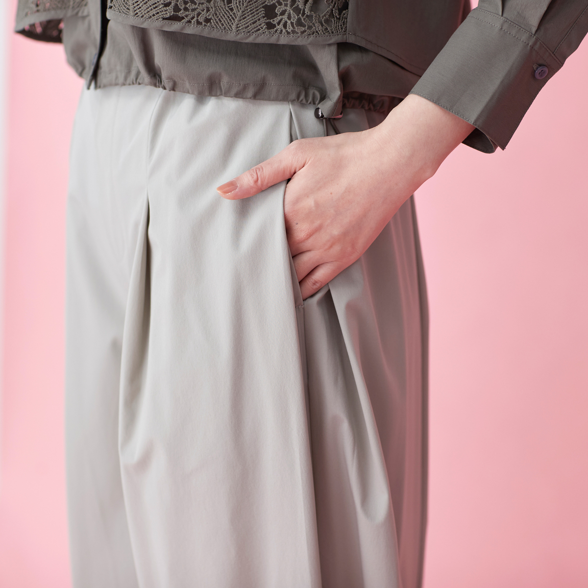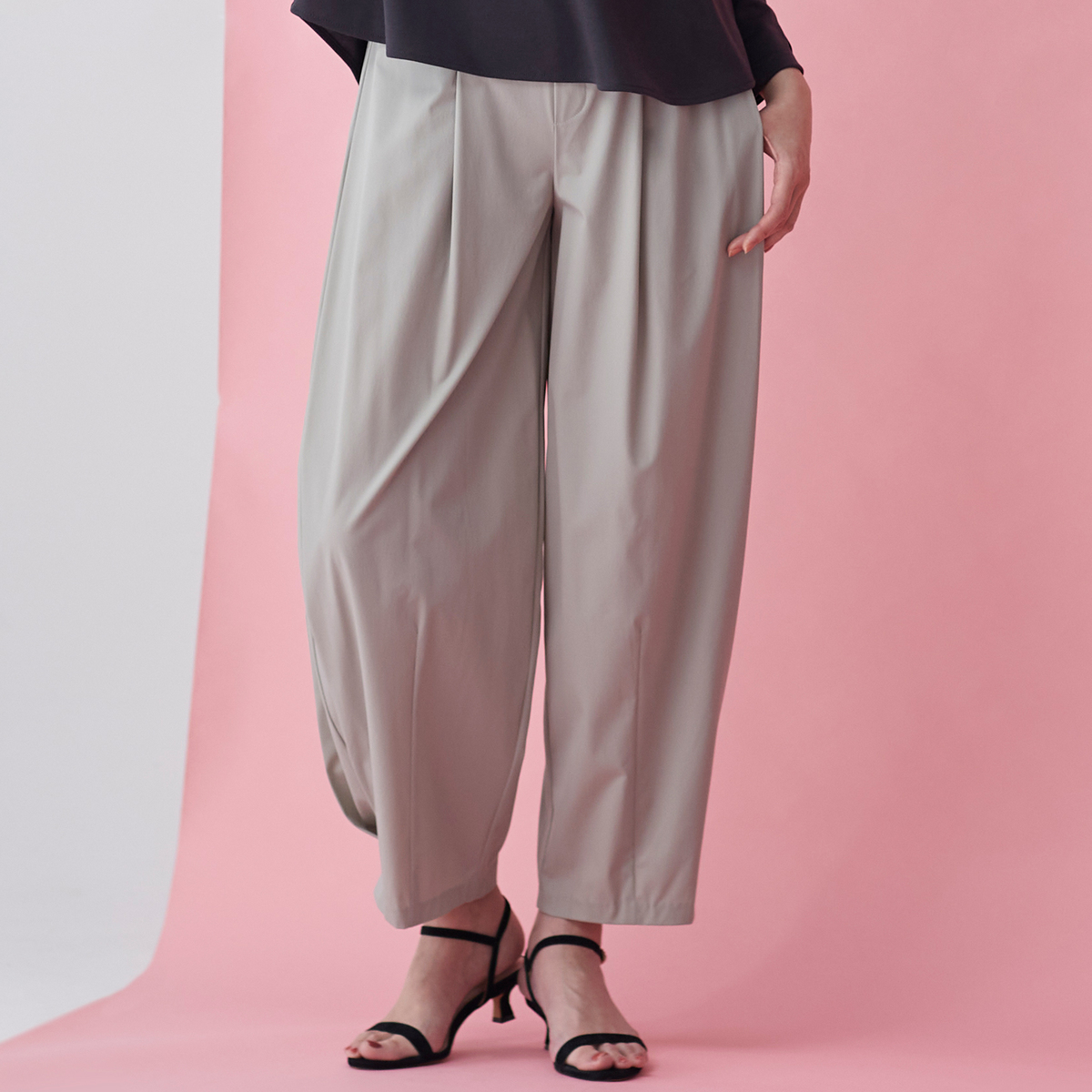 脇にボックスプリーツを入れ、バレルシルエットを意識したワイドパンツ。ウエストはゴム入りのプルオンタイプで、前のお腹周りはギャザーを入れずにすっきり仕上げています。縦横に伸びる2WAYストレッチ素材で軽くエアリーな風合いで、両脇にポケット付きです