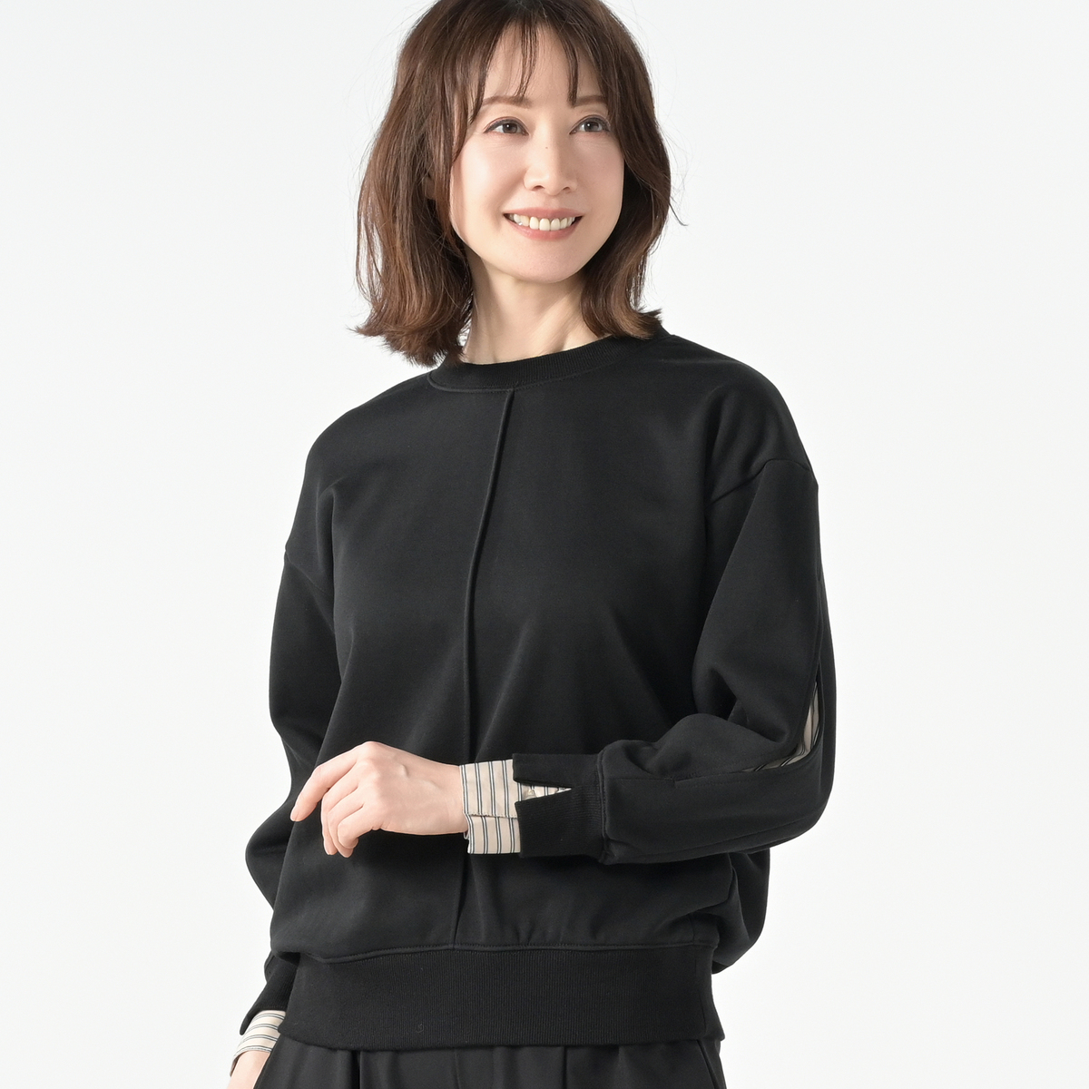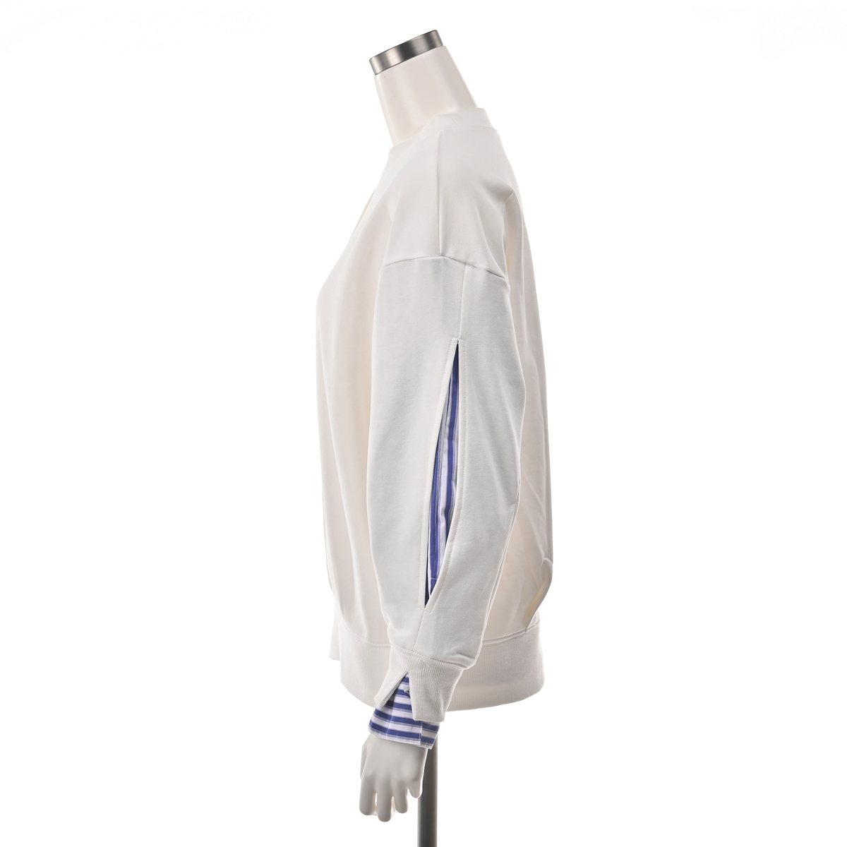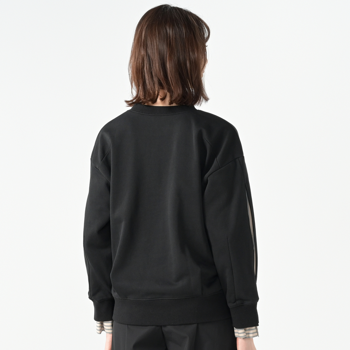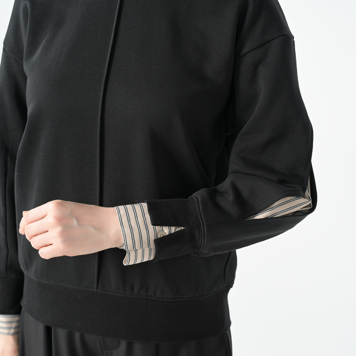 袖山のスリットからストライプシャツ素材を覗かせることで、フェイクレイヤードを楽しめるプルオーバー。リブ切替の袖口や衿ぐり、裾がスポーティな印象をプラス。前中心のピンタックが縦のラインを際立たせています
