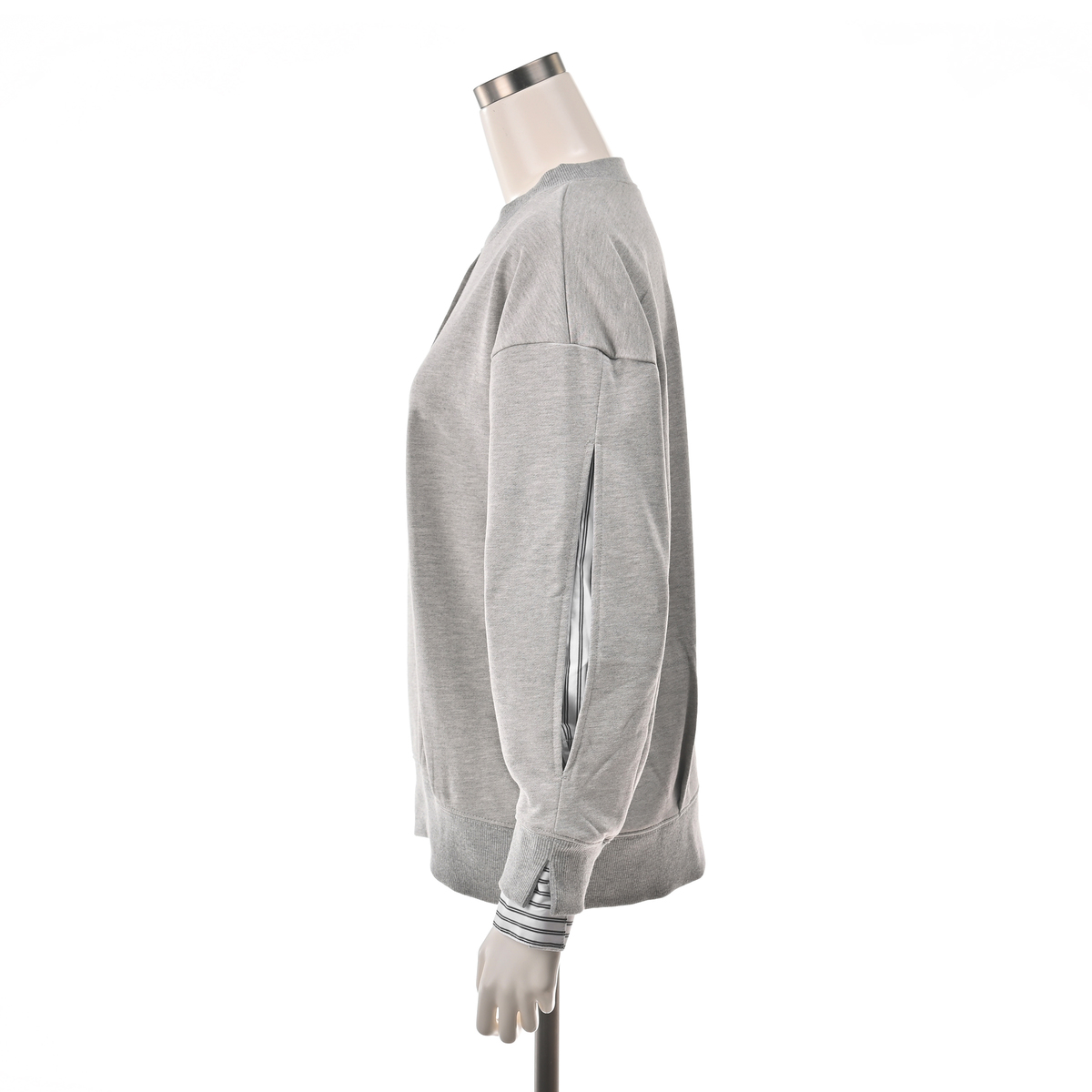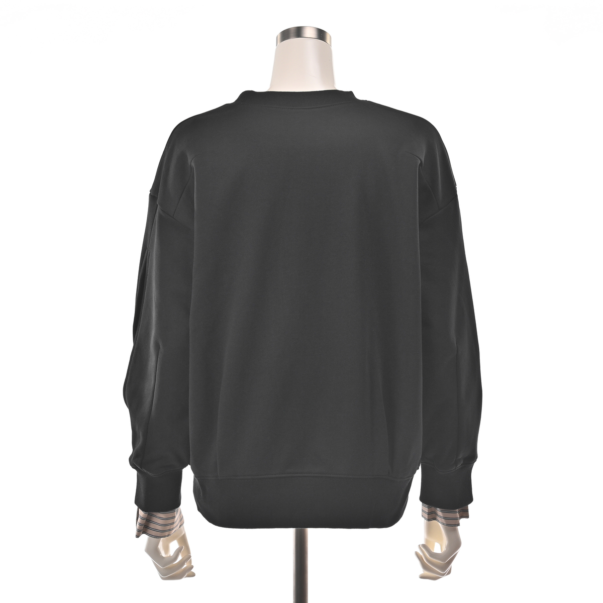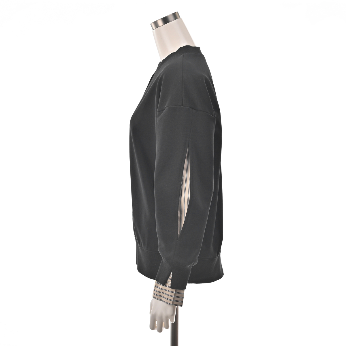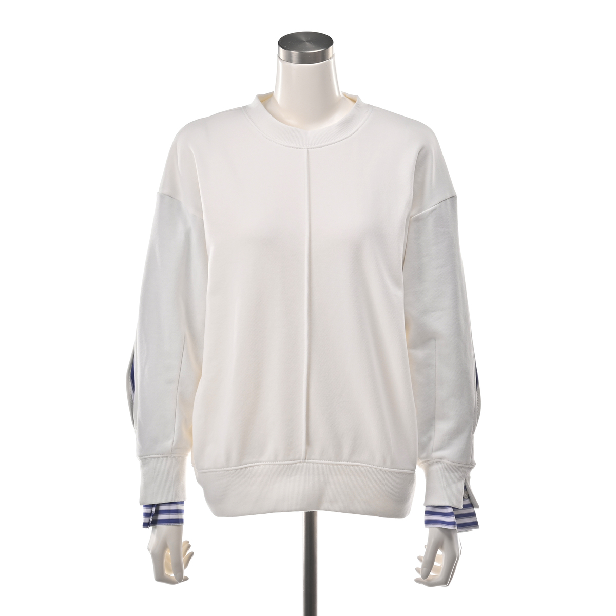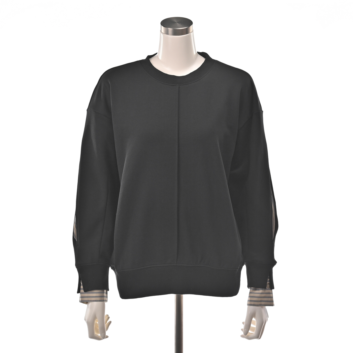 袖山のスリットからストライプシャツ素材を覗かせることで、フェイクレイヤードを楽しめるプルオーバー。リブ切替の袖口や衿ぐり、裾がスポーティな印象をプラス。前中心のピンタックが縦のラインを際立たせています