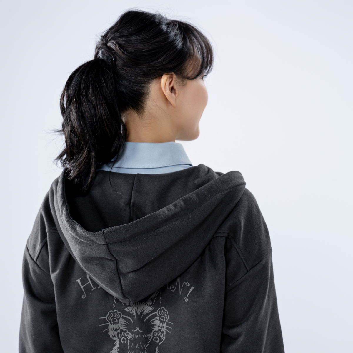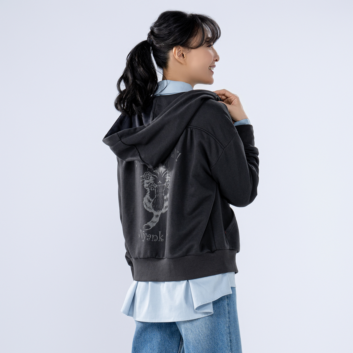 ほおづえダヤンの刺繍とプリントを組合せた、世界観を楽しめる裏毛パーカー。前後で異なるダヤンの表情をあしらい、ポケットには肉球のプリントを添えています。ゆったりとしたフードと使い勝手のよいカンガルーポケットで快適な着心地に。ふわりとした厚みのある裏毛素材は汗を吸いやすく、裏パイルが空気を含んで適度に暖かい仕上がりです