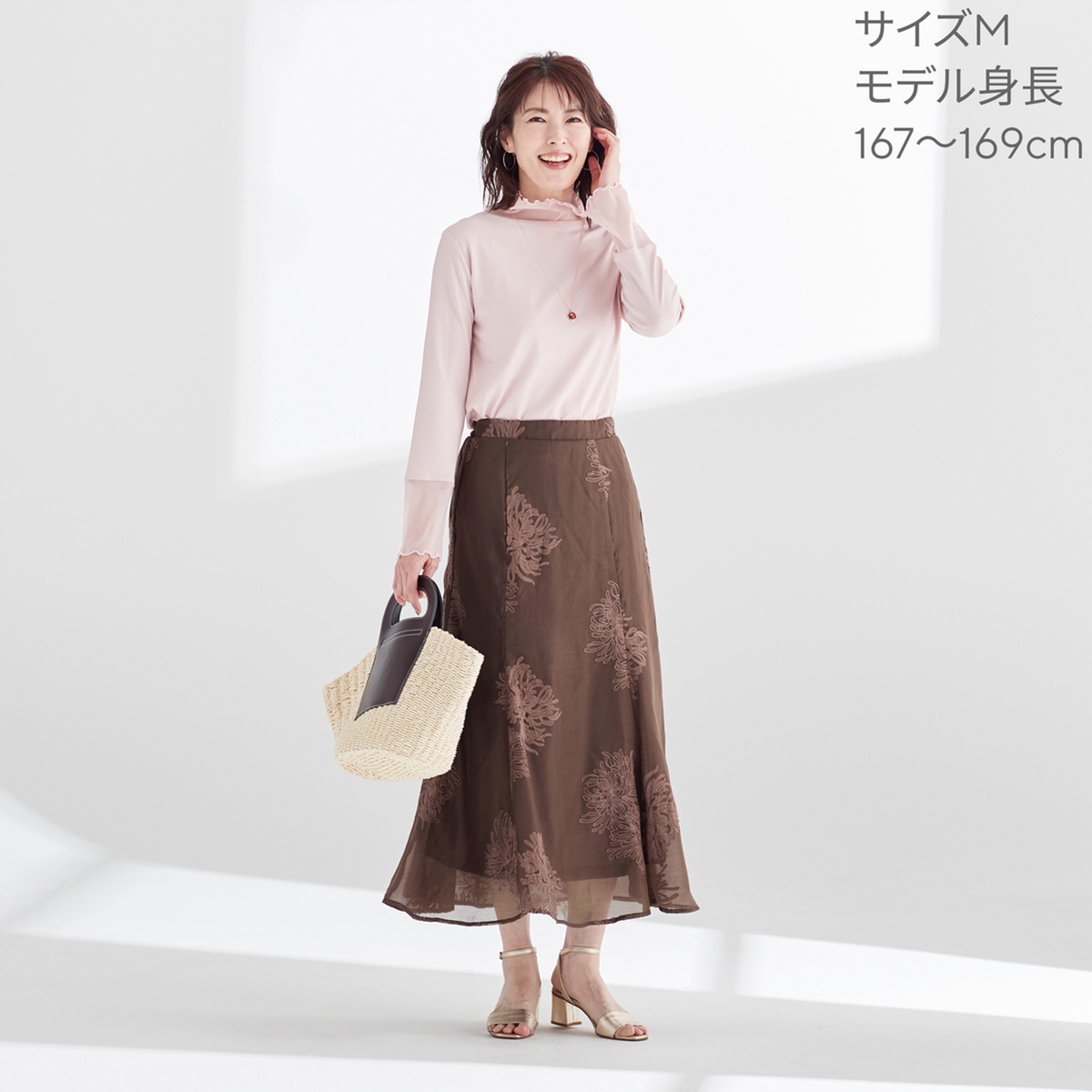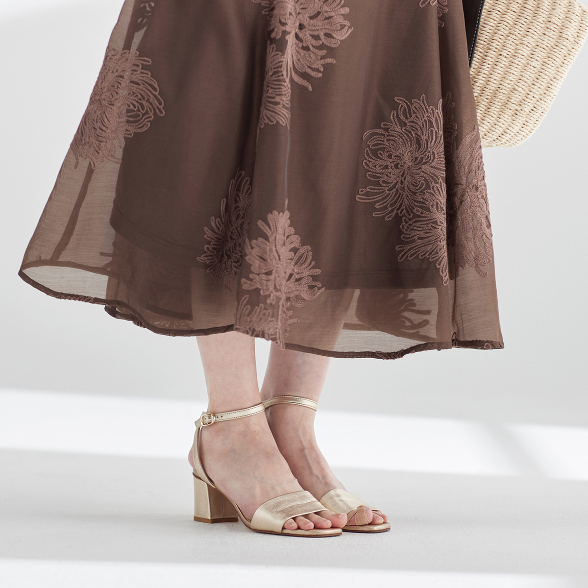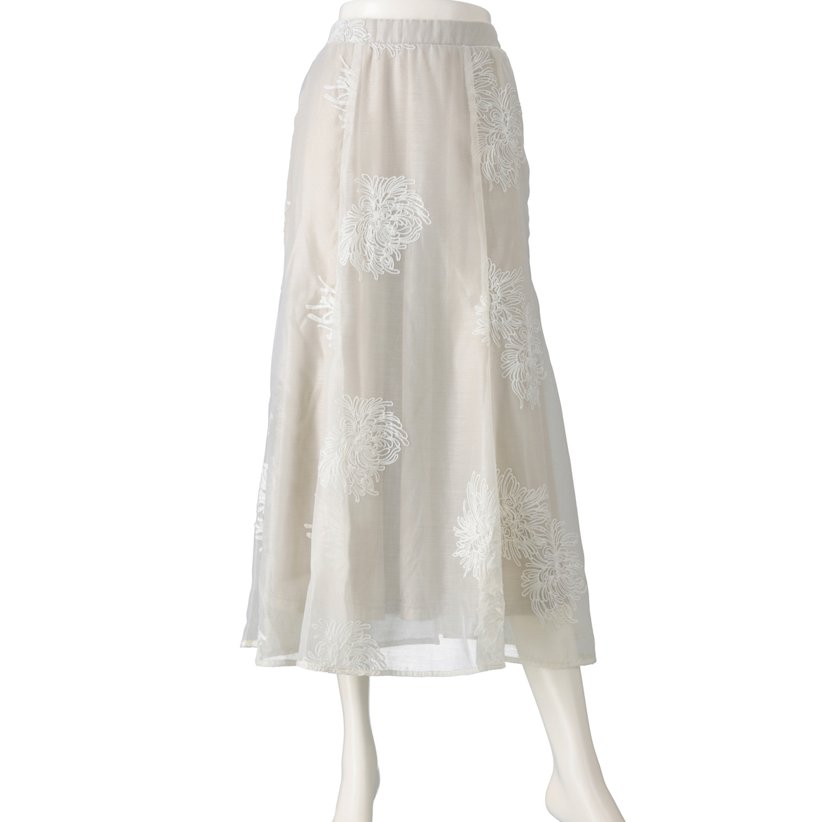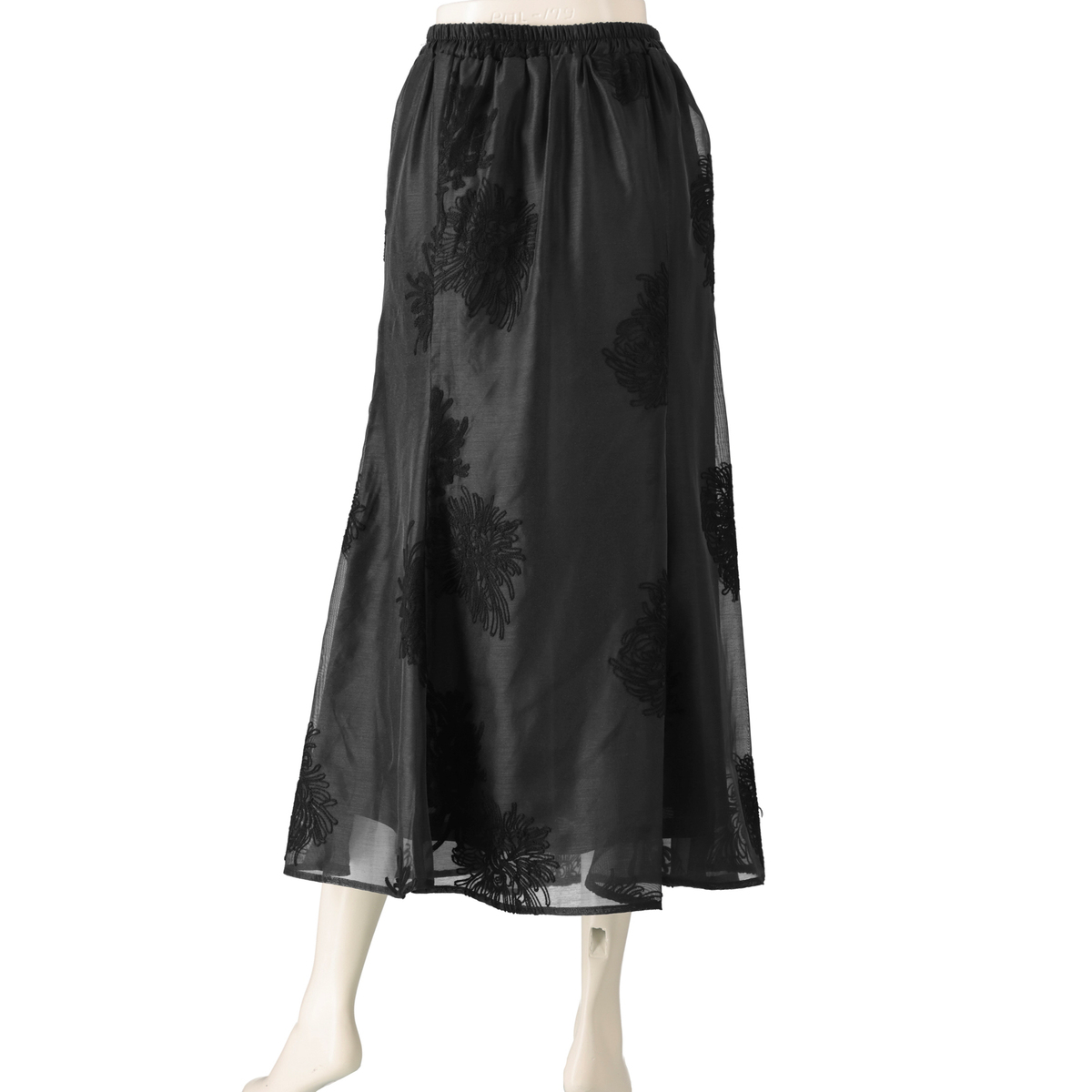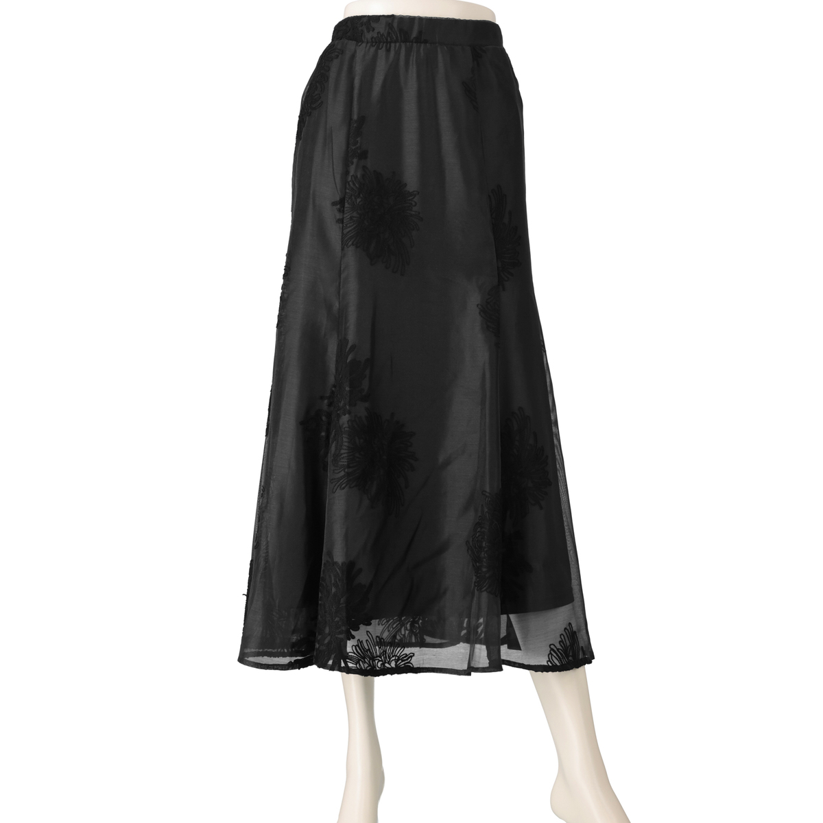 花柄刺繍が美しい、シアー素材のスカートです。6枚剥ぎのマーメードシルエットが上品さを引き立て、軽やかな印象を与えます