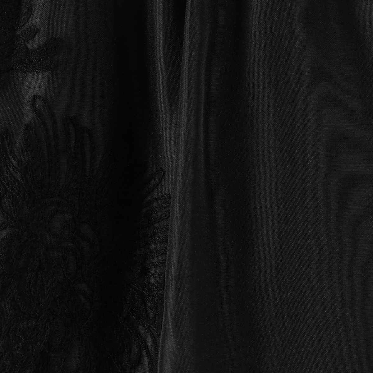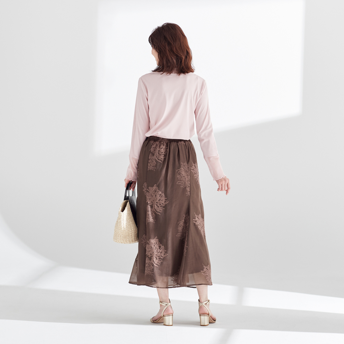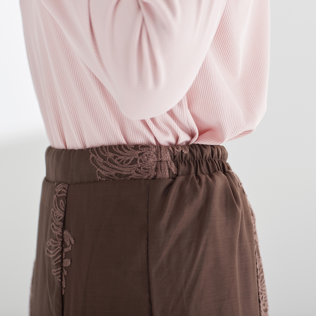 裏地はストレッチがきいているので穿きやすく、優しいニュアンスのコード刺繍が上品な透け感のシアー素材に映え、コーディネートに個性を添えます