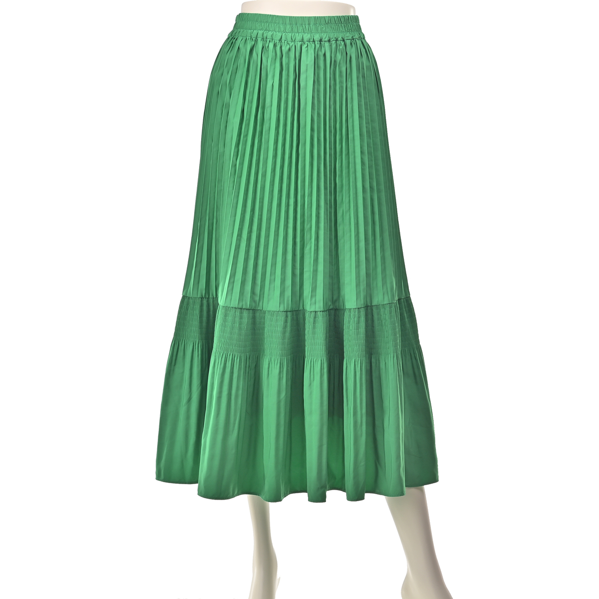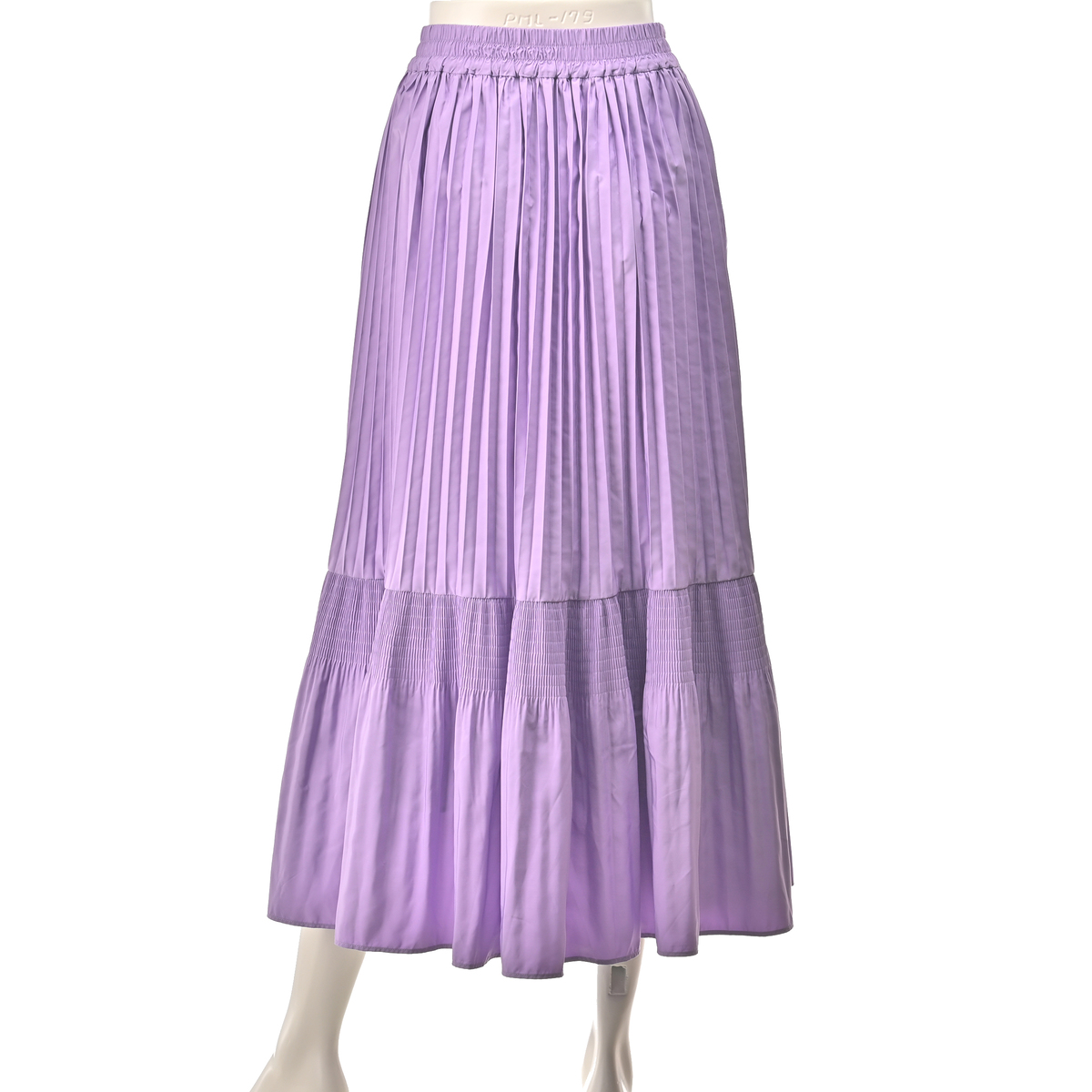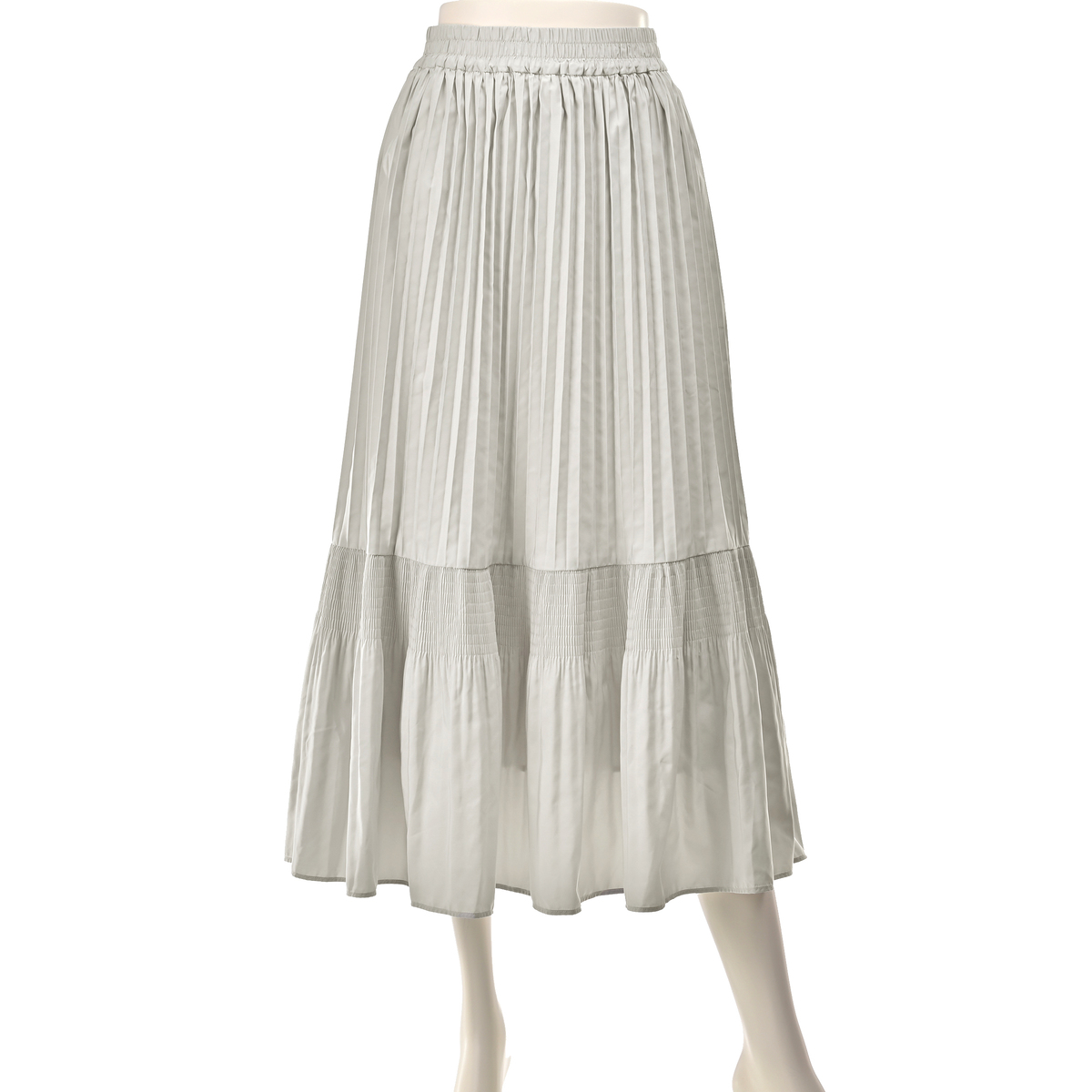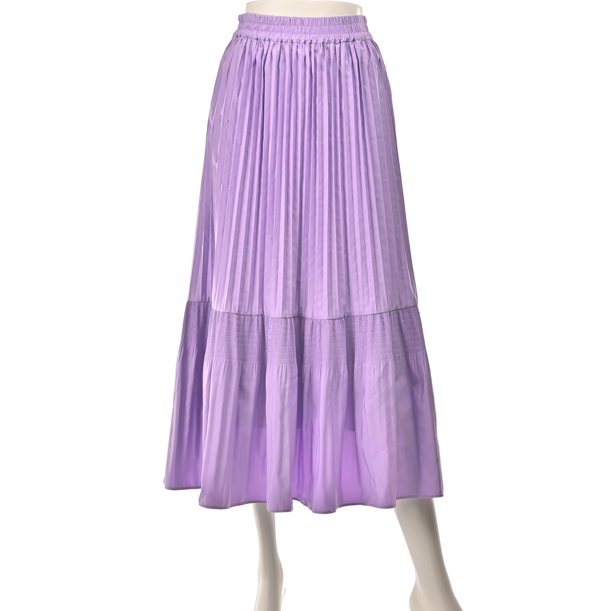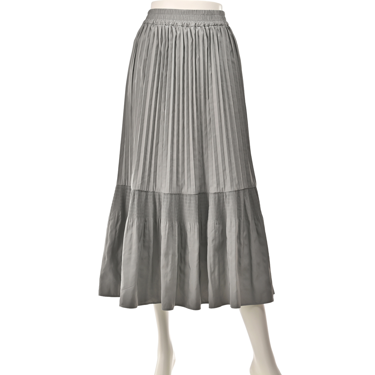 アコーディオンプリーツとマジョリカプリーツをミックスさせてデザイン。動きに合わせて表情を変えてくれる、ウエスト総ゴム仕様のプリーツスカートです