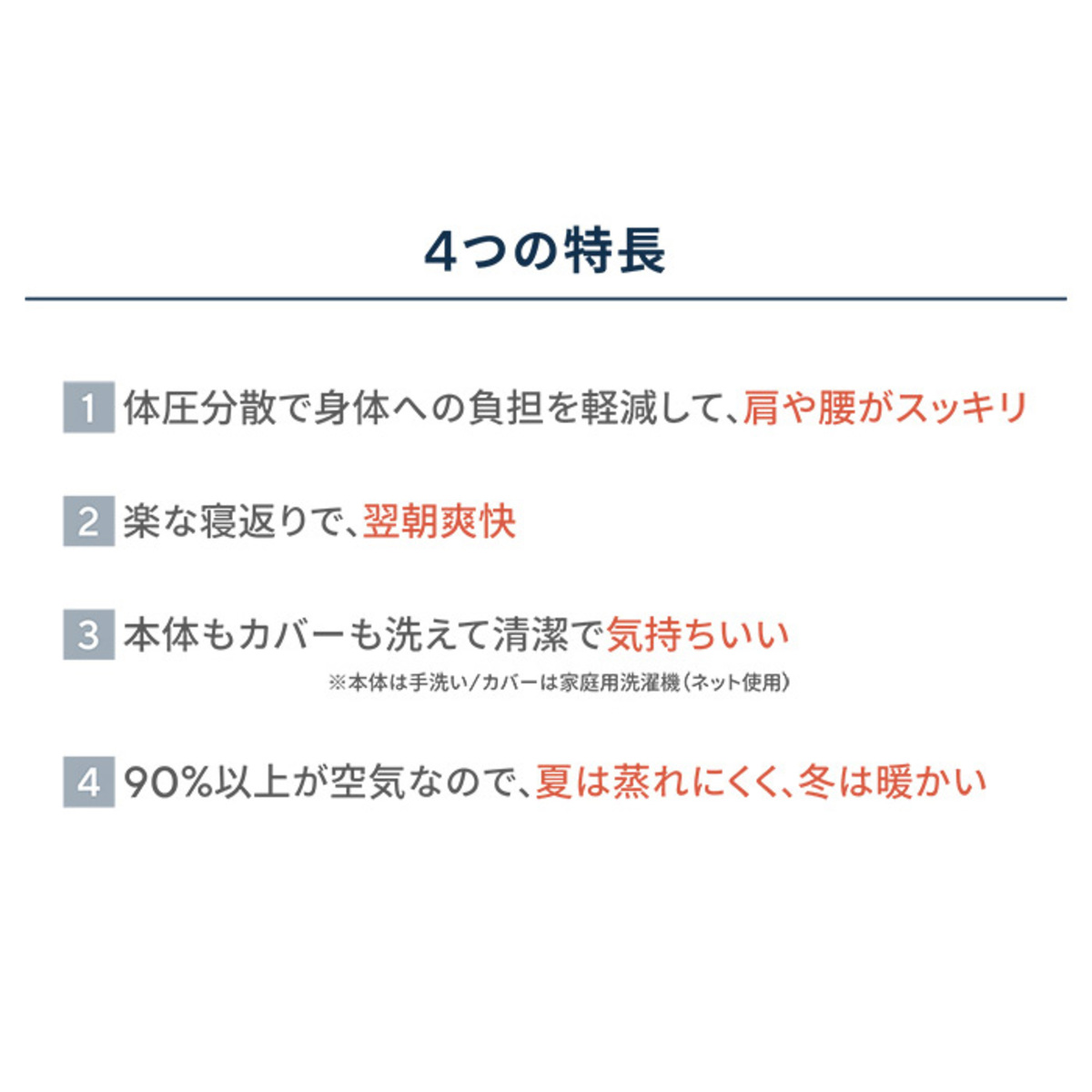 エアウィーヴの独自素材・エアファイバー(R)の適度な反発力で身体全体をしっかり支え、腰の沈み込みを防ぐことで、楽な寝返りをサポートします