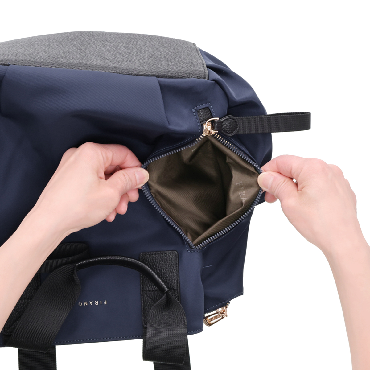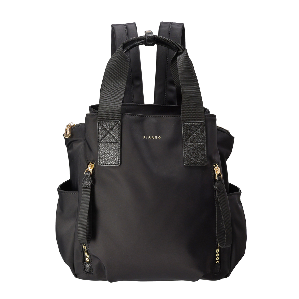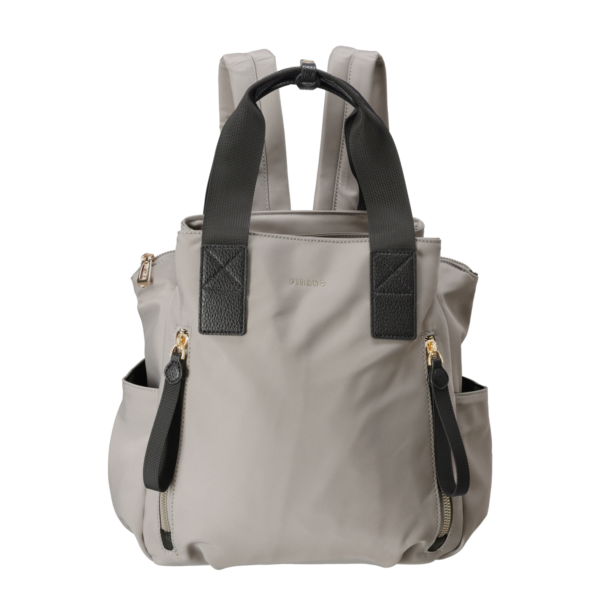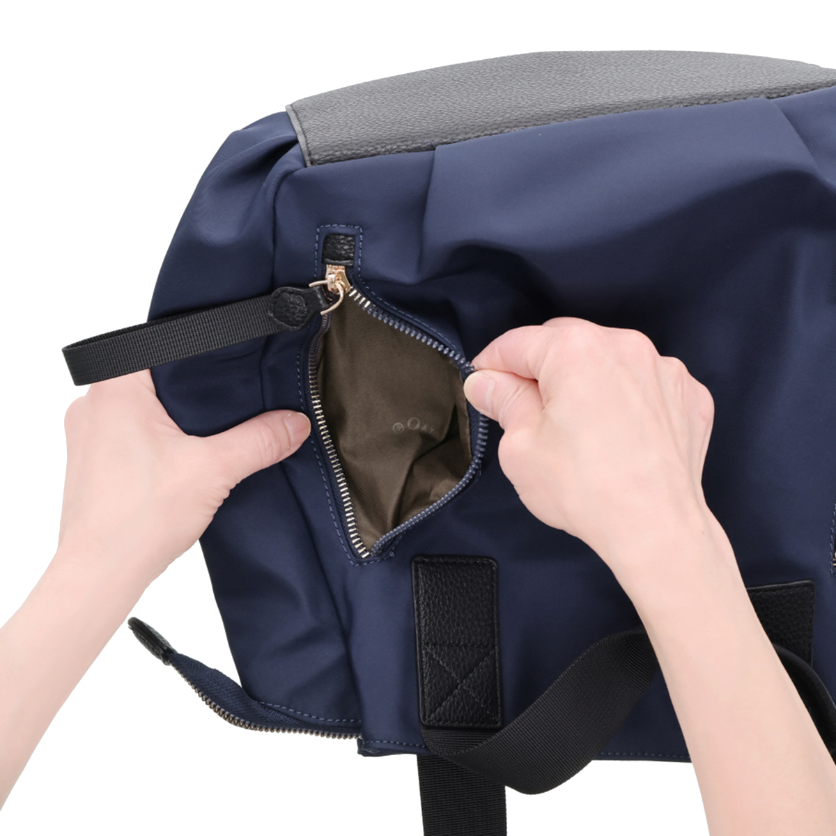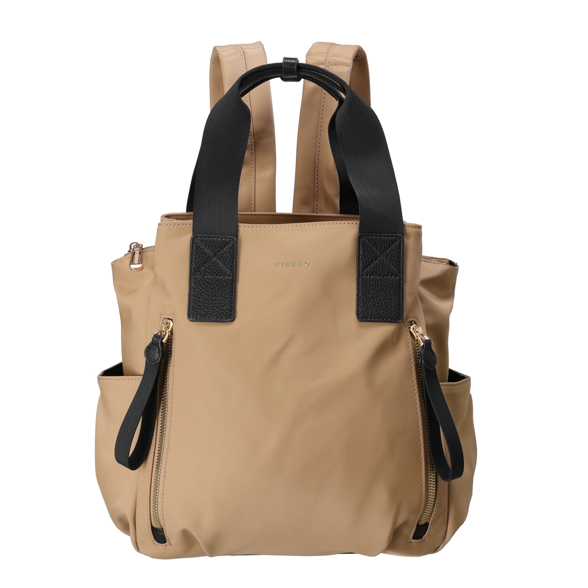 撥水ナイロンと合成皮革を表地にコンビ使いした、上品な印象のリュックです。前後のポケットと中央のファスナー収納で荷物を整理しやすく、ベルトハンドル付きでハンドバッグとしても使用可能。通勤や休日のお出かけにもおすすめです