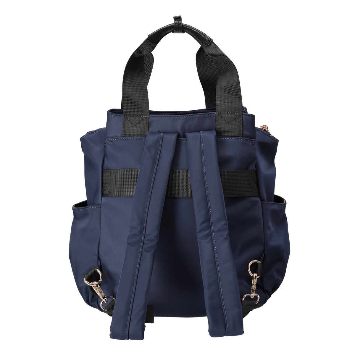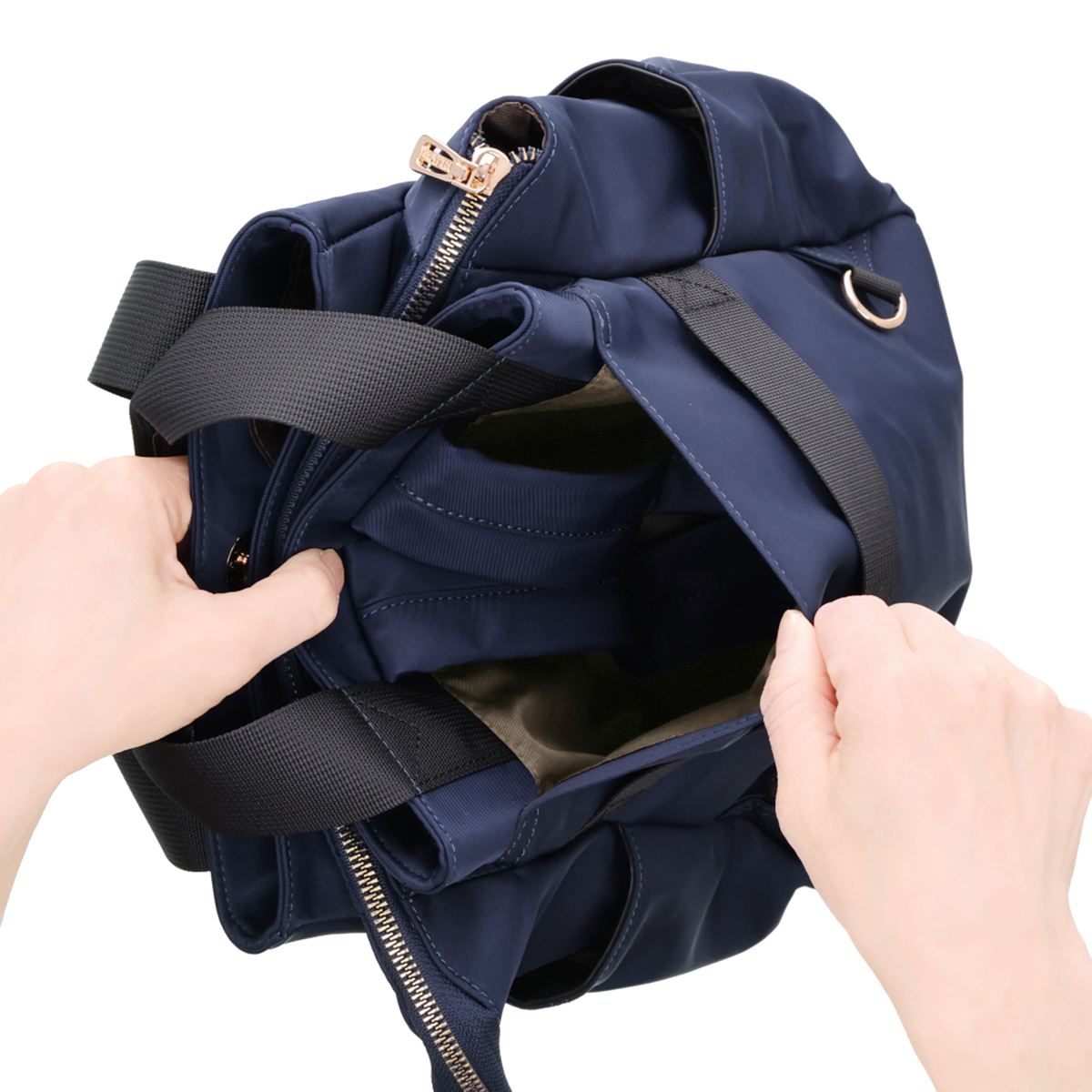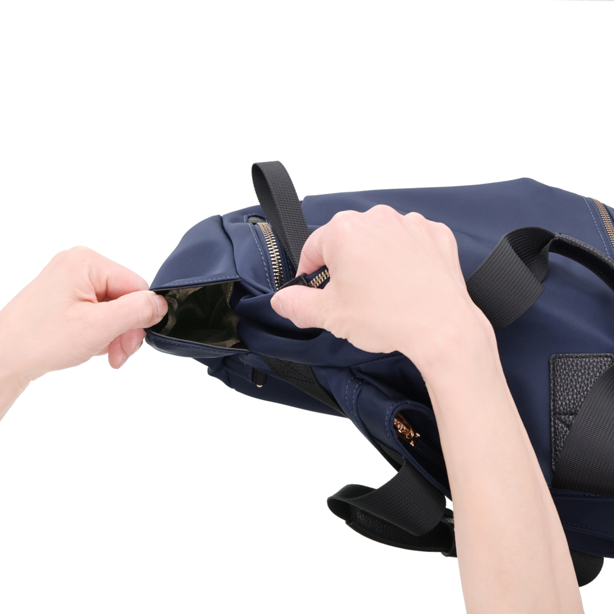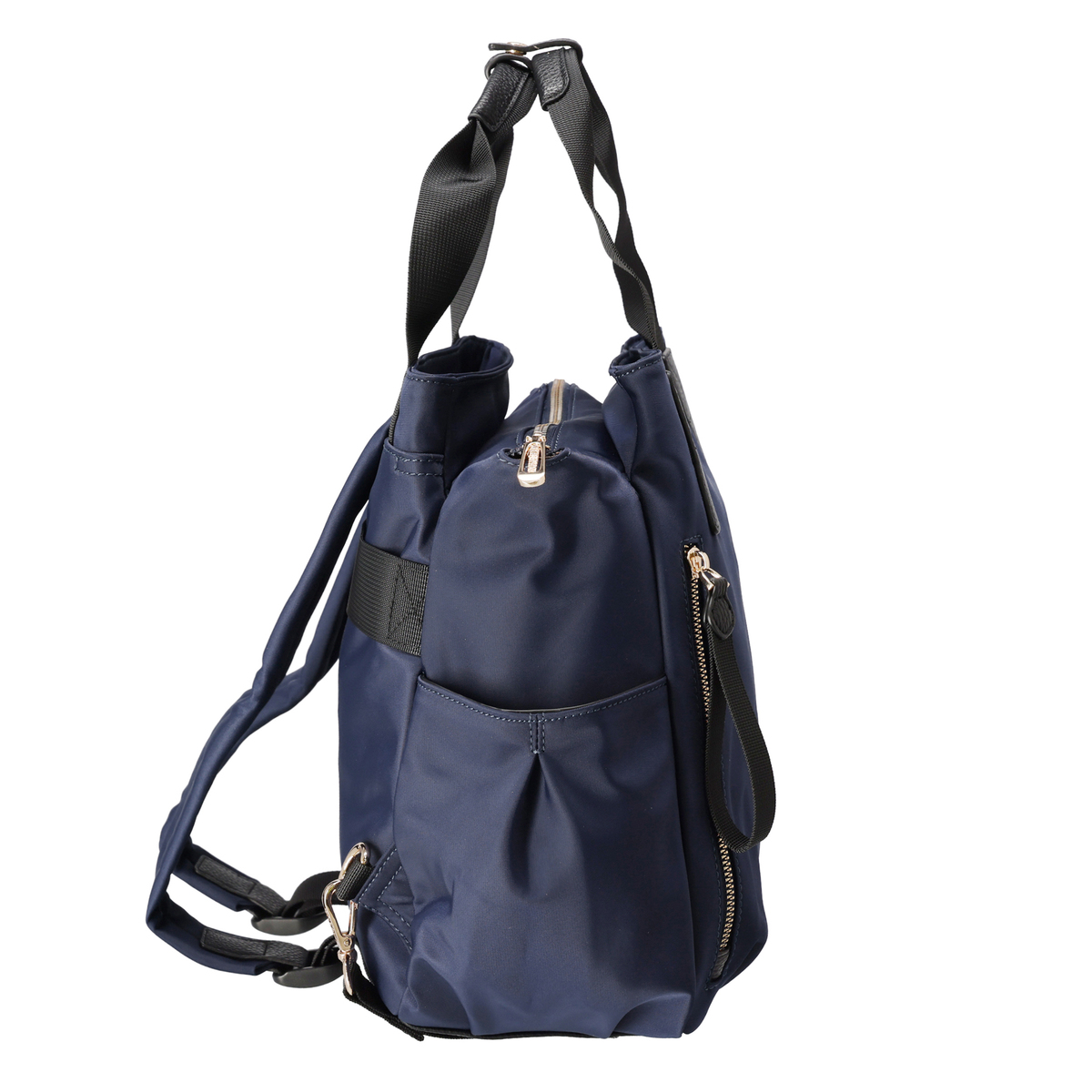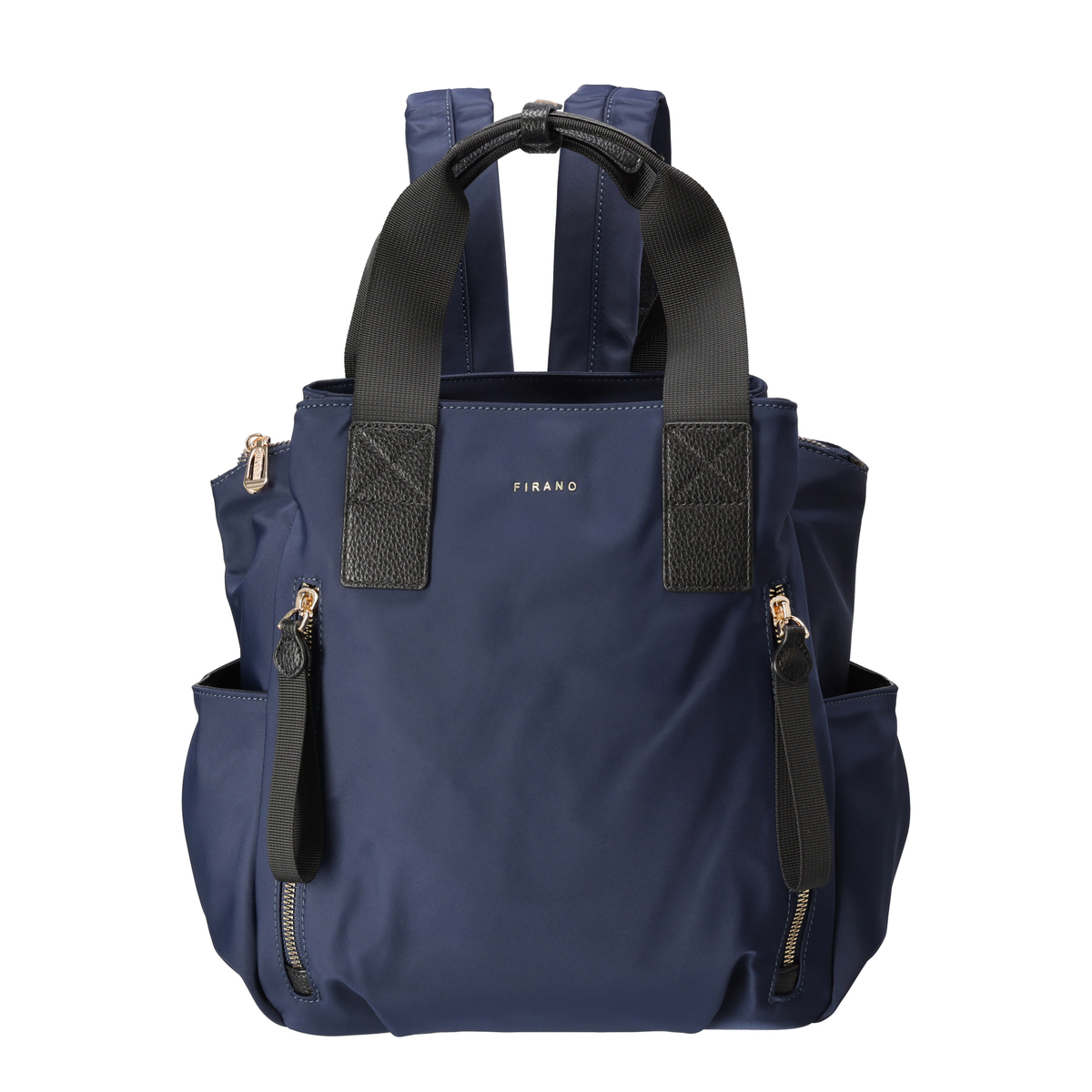 撥水ナイロンと合成皮革を表地にコンビ使いした、上品な印象のリュックです。前後のポケットと中央のファスナー収納で荷物を整理しやすく、ベルトハンドル付きでハンドバッグとしても使用可能。通勤や休日のお出かけにもおすすめです