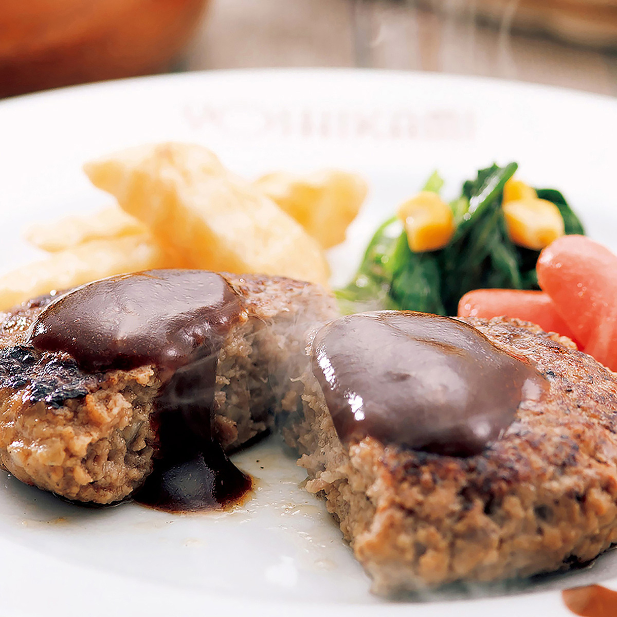 肉は大小の差が出ないよう重量を合わせて手詰め。こだわりのデミグラスソースで仕上げた味が人気の一品です