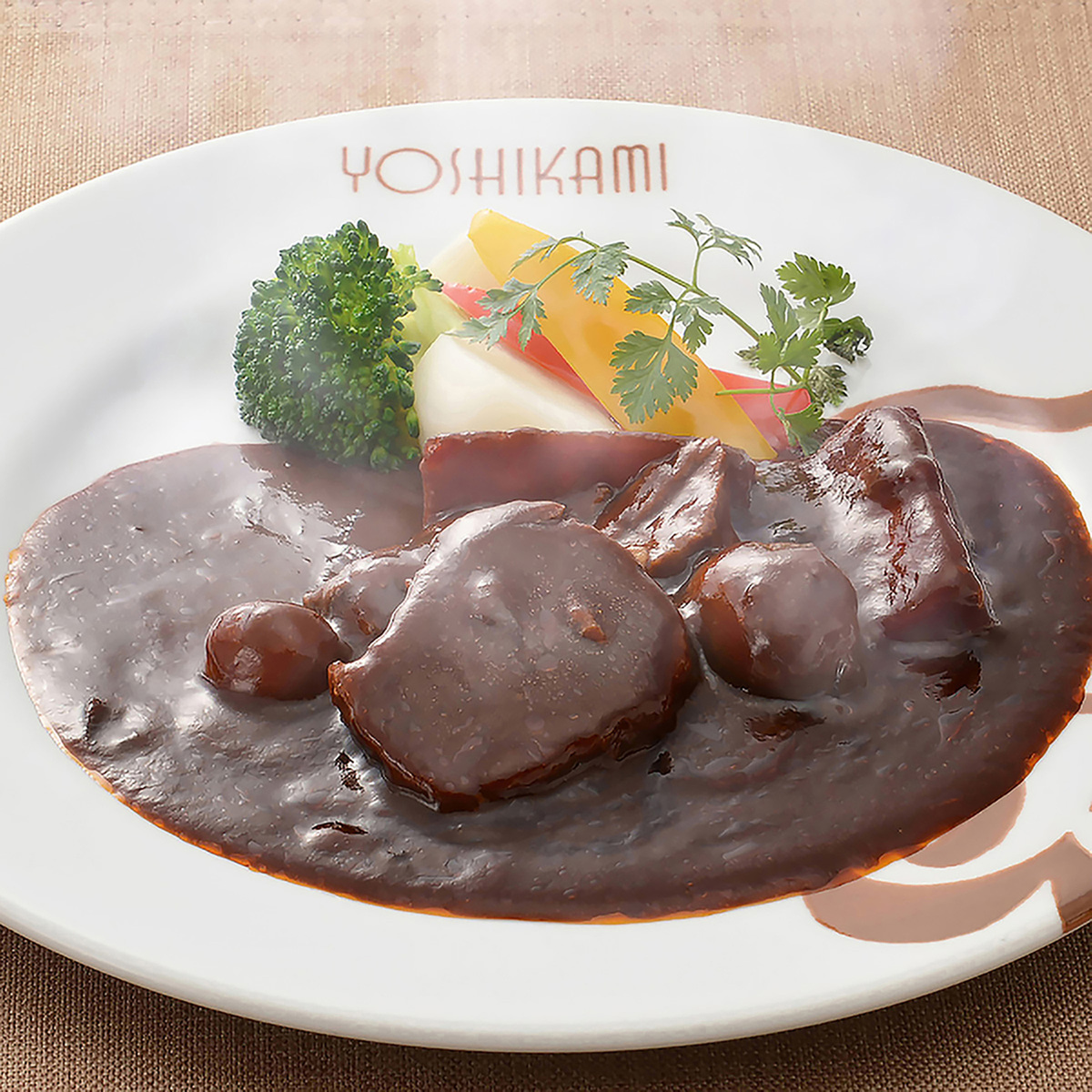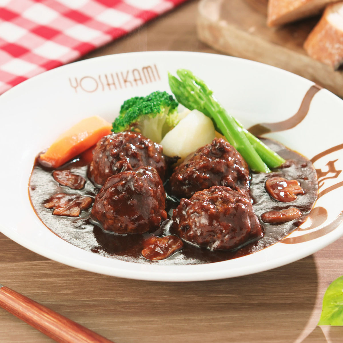 牛肉と豚肉を合わせた大ぶりなミートボールとデミグラスソース、マッシュルームを合わせました。ボリュームのあるシチューです
