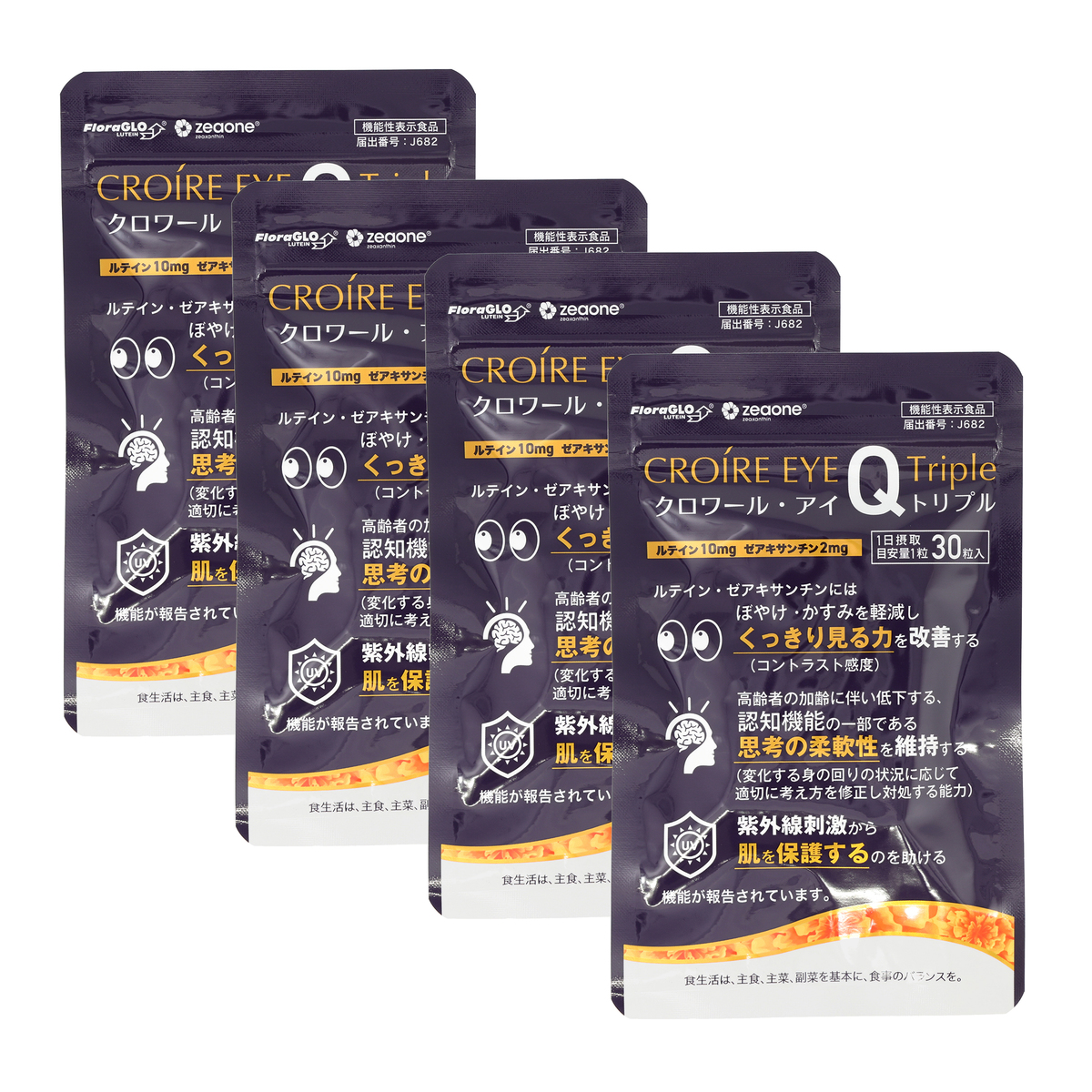 大人世代のくっきり、はっきり、クリアな毎日に。クロワールアイ・Qプラスからバージョンアップした「クロワール・アイQトリプル」です。機能性関与成分ルテイン10mg、ゼアキサンチン2mg(1日摂取目安量1粒(510mg))が含まれる機能性表示食品。配合しているのは、ケミン社のFloraGLOルテインとZeaoneゼアキサンチンで、ともにフリー体です(*1)
