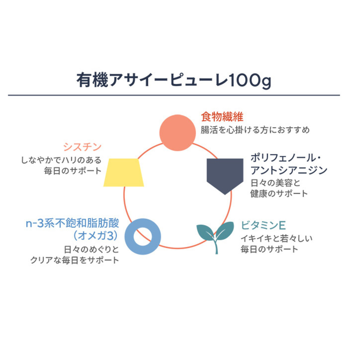 有機のアサイーを使い、酸化防止剤は不使用。1袋(100g)約77Kcalです(*4)