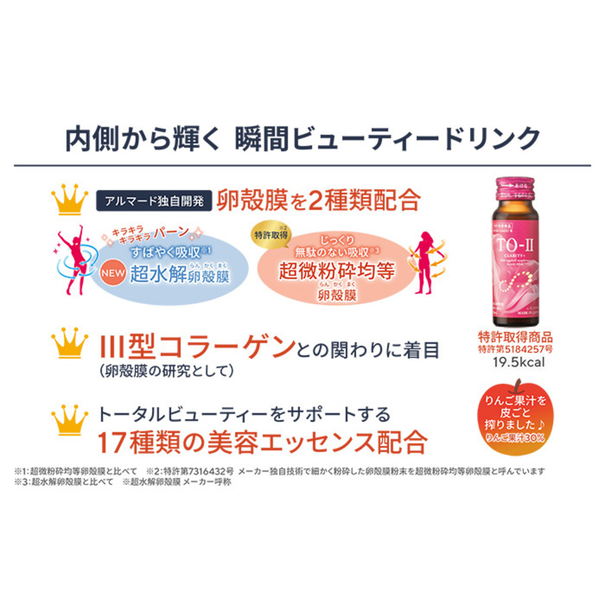 配合量が10%アップ!2種類の卵殻膜(超水解卵殻膜粉末、超微粉砕均等の卵殻膜粉末*1)を配合。リンゴ果汁をたっぷりを使用した美容ドリンクです。超微粉砕均等卵殻膜*1、卵白カラザ粉末、ナツメエキス末(ナツメ抽出物)を配合。卵殻膜粉末を含有する飲料として特許取得しています(特許第5184257号)。さらに独自開発した超微粉砕均等卵殻膜*1は、製造方法に関する特許を取得しています(第7316432号)