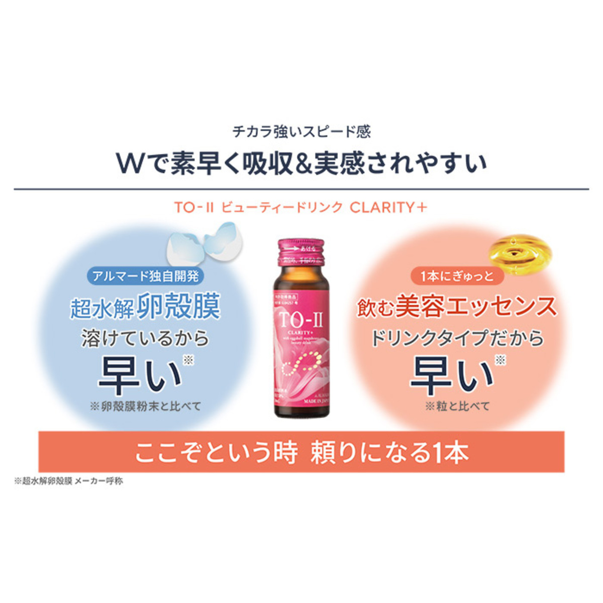 [アレルギー物質特定原材料8品目] 卵、えび、かに [商品内容] TOーII ビューティードリンク CLARITY+ (50ml×10本)×5 [目安量] 1日〜3日に1本 [お召し上がり方] 1日〜3日に1本を目安にお飲みください [栄養成分表示 1本(50ml)あたり] エネルギー19.5kcal たんぱく質0.45g 脂質0g 炭水化物4.6g 食塩相当量0.05g [保存方法] 直射日光、高温・多湿を避けて保存して下さい [注意事項] ※本製品の底部に卵殻膜粉末が沈殿しております。よく振ってお飲みください ※食物アレルギーのある方は原材料名をご参照の上お飲みください ※開栓時はキャップで手を切らないようにお気をつけください ※開栓後はすぐにお飲みください ※お体に合わない場合は飲む量を控えるか、飲用を中止してください ※加熱、冷凍はしないでください [原料原産地] りんご果汁(ニュージーランド製造) [原産国] 日本 [原材料] りんご果汁(ニュージーランド製造)、フラクトオリゴ糖、水解卵殻膜粉末、玄米黒酢、鶏胸肉抽出物(アンセリン・カルノシン15%含有)、フィッシュコラーゲンペプチド、卵殻膜粉末、N-アセチルグルコサミン、ナツメ抽出物、キダチアロエ抽出物、鶏軟骨エキス、プロテオグリカン含有サケ鼻軟骨抽出物、卵白カラザ粉末、ローヤルゼリー、 アセロラ粉末、トウモロコシ胚芽抽出粉末/トレハロース、乳酸、香料、V.C、安定剤(大豆多糖類)、ユッカ抽出物、ヒアルロン酸、甘味料(スクラロース、ステビア)、クエン酸鉄Na、V.B2、V.E、貝Ca、(一部にえび・かに・卵・さけ・大豆・鶏肉・りんご・ゼラチンを含む)