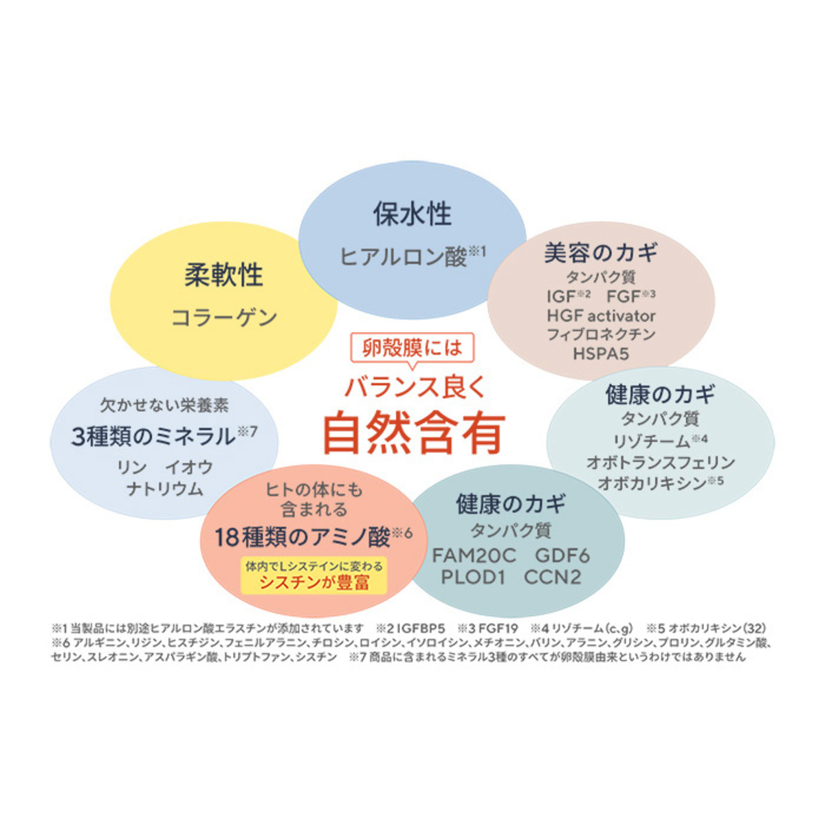 卵殻膜の中には18種類のアミノ酸*2、コラーゲン、ヒアルロン酸が含有*3。フィブロネクチン、HSPA5、リゾチーム(c、g)、HGFactivator、FAM20C、オボトランスフェリン、GDF6、CCN2、FGF19、IGFBP5、オボカリキシン(32)、PLOD1も含んでいます*4。さらにアセロラパウダー(アセロラ粉末)、ローヤルゼリー、セラミド含有とうもろこし胚芽抽出物、プロテオグリカン含有サケ鼻軟骨抽出物などの成分をバランスよく配合しています