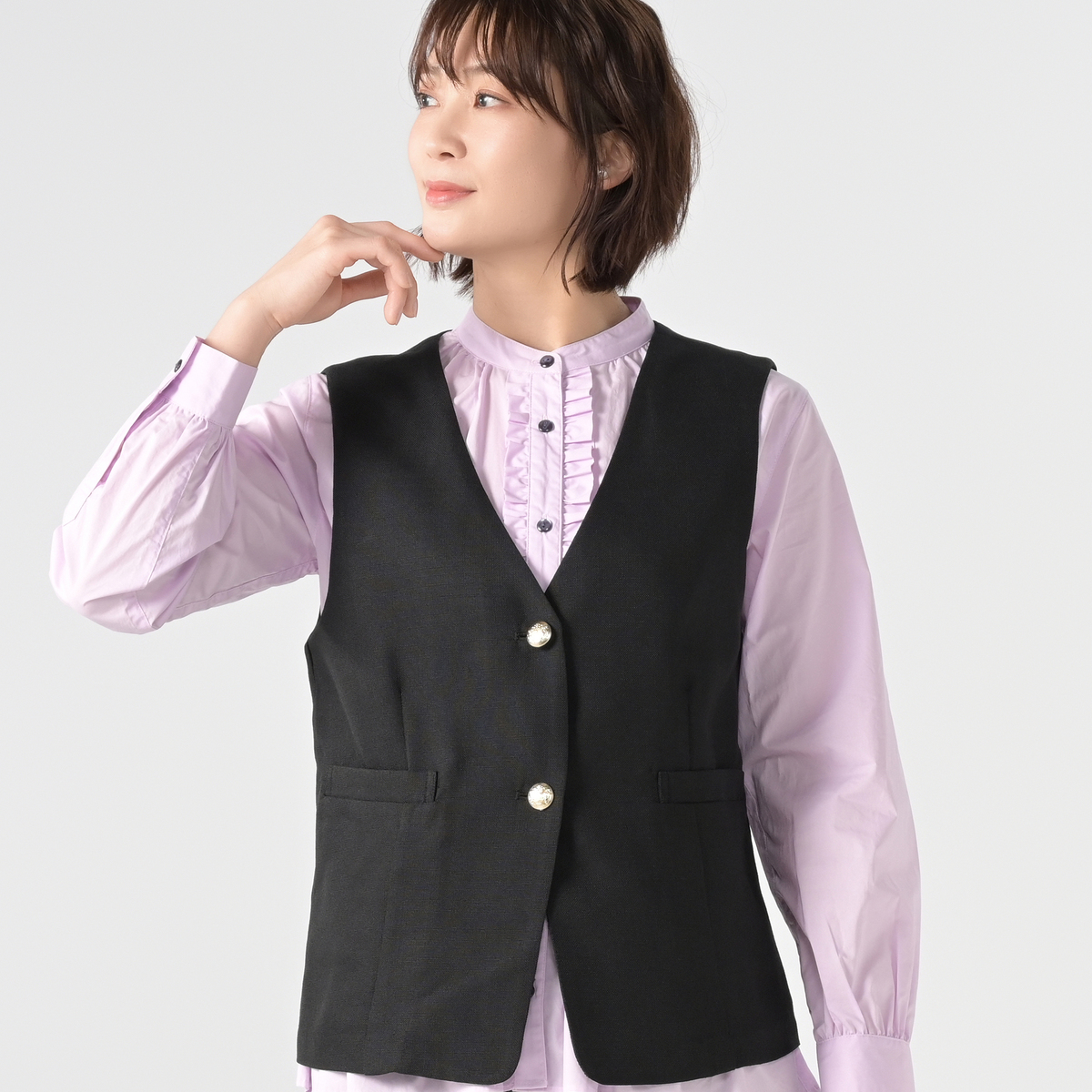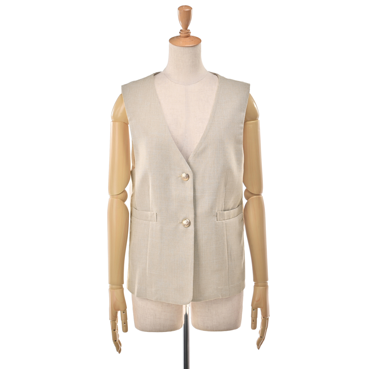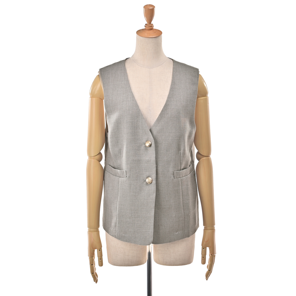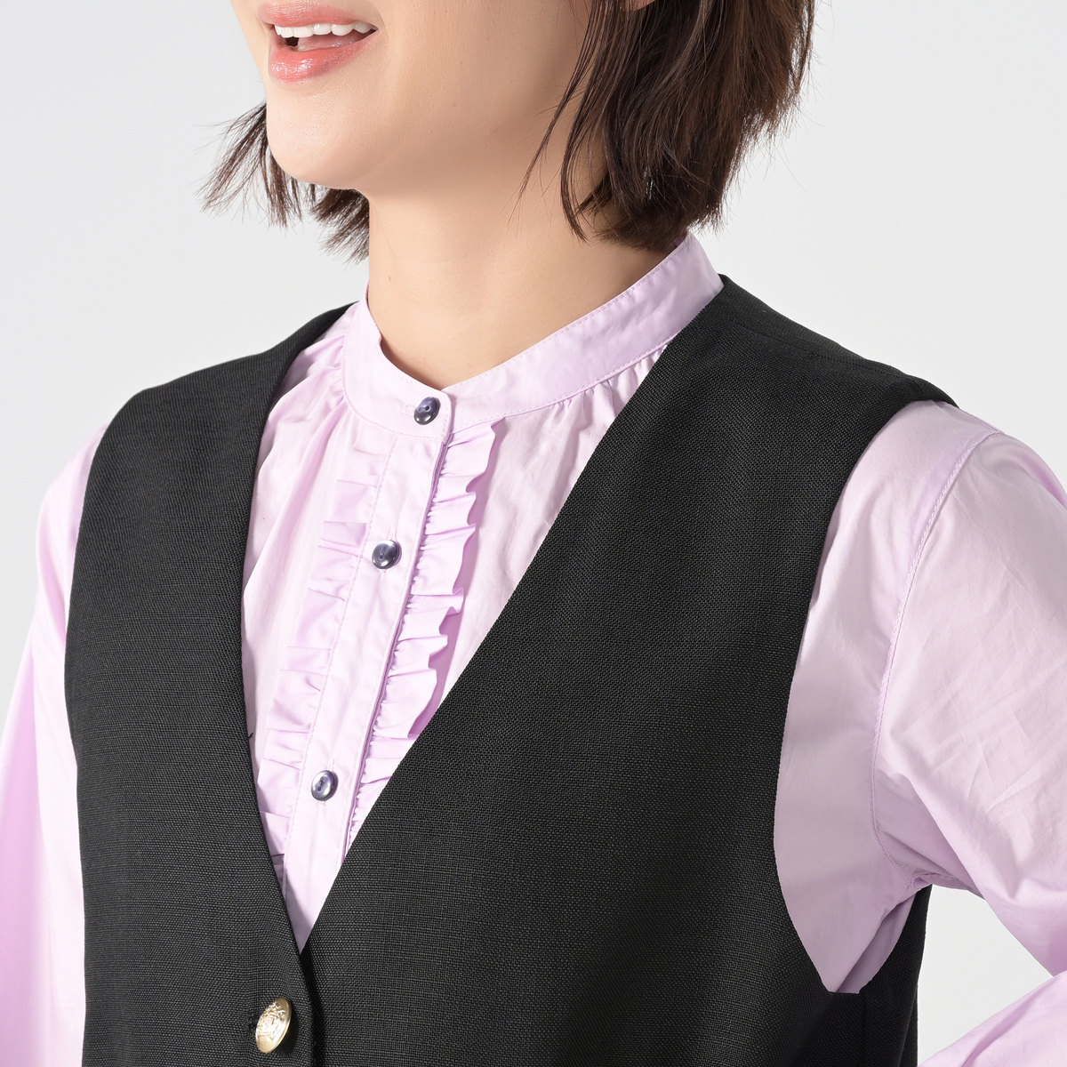 すっきりとしたVネックデザインのジレ。きれいめにもカジュアルにも合わせやすく、スタイリングにプラスするだけで程良く抜け感のある大人コーデに。薄ゴールド色の柄入りボタンが上品なアクセントになっています