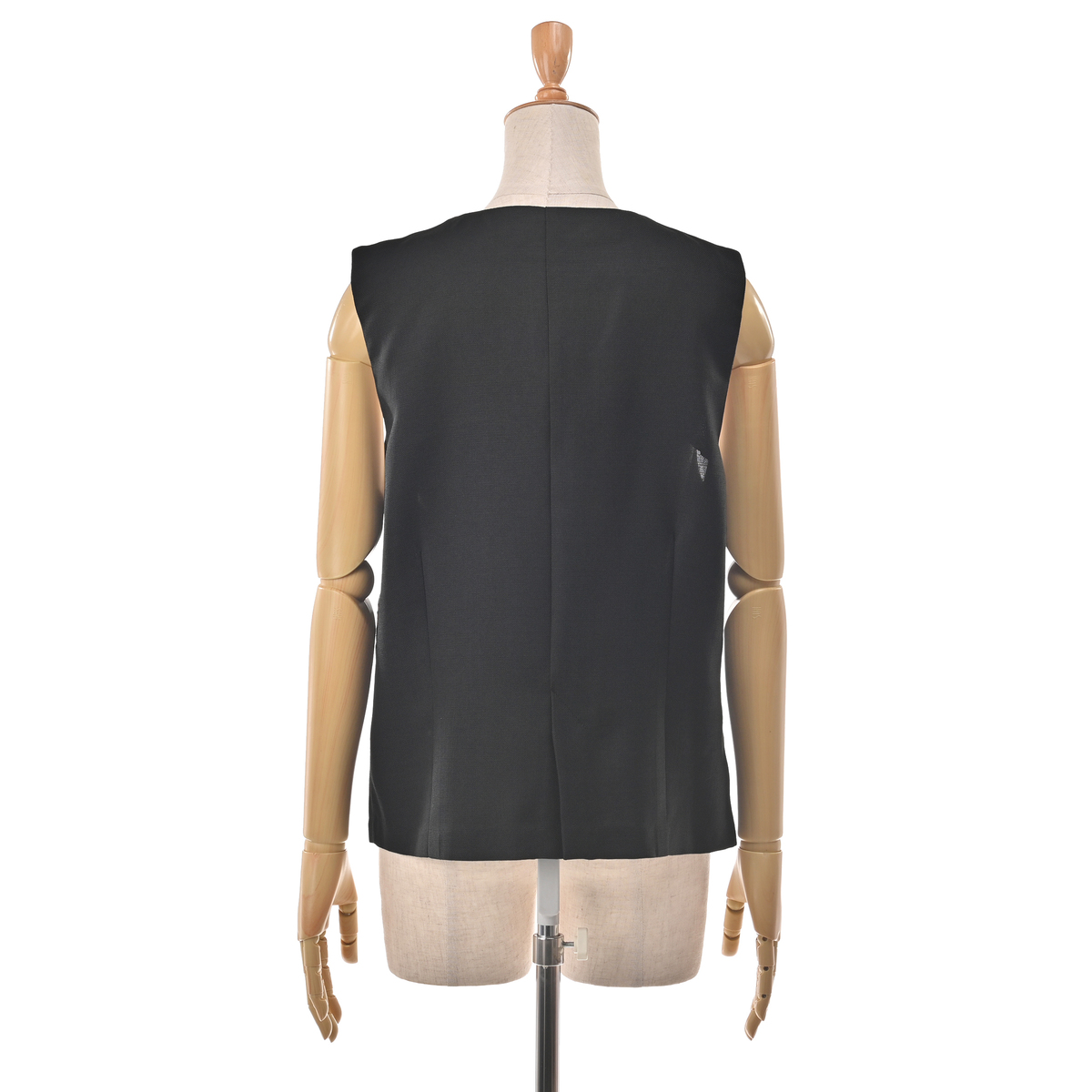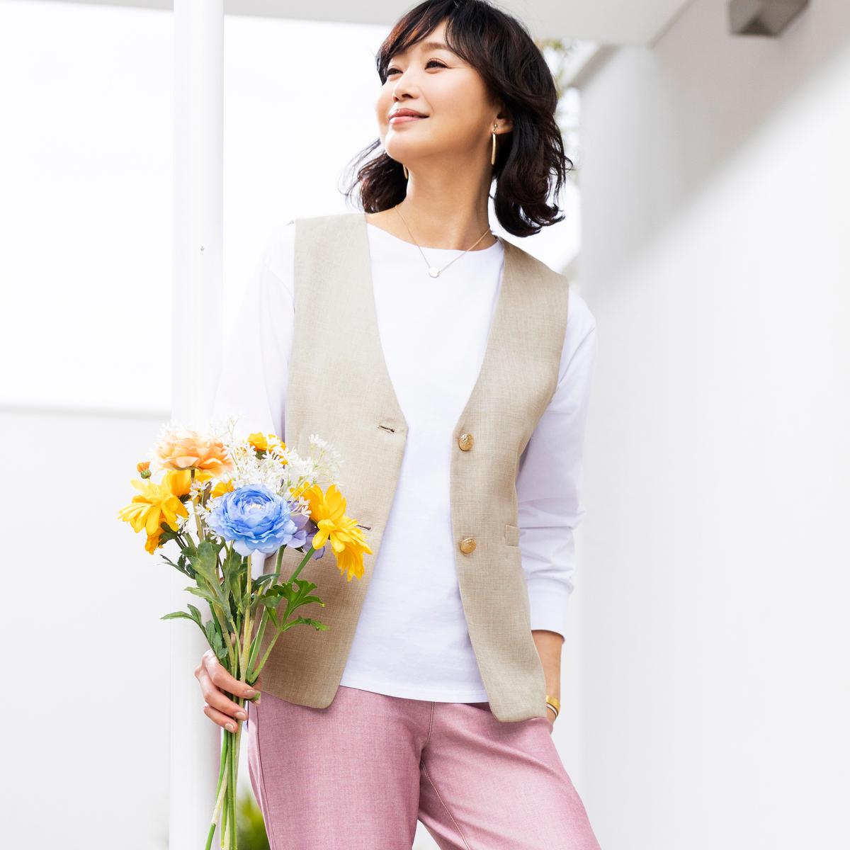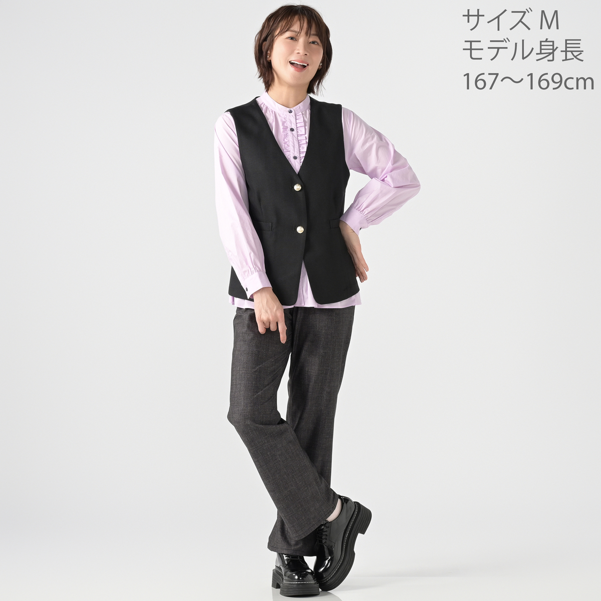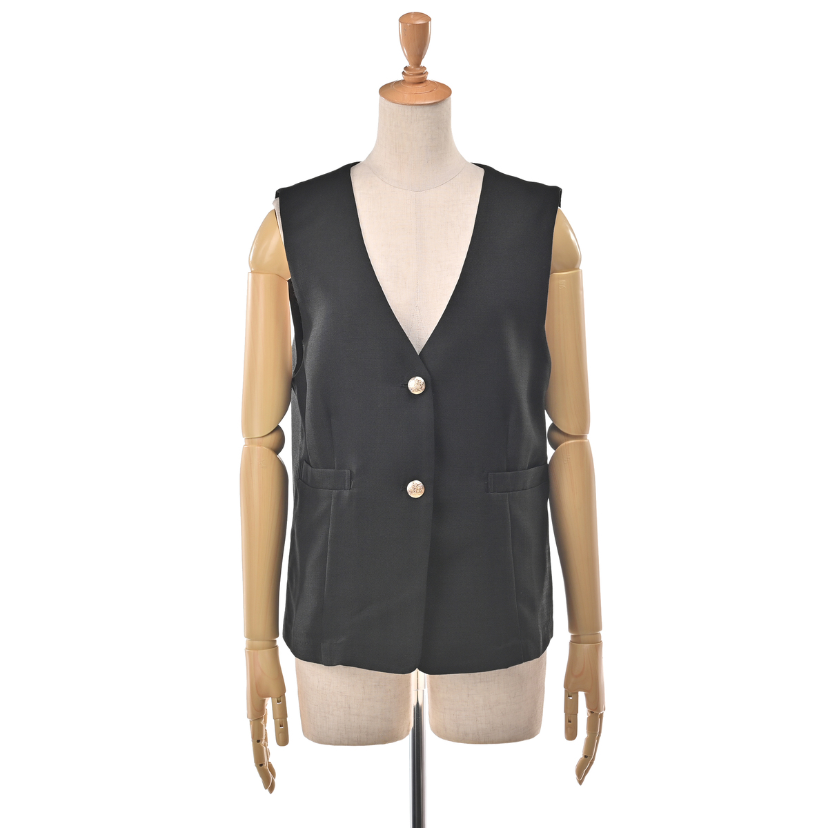 すっきりとしたVネックデザインのジレ。きれいめにもカジュアルにも合わせやすく、スタイリングにプラスするだけで程良く抜け感のある大人コーデに。薄ゴールド色の柄入りボタンが上品なアクセントになっています