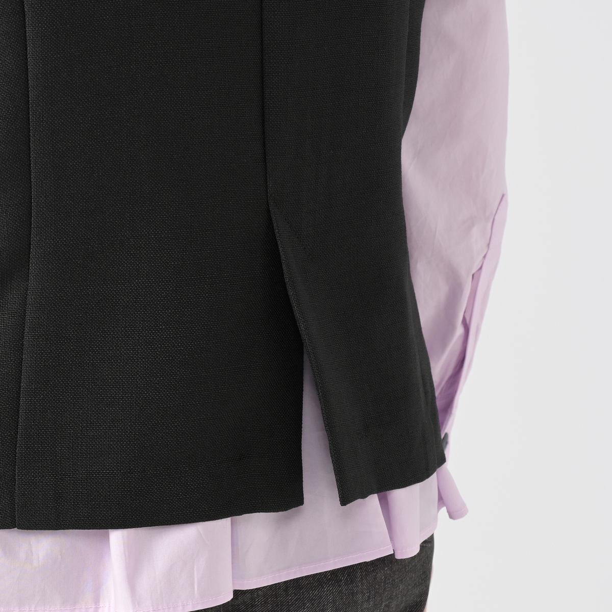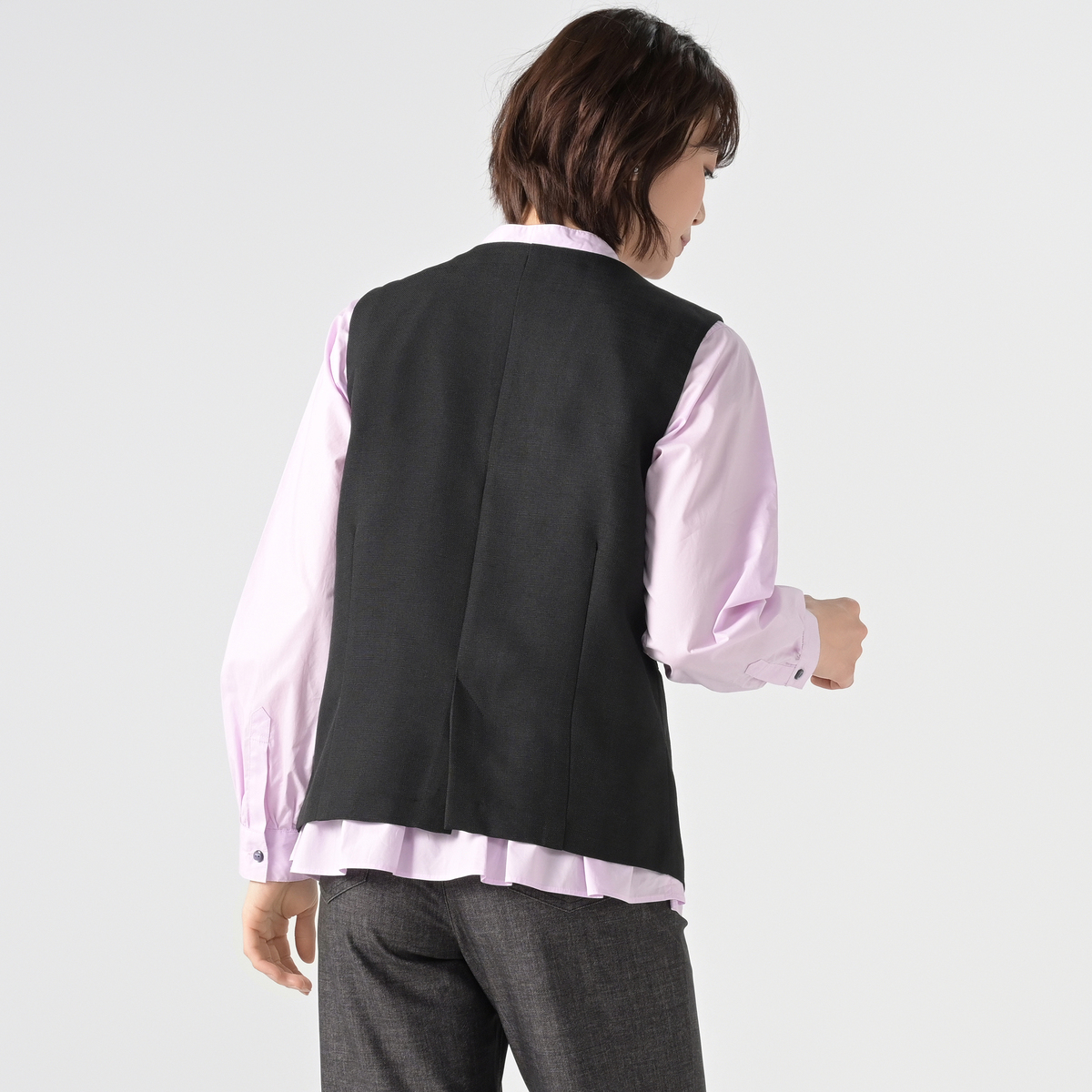 ナチュラルな表情を持つリネン調の布帛素材を使用。グレーとベージュは杢調見えで深みのある色合い、ブラックは使いやすい単色となっています。サラッとした風合いの背裏付きで、着心地の良い仕様です