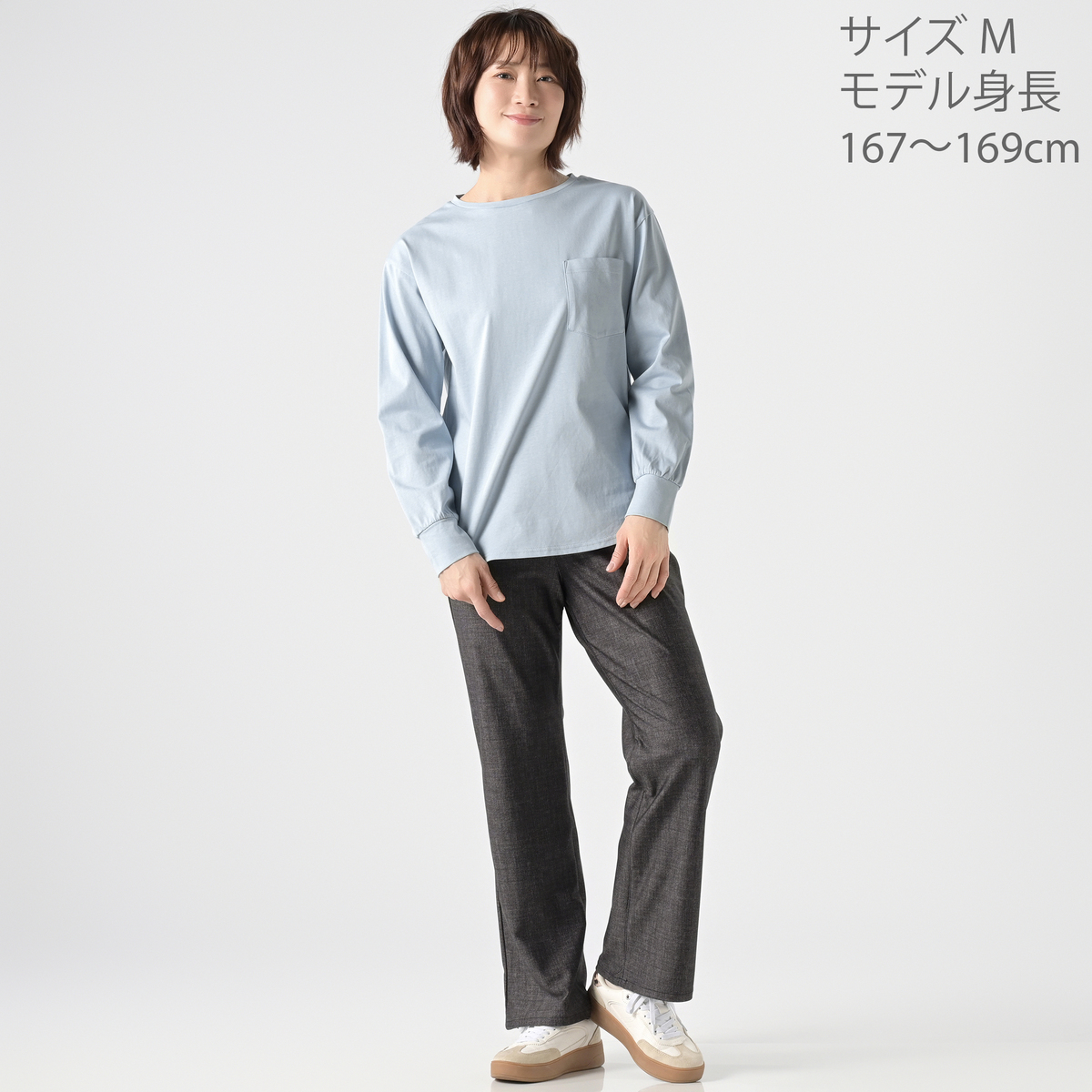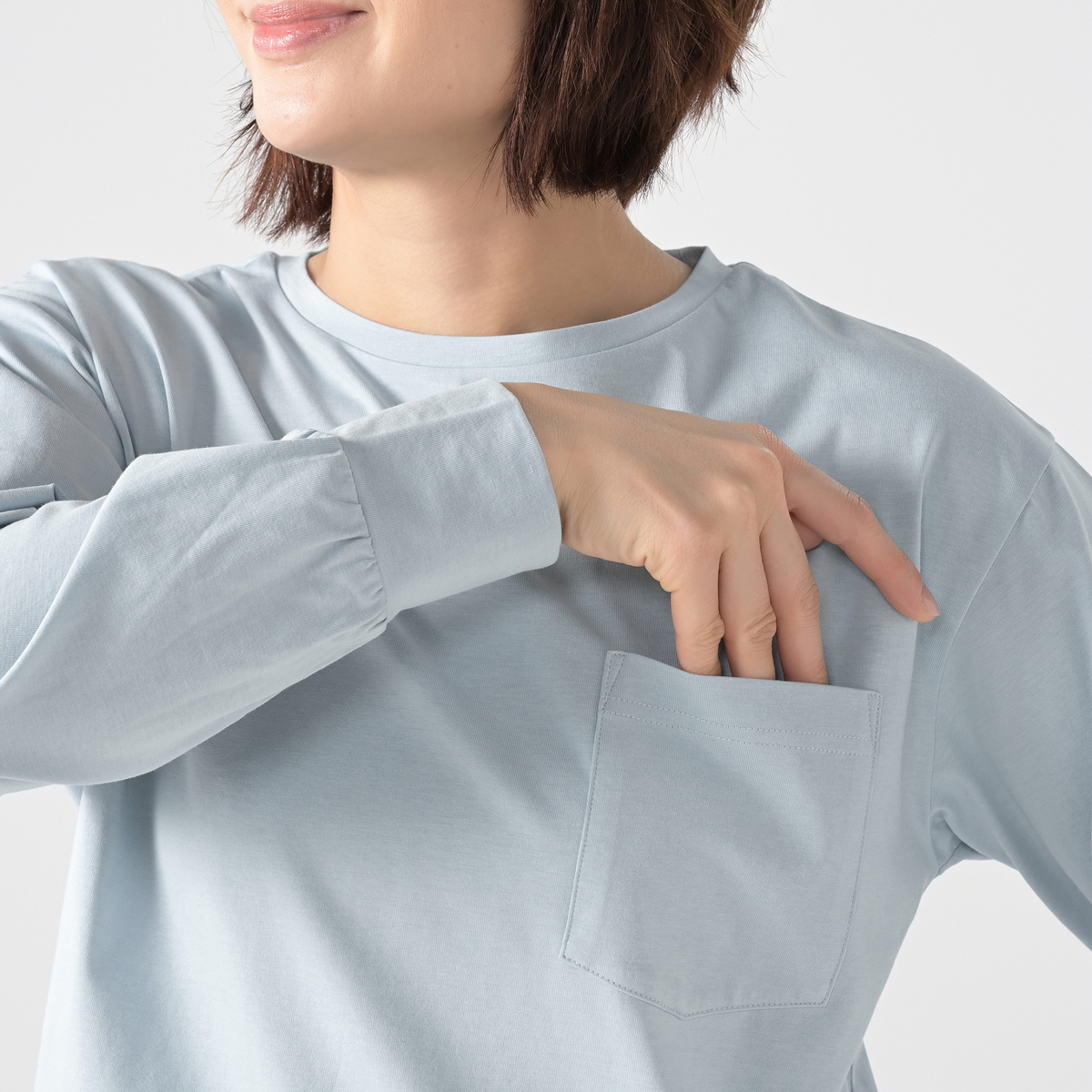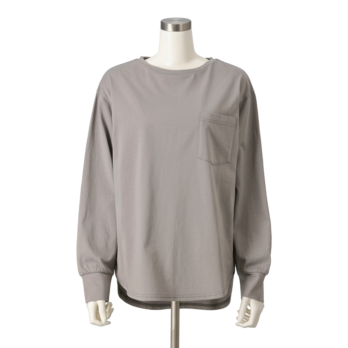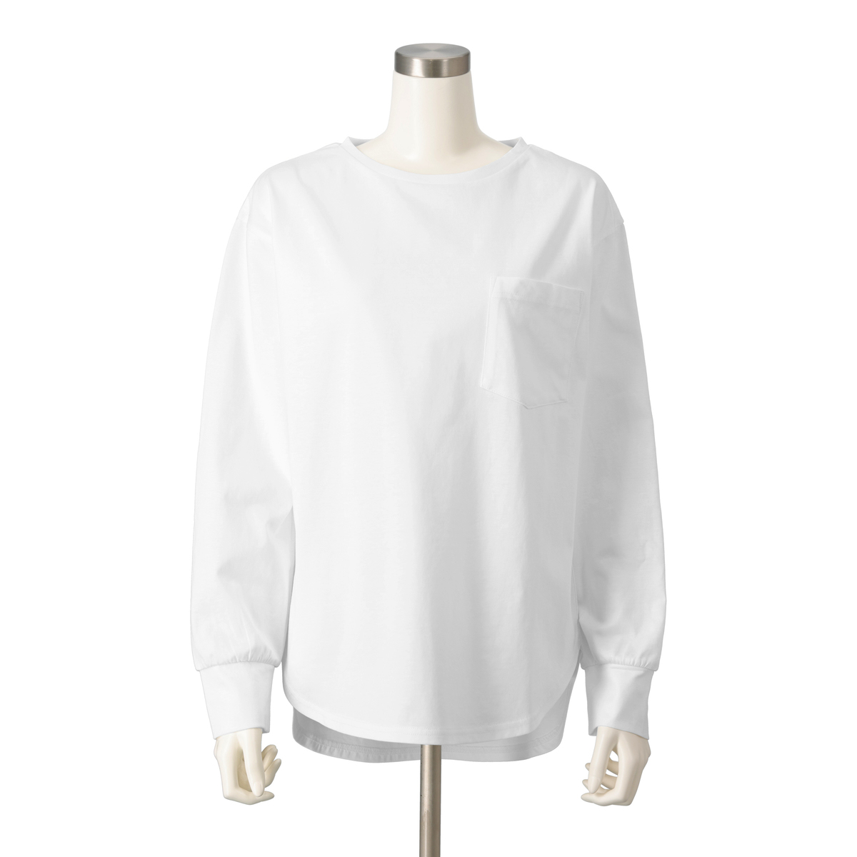 ドロップショルダーでほどよく抜けて見えるブラウスTシャツ。大きめの胸ポケットが程よくハンサムな印象を添え、袖口のカフス切替やラウンドヘムがやわらかな雰囲気を引き立てます。やや長めの着丈でお腹やヒップを自然にカバーし、1枚でもジャケットのインでも組合せやすいです