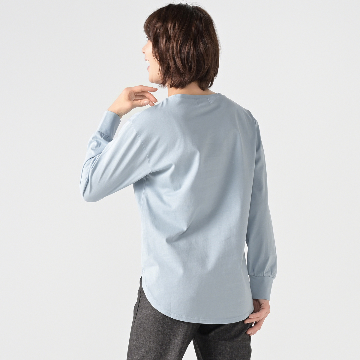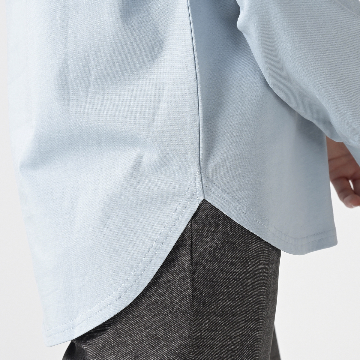 程よい光沢が上品な綿100%の天竺素材を使用。ソフトな風合いで肌触りが良く、カジュアルにもきれいめにもなじみます。シルケット加工で毛羽立ちが少なく、ほどよいハリが端正な印象に。ご家庭で洗える扱いやすさも魅力です
